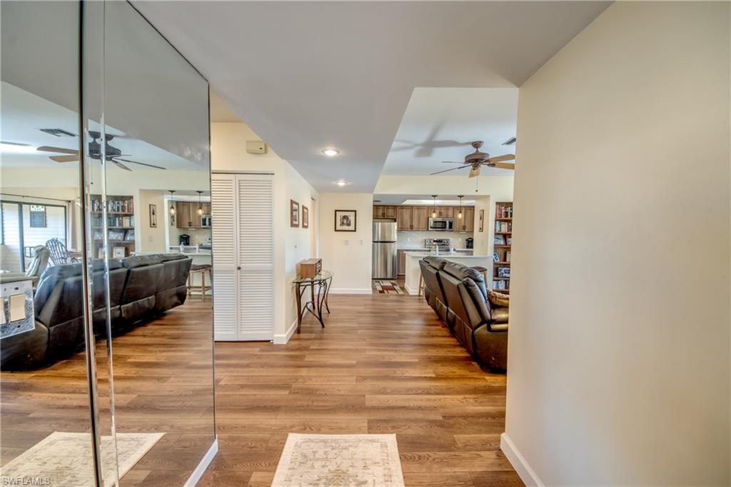 Imagine your perfect Florida getaway, nestled in a quiet, beautifully landscaped community centered around a lush tropical courtyard, a relaxing heated pool, and an inviting cabana gathering space. Just 1.5 miles from the white sand beaches and turquoise waters of the Gulf of Mexico, this meticulously maintained condo offers the ideal blend of serenity, location, and style. Situated on the elevated second floor in one of the most desirable locations within the community, the unit boasts a prime southern exposure with unobstructed views of the courtyard from a spacious private lanai. Inside, you’ll find over $50,000 in thoughtful upgrades and a bright, open living space filled with natural light and colorful tropical views. The condo is being sold fully furnished and turnkey, featuring lightly used, high-quality furnishings. The extensively remodeled kitchen and bathrooms (2022) showcase modern finishes, complemented by rigid core luxury vinyl flooring throughout. Additional updates include a new air condenser (2020), all new double pane windows (2025), new refrigerator, oven, and microwave, removal of popcorn ceilings, and fresh interior paint. The flexible floor plan offers two large bedrooms plus a den, perfect for a home office or additional guest space. Thoughtful amenities include a spacious primary closet and full-size laundry room. A highly coveted covered carport near the unit entrance is included, a rare bonus with only 24 carports available among the 64 units in the complex. Located west of Highway 41, Shore Woods is ideally positioned close to the beach, top-rated restaurants, and fresh local seafood. Community financials are strong, reserves are well funded, and recent improvements include replaced and securely anchored roofs. As a Collier County resident, owners also enjoy free parking passes at Collier County beach access points. Opportunities like this are rare — nearly flawless, move-in ready condos in prime locations don’t come along often. This is one of those moments. Add it to your must-see list, you won’t be disappointed.