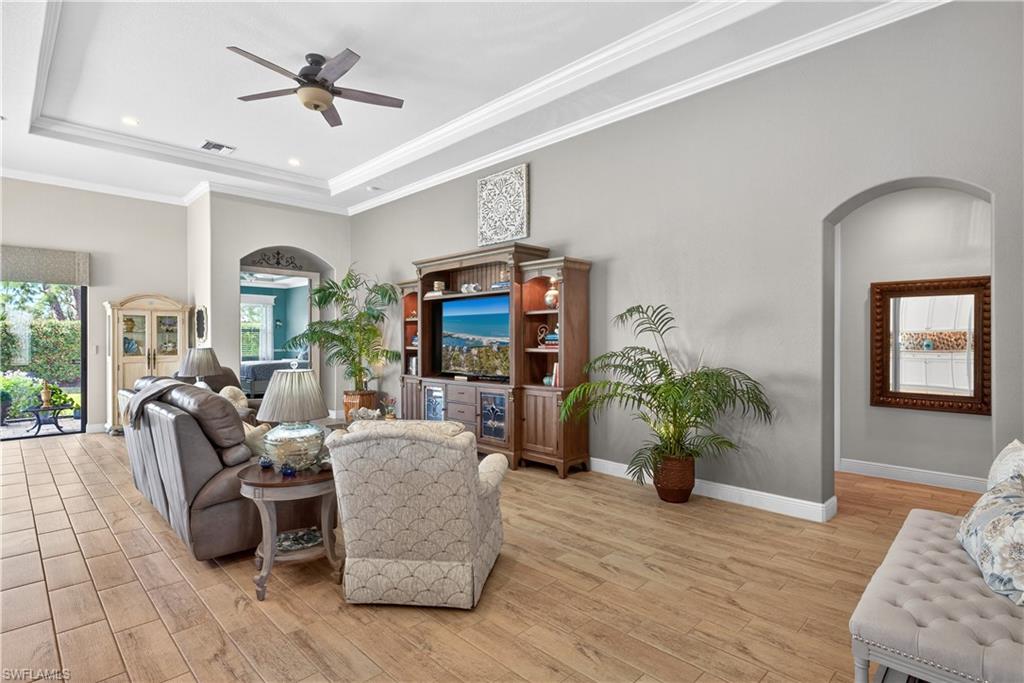 Spacious, private, and extensively upgraded... Nothing in this home is standard! Premium cabinetry and designer fixtures throughout this "Athena" model—featuring 3 bedrooms plus a den, 3 full baths, and a 3-car garage—a combination that delivers both luxury and everyday functionality. Positioned toward the back of the community, the home enjoys minimal pass-by traffic and reduced road noise, creating a quiet, residential setting that feels removed yet convenient. Inside, the layout is open and welcoming, highlighted by recessed tray ceilings, refined millwork, crown molding, and premium wood-look tile flooring that flows seamlessly through the main living areas and owner’s suite. The gourmet kitchen is designed to both impress and perform, featuring upgraded cabinetry with glass accent inserts, under- and over-cabinet lighting, pull-out shelving, imported glass tile backsplash, a walk-in pantry with custom wood shelving, premium KitchenAid appliances, and designer fixtures. The pantry with custom shelving and a dedicated coffee and beverage bar with wine cooler enhances the adjacent gathering area, making entertaining effortless. The owner’s suite is generously proportioned and thoughtfully appointed, offering dual vanities with separate counters, a walk-in shower, and a walk-in soaking tub—creating a true retreat. Two additional bedrooms, each with a full bathroom, provide outstanding comfort and privacy for family or guests. A versatile den offers flexible space for a home office, media room, or additional living area. An oversized laundry room with extra cabinetry, laundry tub, and newer washer/dryer adds everyday convenience. Outdoors, the private screened lanai captures western exposure, delivering beautiful evening sunsets and tranquil landscaped views—ideal for unwinding or entertaining at the end of the day. Located within the gated community of Bonita Lakes, residents enjoy access to a clubhouse, fitness center, resort-style pool and spa with lake views, tennis and bocce courts, and a children’s play area. Just minutes from Gulf beaches, RSW International Airport, shopping, dining, medical facilities, and top conveniences. With its functional layout, pristine condition and quiet location, this home stands apart. Check out the floor plan in the interactive virtual tour and schedule your private showing today!
