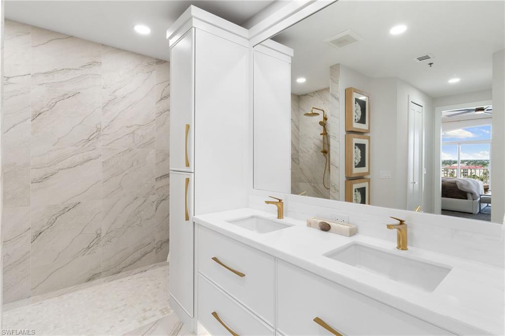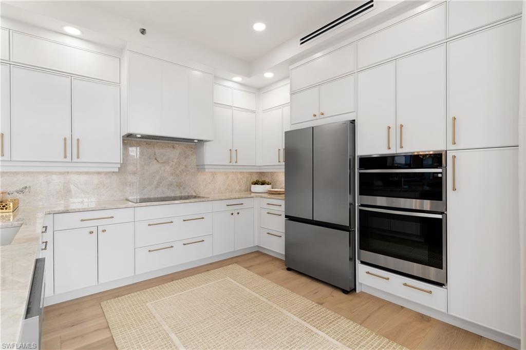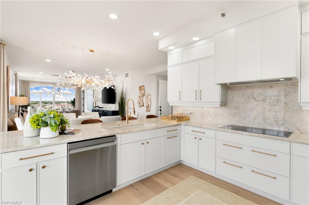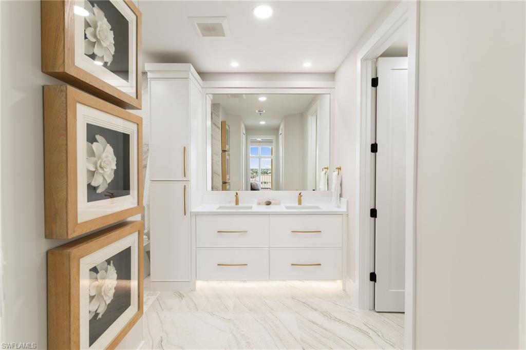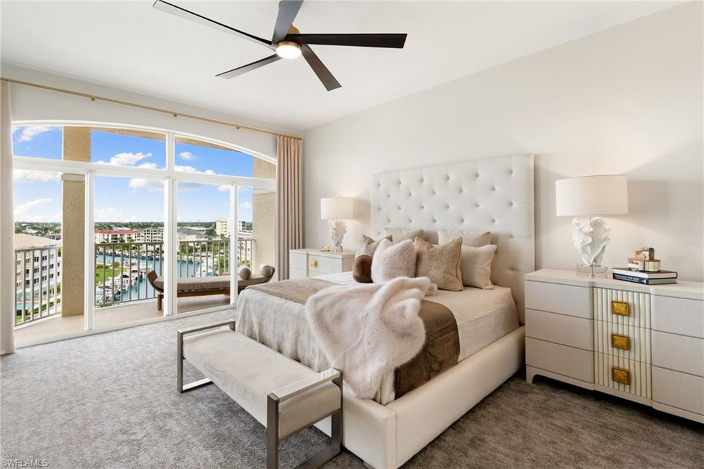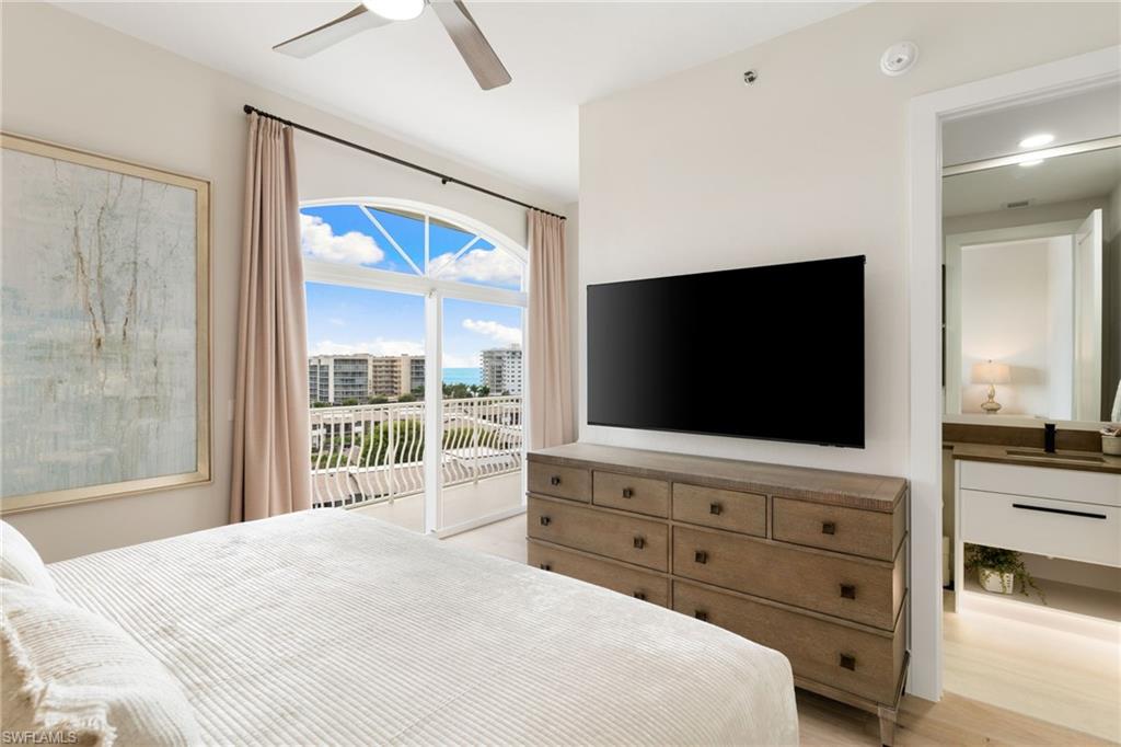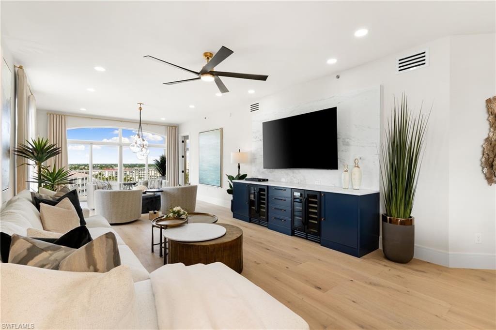 The moment the private elevator opens into this penthouse, it’s immediately clear this residence is extraordinary. PH-1 has been fully re-envisioned from top to bottom and is offered turnkey, fully furnished in a sophisticated, timeless aesthetic—serene, intentional, and quietly luxurious. Professionally designed and furnished by LivingStyles Interiors & Design, Marco Island, every detail reflects thoughtful craftsmanship. Custom white oak flooring flows throughout the main living areas and guest bedrooms, while the primary suite is finished with tailored carpeting, creating a retreat-like atmosphere. Expansive walls of glass fill the home with natural light and open to a wraparound balcony with breathtaking Gulf views and near-360-degree vistas of Marco Island. Soaring 10-foot ceilings and elegant 8-foot doorways amplify the sense of space, light, and refined architectural detail, while every room offers stunning island views. The kitchen balances beauty and function, with handcrafted cabinetry throughout, an oversized island with leather bar seating, and a custom built-in bar with dual wine refrigerators, creating an effortless flow for entertaining. The penthouse offers three generously sized bedrooms, including two king suites and a guest room with two queen beds, and three and a half baths. The primary bath features porcelain tile flooring and a custom rain shower with ADA-friendly thresholds. The powder bath showcases an inlaid marble mosaic wall and sculptural soapstone sink. Additional features include solid wood carpentry, automatic hurricane shutters, all-new HVAC ductwork and unit, a new water heater, and a private one-car garage. Residents enjoy a heated pool, clubhouse with fitness center, and boat slips available for lease. This penthouse is more than a home—it’s an experience. Every detail, from the expansive ceilings to the soaring doorways, invites you to linger, entertain, and unwind in unparalleled comfort. Step inside and discover a home where every room captures stunning island views, elegance meets ease, and the beauty of Marco Island becomes part of your everyday life—a rare opportunity to embrace the elevated island lifestyle you’ve been dreaming of.