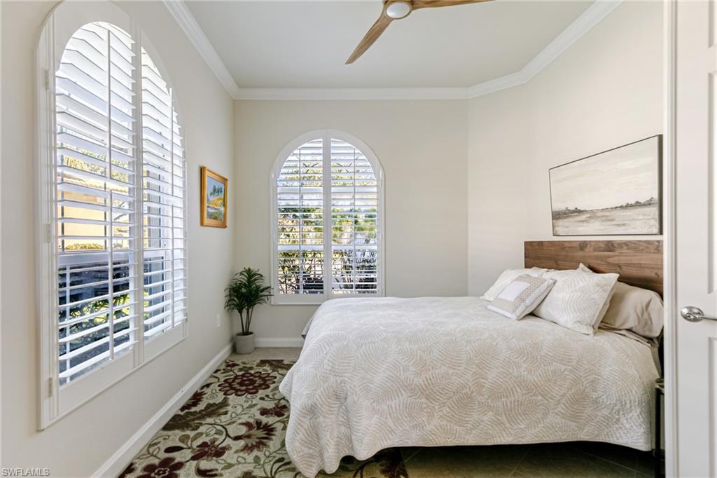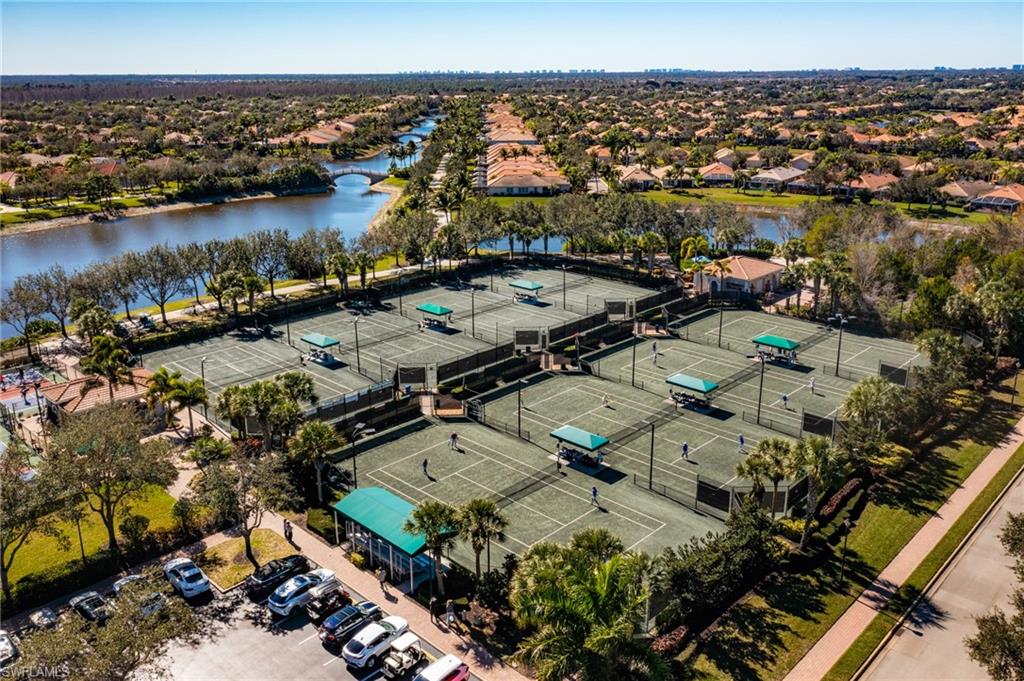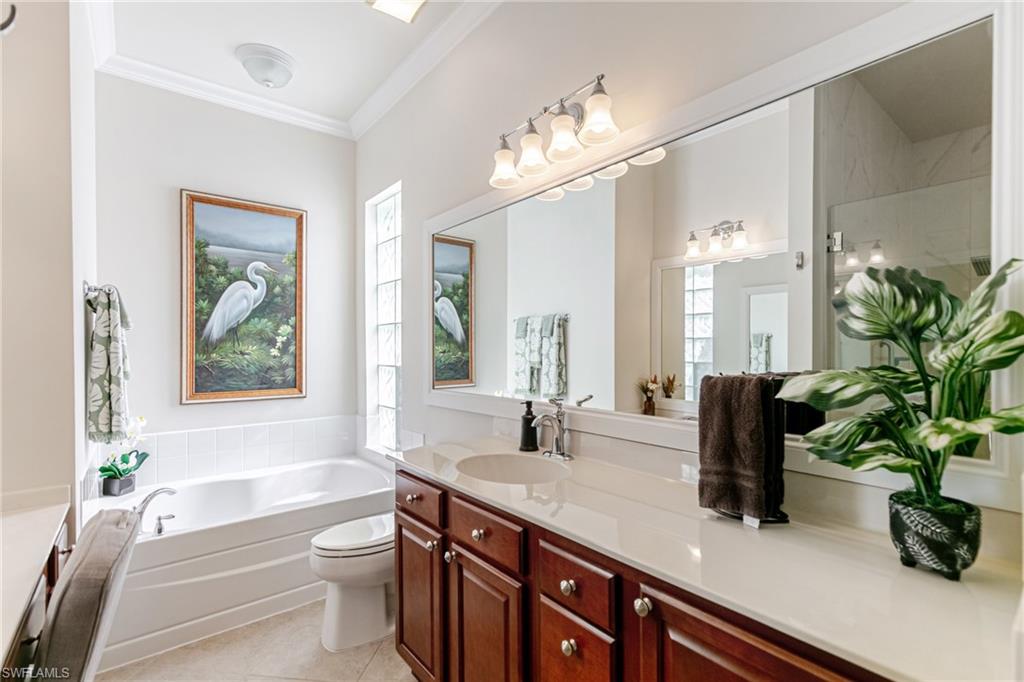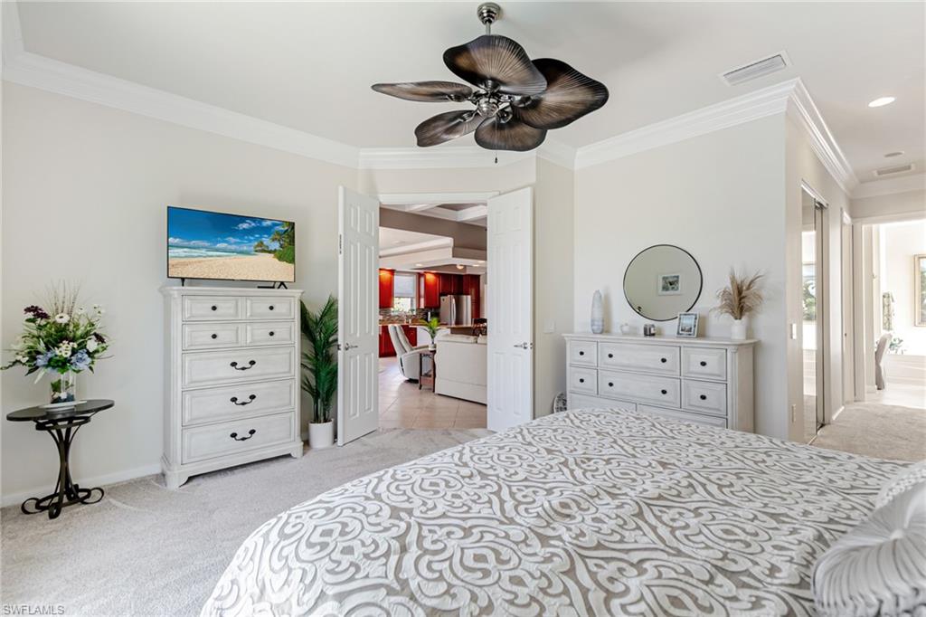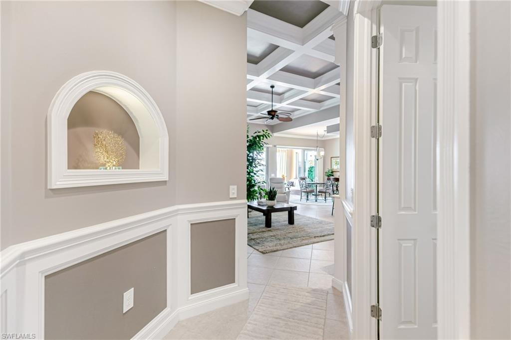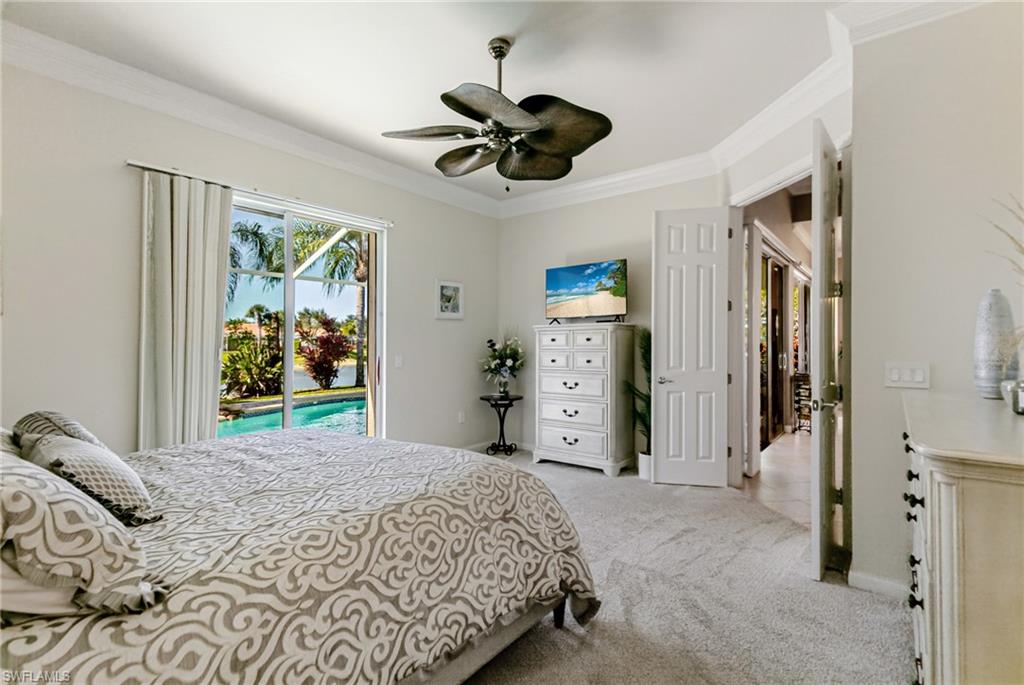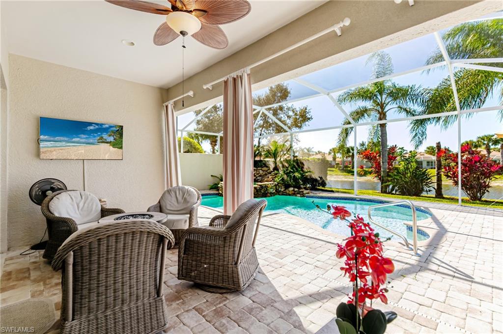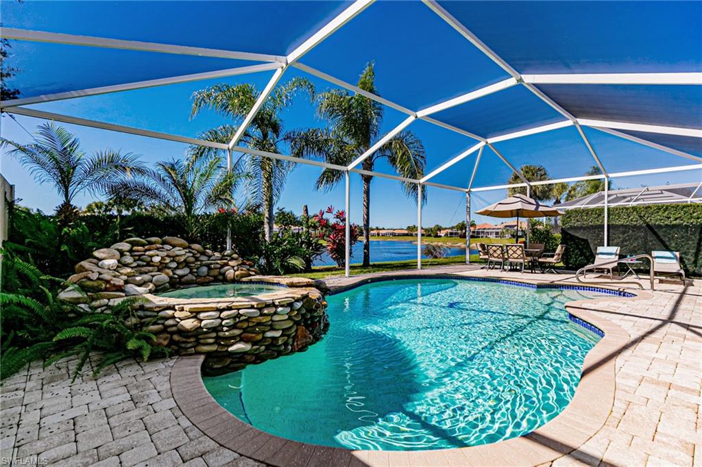 Beautifully maintained Divosta-built lakefront home located in the highly desirable Village Walk at Bonita Springs. This residence offers over 2,000 square feet of living space with three bedrooms plus an enclosed den (3.5 bedrooms) and two full bathrooms, set on a wide lot with southwest lake exposure. The open-concept floor plan features custom millwork, coffered ceilings, granite countertops, wood cabinetry, and stainless steel appliances, creating an inviting space for both everyday living and entertaining. The primary suite includes dual vanities, a soaking tub, a renovated walk-in shower, and private sliding glass doors leading to the lanai. Outdoor living is enhanced by a custom solar- and electric-heated pool and rock waterfall spa, overlooking tranquil lake views. The large screened lanai offers both covered and open areas for outdoor dining and relaxation. Additional features include storm shutters throughout and 2024 AC. Village Walk is a gated community with a centrally located Town Center offering on-site dining, resort-style and lap pools, a fitness center, tennis and pickleball courts, post office, hair salon, community gas station, and miles of walking paths and bridges. Conveniently located near I-75, with easy access to shopping, dining, beaches, North Naples, and Southwest Florida International Airport.