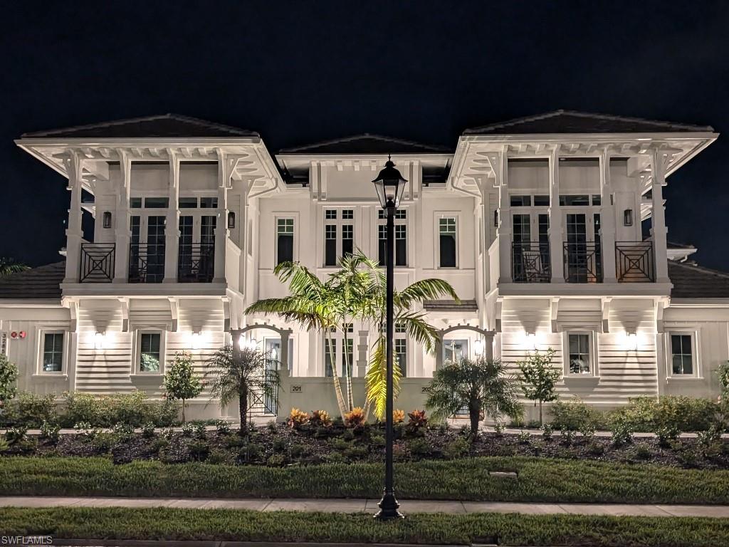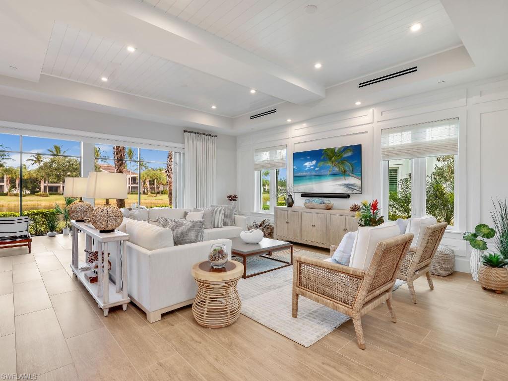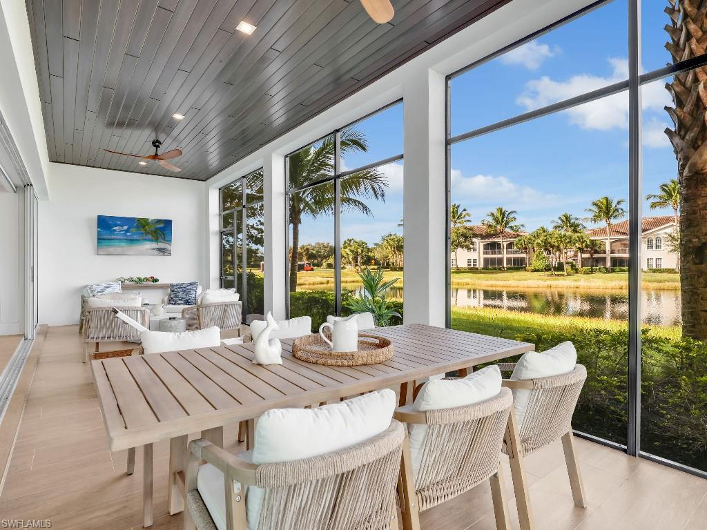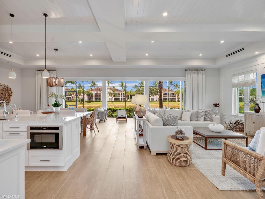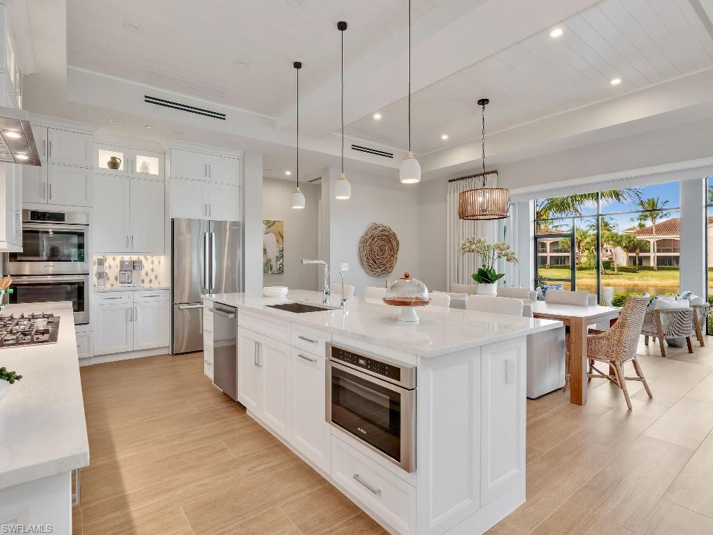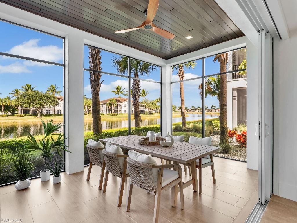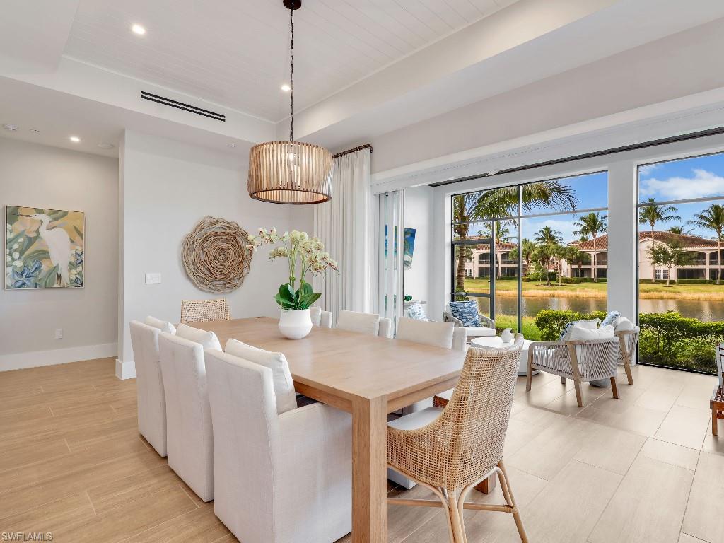 Luxurious coach home in the exceptional Dorado community at Fiddler's Creek with coastal contemporary architecture built in 2024 by Gulf Bay Homes and designed by MHK. This 2,600-square-foot ground floor Palmetto unit offers three bedrooms, three-and-a-half baths, custom office/den, and spacious two-car garage. The main living area blends sophistication and comfort and includes an expansive great room with shiplap and coffered ceiling accents opening with two 12' wide center opening sliders to the screened lanai for covered outdoor living with matching flooring, tray ceiling with wood plank, ceiling fans, and recessed LED lighting, all overlooking tranquil lake views. Stylish wood-look ceramic tile that combines the beauty of wood with the easy maintenance of ceramic tile throughout the main living areas, 8' solid core doors, 8” base molding, whole-house Sonos sound system, and numerous smart home features. The large chef's kitchen boasts 42" upper kitchen cabinets with glass-front uppers, in-cabinet and under-cabinet lighting, quartz counters, glass-tile backsplash, and an oversized island. A full complement of Bosch stainless appliances includes a French-door refrigerator with freezer drawer, drawer microwave, natural gas cooktop with hood vent, double wall oven with convection, and dishwasher. The owner's suite features coffered, shiplap ceilings, an oversized master bath with dual quartz vanities with makeup counter, a frameless walk-in shower with bench, and an expansive walk-in closet with custom wood shelving. Two guest bedrooms each feature ensuite baths. Several upgrades have been added to this home including a custom-built office and master closet, hand-held showers, great room feature wall, laundry room backsplash and butcher-block countertop over washer and dryer for folding, window treatments and remote-controlled electric shades. Exterior offers all-concrete construction, flat profile concrete roof tile, 2-car garage with epoxy flooring and bonus storage room, Marvin casement windows, private courtyard entry, and lush landscaping. Fiddler's Creek residents enjoy amenities that include the 54,000-square-foot Club & Spa, featuring a resort-style multi-pool complex, state-of-the-art fitness center, tennis, ten new pickleball courts, bocce, an extensive activity calendar, and casual and fine dining. Miles of sidewalks wind through the lushly landscaped community for walking, bicycling, and running.