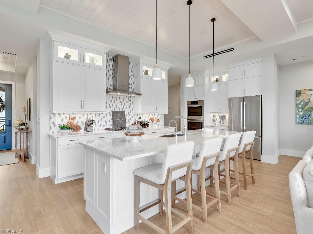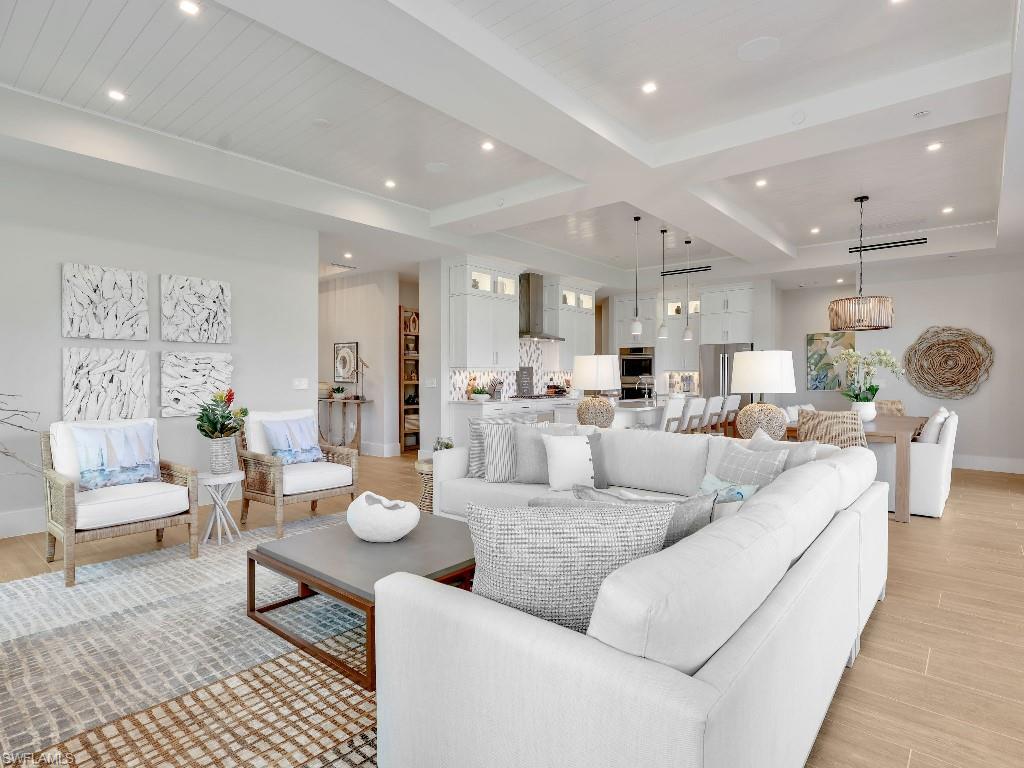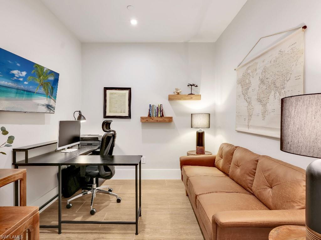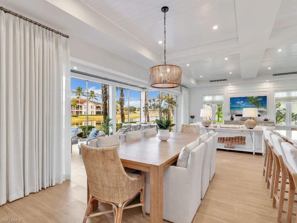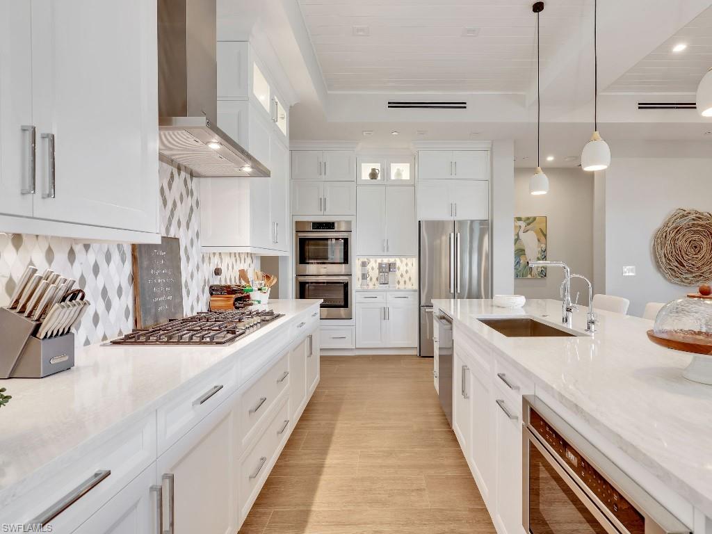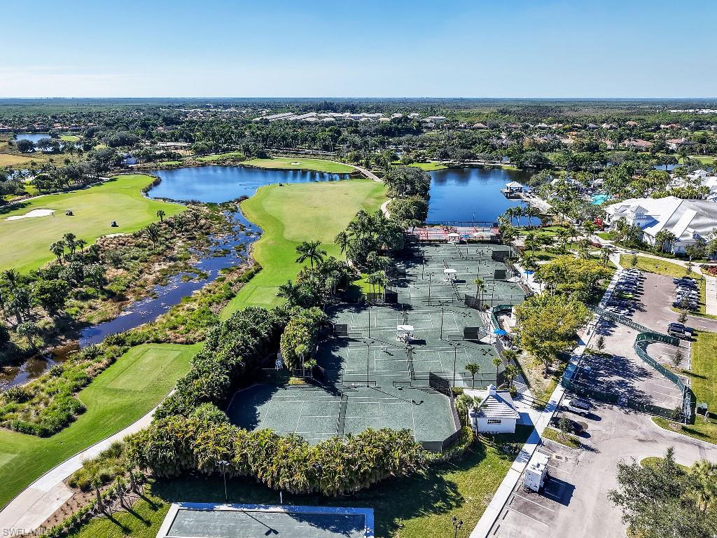Luxurious coach home in the exceptional Dorado community at Fiddler's Creek with coastal contemporary architecture built in 2024 by Gulf Bay Homes and designed by MHK. This 2,600-square-foot ground floor Palmetto unit offers three bedrooms, three-and-a-half baths, custom office/den, and spacious two-car garage. The main living area blends sophistication and comfort and includes an expansive great room with shiplap and coffered ceiling accents opening with two 12' wide center opening sliders to the screened lanai for covered outdoor living with matching flooring, tray ceiling with wood plank, ceiling fans, and recessed LED lighting, all overlooking tranquil lake views. Stylish wood-look ceramic tile that combines the beauty of wood with the easy maintenance of ceramic tile throughout the main living areas, 8' solid core doors, 8” base molding, whole-house Sonos sound system, and numerous smart home features. The large chef's kitchen boasts 42" upper kitchen cabinets with glass-front uppers, in-cabinet and under-cabinet lighting, quartz counters, glass-tile backsplash, and an oversized island. A full complement of Bosch stainless appliances includes a French-door refrigerator with freezer drawer, drawer microwave, natural gas cooktop with hood vent, double wall oven with convection, and dishwasher. The owner's suite features coffered, shiplap ceilings, an oversized master bath with dual quartz vanities with makeup counter, a frameless walk-in shower with bench, and an expansive walk-in closet with custom wood shelving. Two guest bedrooms each feature ensuite baths. Several upgrades have been added to this home including a custom-built office and master closet, hand-held showers, great room feature wall, laundry room backsplash and butcher-block countertop over washer and dryer for folding, window treatments and remote-controlled electric shades. Exterior offers all-concrete construction, flat profile concrete roof tile, 2-car garage with epoxy flooring and bonus storage room, Marvin casement windows, private courtyard entry, and lush landscaping. Fiddler's Creek residents enjoy amenities that include the 54,000-square-foot Club & Spa, featuring a resort-style multi-pool complex, state-of-the-art fitness center, tennis, ten new pickleball courts, bocce, an extensive activity calendar, and casual and fine dining. Miles of sidewalks wind through the lushly landscaped community for walking, bicycling, and running.