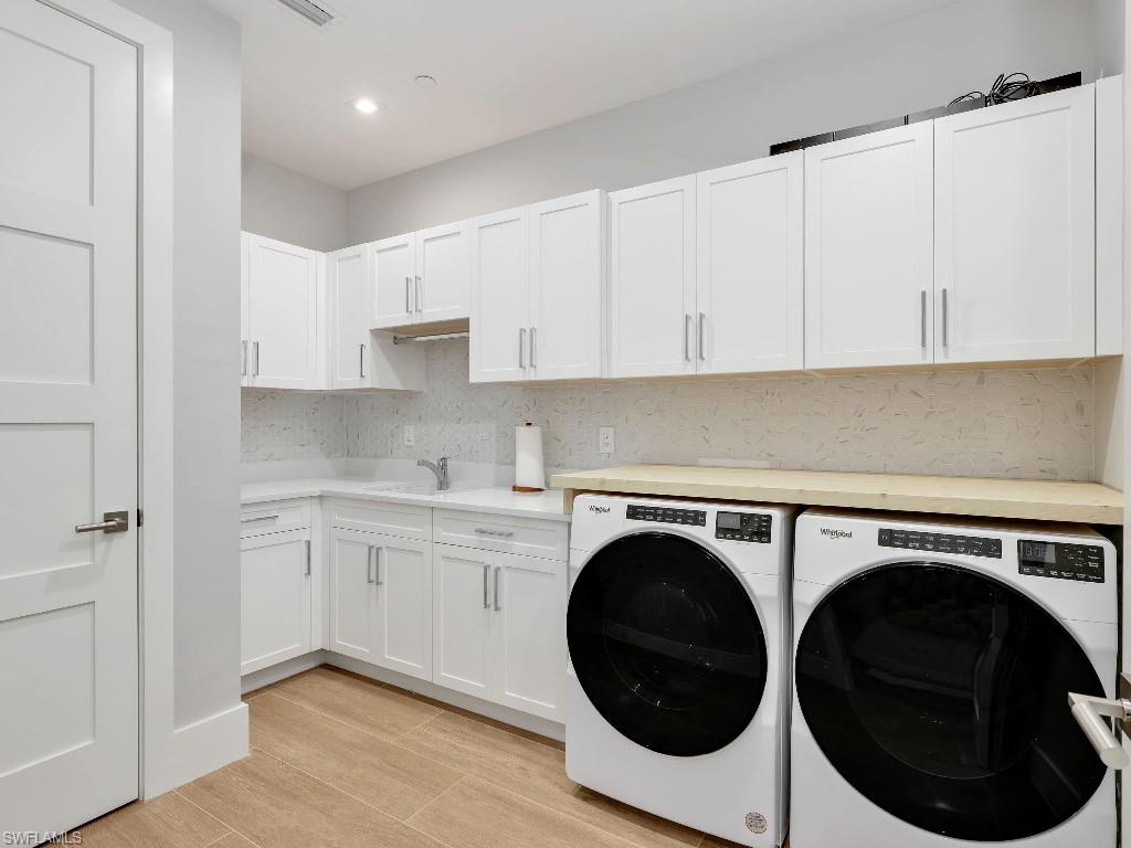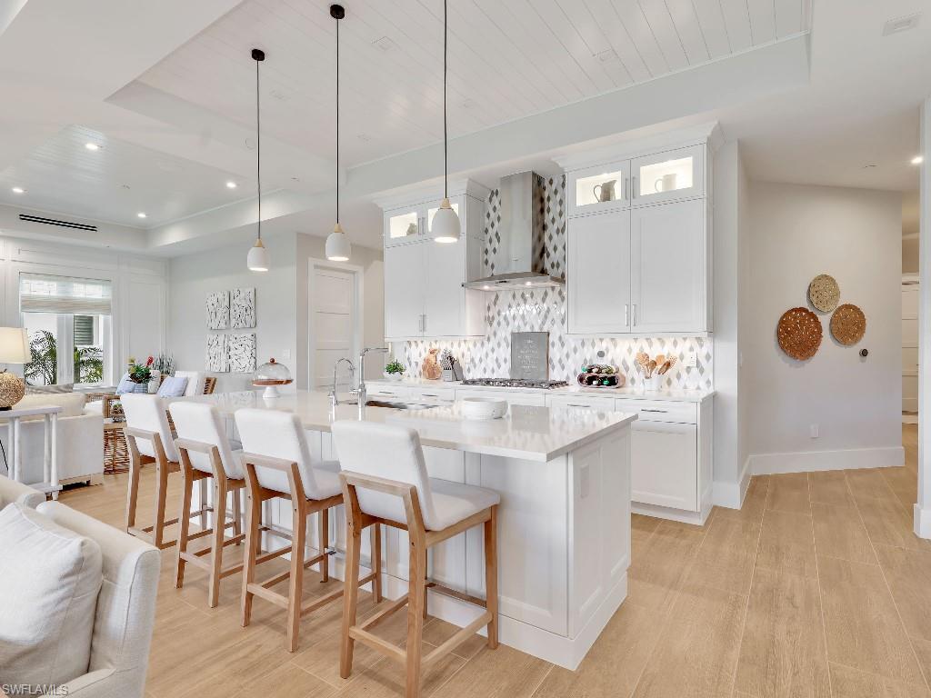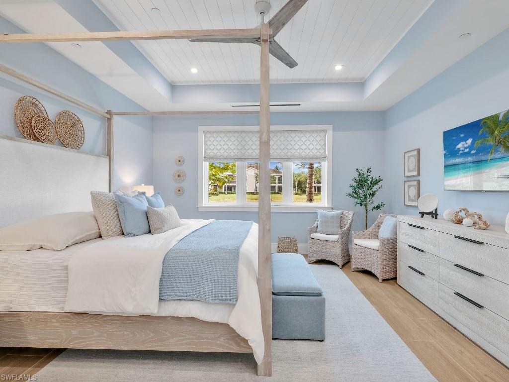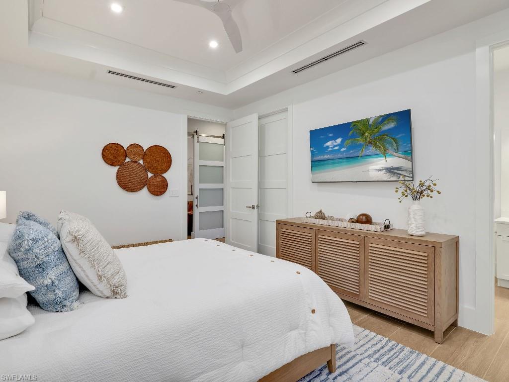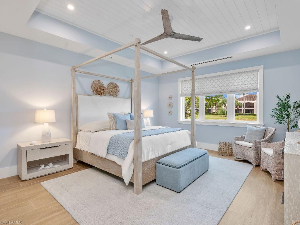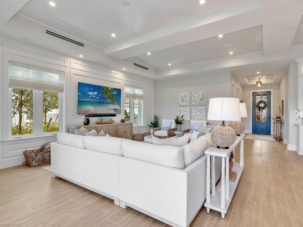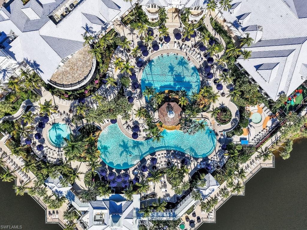 Luxurious coach home in the exceptional Dorado community at Fiddler's Creek with coastal contemporary architecture built in 2024 by Gulf Bay Homes and designed by MHK. This 2,600-square-foot ground floor Palmetto unit offers three bedrooms, three-and-a-half baths, custom office/den, and spacious two-car garage. The main living area blends sophistication and comfort and includes an expansive great room with shiplap and coffered ceiling accents opening with two 12' wide center opening sliders to the screened lanai for covered outdoor living with matching flooring, tray ceiling with wood plank, ceiling fans, and recessed LED lighting, all overlooking tranquil lake views. Stylish wood-look ceramic tile that combines the beauty of wood with the easy maintenance of ceramic tile throughout the main living areas, 8' solid core doors, 8” base molding, whole-house Sonos sound system, and numerous smart home features. The large chef's kitchen boasts 42" upper kitchen cabinets with glass-front uppers, in-cabinet and under-cabinet lighting, quartz counters, glass-tile backsplash, and an oversized island. A full complement of Bosch stainless appliances includes a French-door refrigerator with freezer drawer, drawer microwave, natural gas cooktop with hood vent, double wall oven with convection, and dishwasher. The owner's suite features coffered, shiplap ceilings, an oversized master bath with dual quartz vanities with makeup counter, a frameless walk-in shower with bench, and an expansive walk-in closet with custom wood shelving. Two guest bedrooms each feature ensuite baths. Several upgrades have been added to this home including a custom-built office and master closet, hand-held showers, great room feature wall, laundry room backsplash and butcher-block countertop over washer and dryer for folding, window treatments and remote-controlled electric shades. Exterior offers all-concrete construction, flat profile concrete roof tile, 2-car garage with epoxy flooring and bonus storage room, Marvin casement windows, private courtyard entry, and lush landscaping. Fiddler's Creek residents enjoy amenities that include the 54,000-square-foot Club & Spa, featuring a resort-style multi-pool complex, state-of-the-art fitness center, tennis, ten new pickleball courts, bocce, an extensive activity calendar, and casual and fine dining. Miles of sidewalks wind through the lushly landscaped community for walking, bicycling, and running.