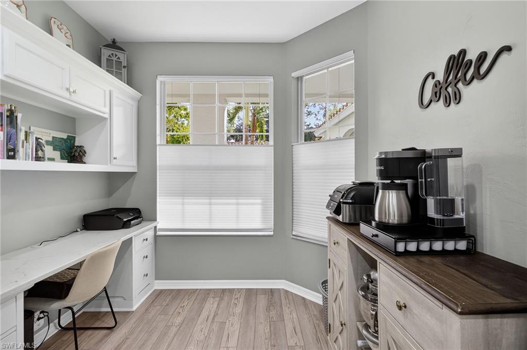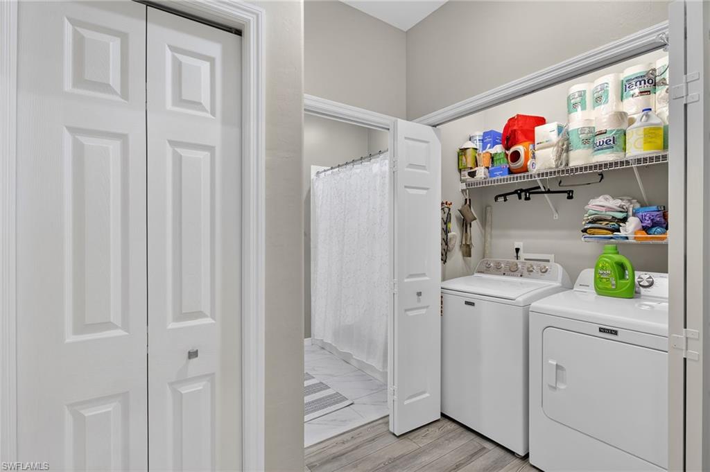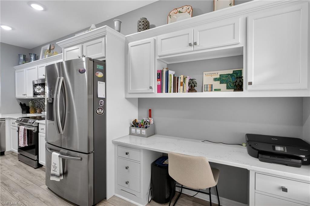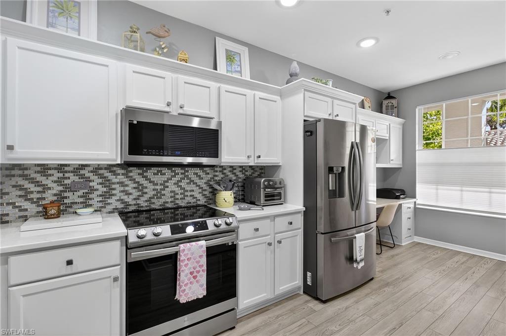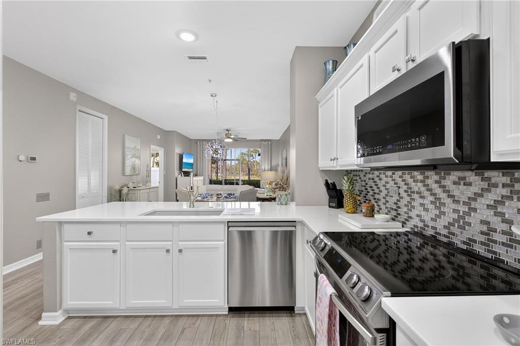 Located within Vanderbilt Country Club, this beautifully renovated first-floor condominium is truly move-in ready and thoughtfully upgraded from top to bottom. The kitchen has been completely redesigned with crisp white cabinetry that extends for generous storage and includes a built-in office/workspace area. Quartz countertops, a glass tile backsplash, and Samsung stainless steel appliances (approximately two years old) create a clean, modern aesthetic that is both functional and stylish. Throughout the home, you’ll find new blinds, LED lighting, updated ceiling fans, and a Maytag washer and dryer. The entire condo was freshly painted in neutral tones in 2024, providing a bright, cohesive look. Luxury vinyl flooring runs through the main living areas and primary bedroom, with porcelain tile flooring in both bathrooms for durability and elegance. Both bathrooms have been fully updated with solid wood vanities, modern mirrors, and wall cabinets, while the primary bath features a new glass shower enclosure that completes the spa-like feel. With every upgrade already completed, there is truly nothing left to do but move in and enjoy the Vanderbilt Lifestyle.
