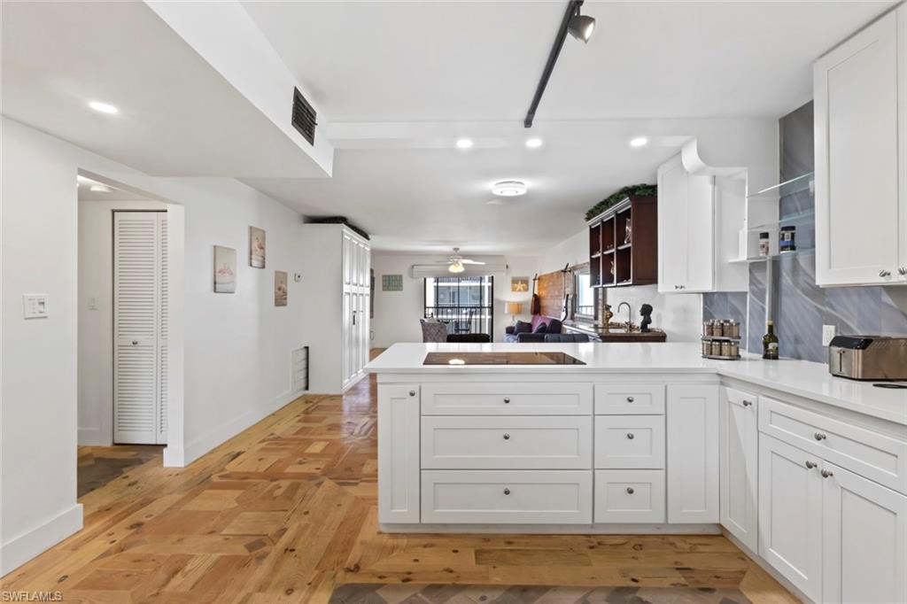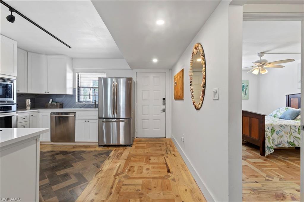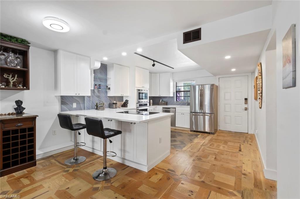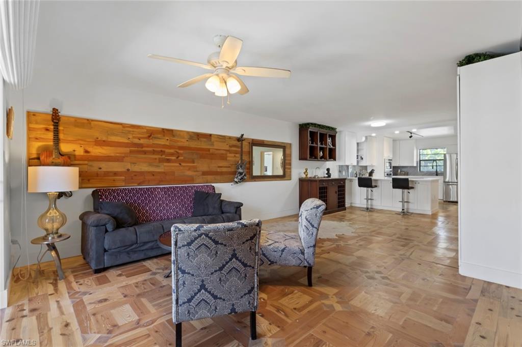Welcome to Spanish Harbor in the heart of Bonita Springs, where Gulf-access boating and relaxed Southwest Florida living come together in this beautifully updated and fully furnished 2-bedroom, 2-bath condo. As you step inside, you’ll immediately notice over 6,000 pieces of hand-cut reclaimed timber forming exquisite custom parquet patterns throughout the floors, adding warmth, texture, and distinctive character that make this residence truly one-of-a-kind. The renovated kitchen blends style and function with a modern induction stovetop, stainless steel appliances, quartz countertops, and an in-wall oven, creating an inviting space for everyday living or entertaining. The open great room flows to a screened balcony overlooking the canal and pool area, while the split-bedroom floor plan provides privacy and flexibility. Both bathrooms have been tastefully updated, the bedrooms are well-appointed, and a built-in Murphy bed adds versatility for guests or additional sleeping space. Spanish Harbor is a boating community offering community Gulf access, boat slips available, a community dock, fish cleaning station, heated pool, tiki hut, BBQ/picnic areas, bike storage, and covered assigned parking. Just minutes from Downtown Bonita Springs, Riverside Park, local dining and shopping, and a short drive to the beaches, this property delivers the coastal lifestyle so many seek. With flexible leasing (up to 6 leases per year, 30-day minimum), this condo is ideal as a seasonal retreat, investment opportunity, or full-time residence in one of Bonita’s waterfront communities.