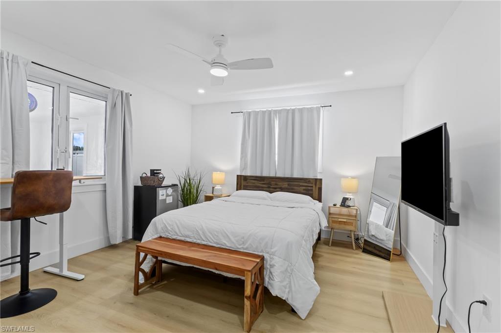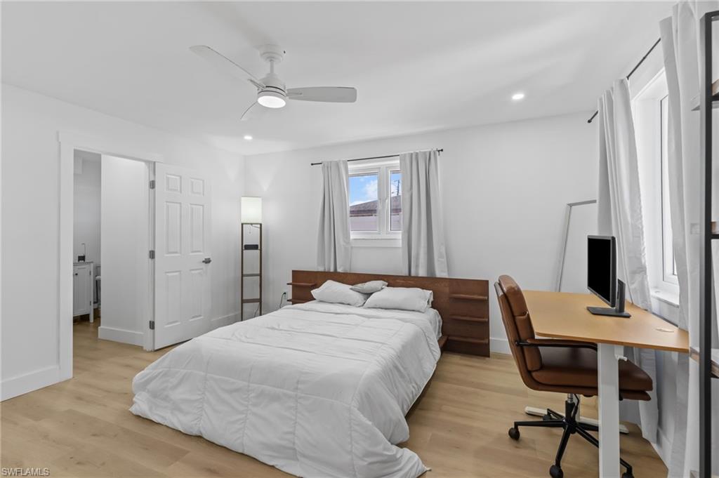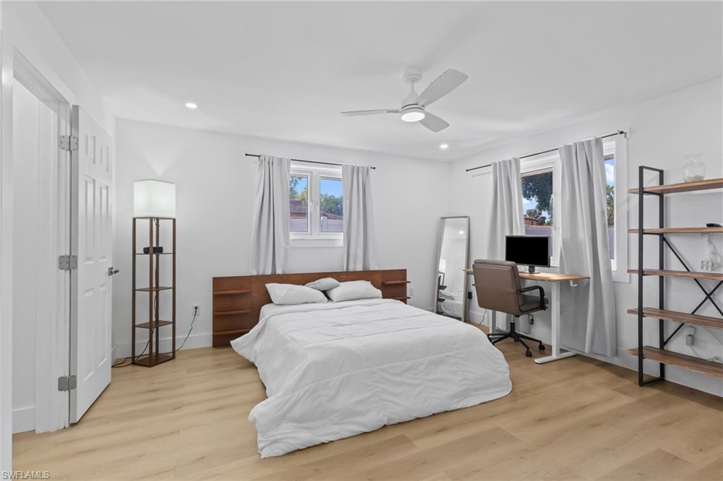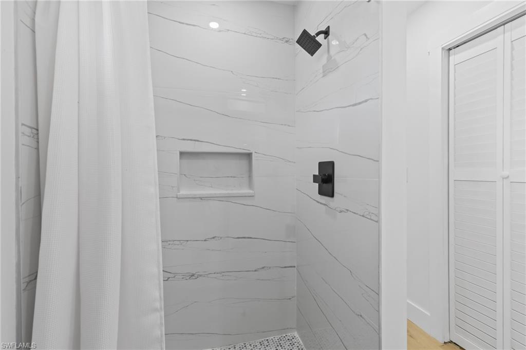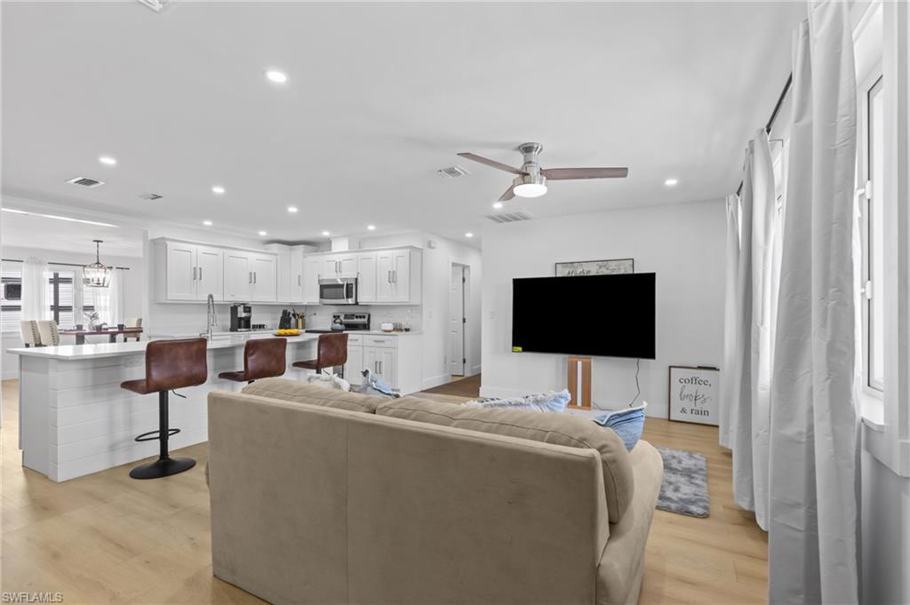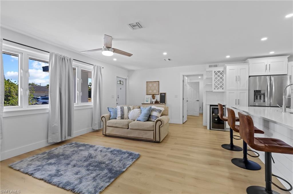 Welcome to this beautifully remodeled 3 bedroom, 2 bathroom home in the heart of Bonita Springs, offered turnkey and ready for immediate enjoyment. With no HOA, you’ll enjoy added flexibility and freedom. This home is not in a flood zone, providing extra peace of mind. Inside, a light and bright open layout creates an inviting atmosphere. The spacious living area flows seamlessly into a stunning kitchen featuring a large island with breakfast bar seating, quartz countertops, stainless steel appliances, and generous storage. The dining area sits just off the kitchen, keeping everything connected and ideal for gathering. An expansive sunroom adds exceptional versatility, perfect as a second living space, office, fitness area, or hobby room. The primary suite is a true retreat with a huge walk-in closet and a beautifully updated en-suite bath complete with dual sinks and a walk-in shower. Two additional bedrooms are comfortably sized and share a full guest bath. Outside, the spacious yard offers plenty of room to relax or entertain, including the ability to park an RV on your own property. A 2-car garage includes a remote-operated garage door opener with built-in camera capability, and the home is equipped with a security system for added peace of mind. Drive just minutes to Barefoot Beach and enjoy some of Southwest Florida’s most beautiful shoreline. Modern updates, thoughtful features, and a prime location close to shopping and dining make this move-in-ready home a standout opportunity!