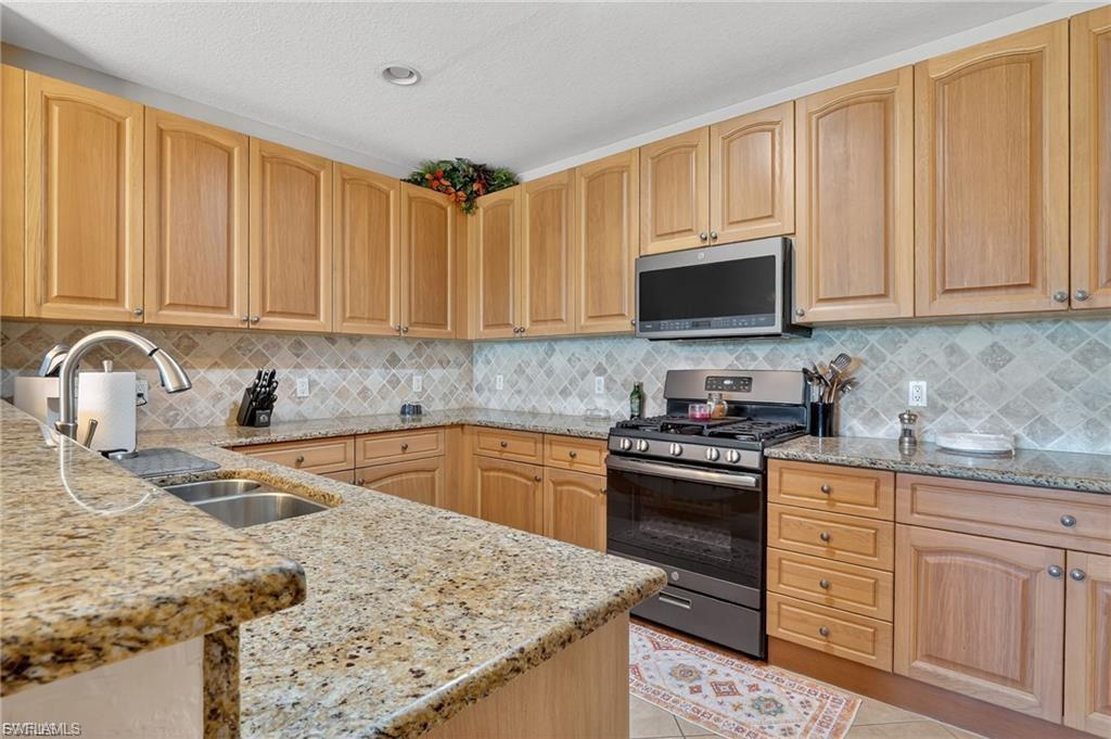 This 3-bed + den, 3-bath home delivers style, space, and an unbeatable view. Enjoy plantation shutters, crown molding, and 5” baseboards for a polished look. The chef’s kitchen features granite counters, tile backsplash, stainless steel appliances (2021), a gas stove, and tons of storage. The primary suite boasts TWO walk-in closets, a walk-in tile shower, a garden tub, and double vanities. Guests will love their private quarters with walk-in shower. Tile floors, recessed lighting, and a freshly painted exterior make this home move-in ready. Relax on your 14x32 screened lanai with views of the golf course and lake. New A/C (2023), water heater (2019), and a spacious 2-car garage complete the package.