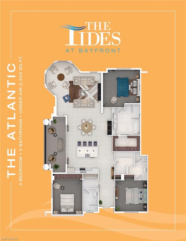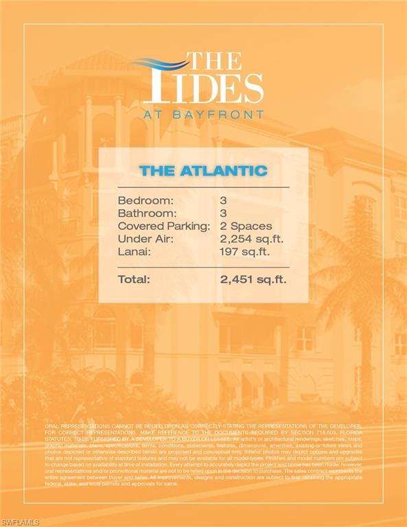Imagine it, an early morning stroll or bike ride, followed by a fantastic brunch or lunch just steps away from your front door. Ready to soak in the sun? Award-winning beaches are less than 5 minutes away and renting a boat can be done with ease. Centrally located in downtown Naples, residents of The Tides at Bayfront can embrace all that this vibrant city has to offer! Exquisite shops, fine dining, and eclectic galleries await those with high expectation of luxury while easy access to waterfront amenities and serene surroundings will envelop those that prefer a more relaxed lifestyle. The Atlantic floor plan is an end-unit that offers 2,254* (2,235 in some units) square feet of living space.