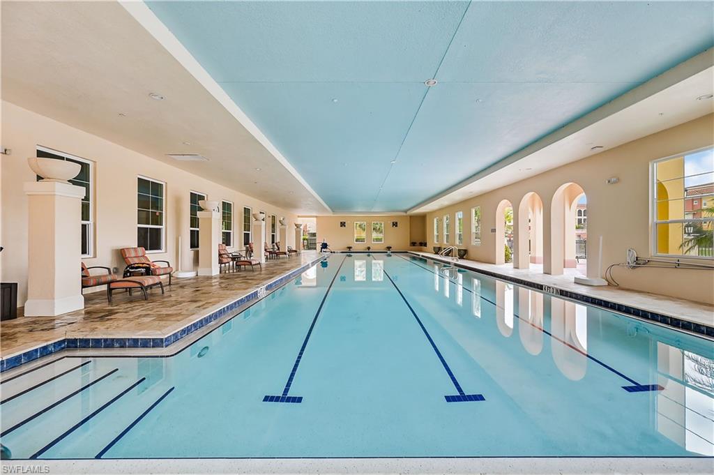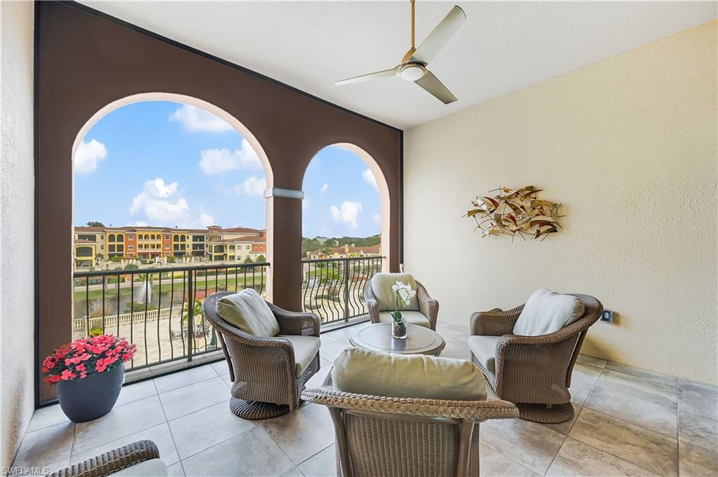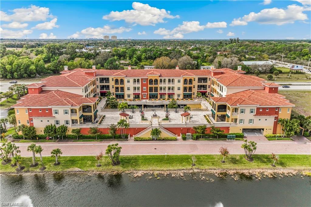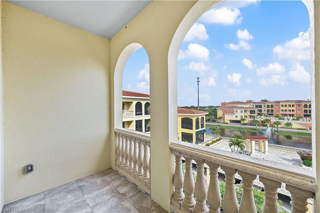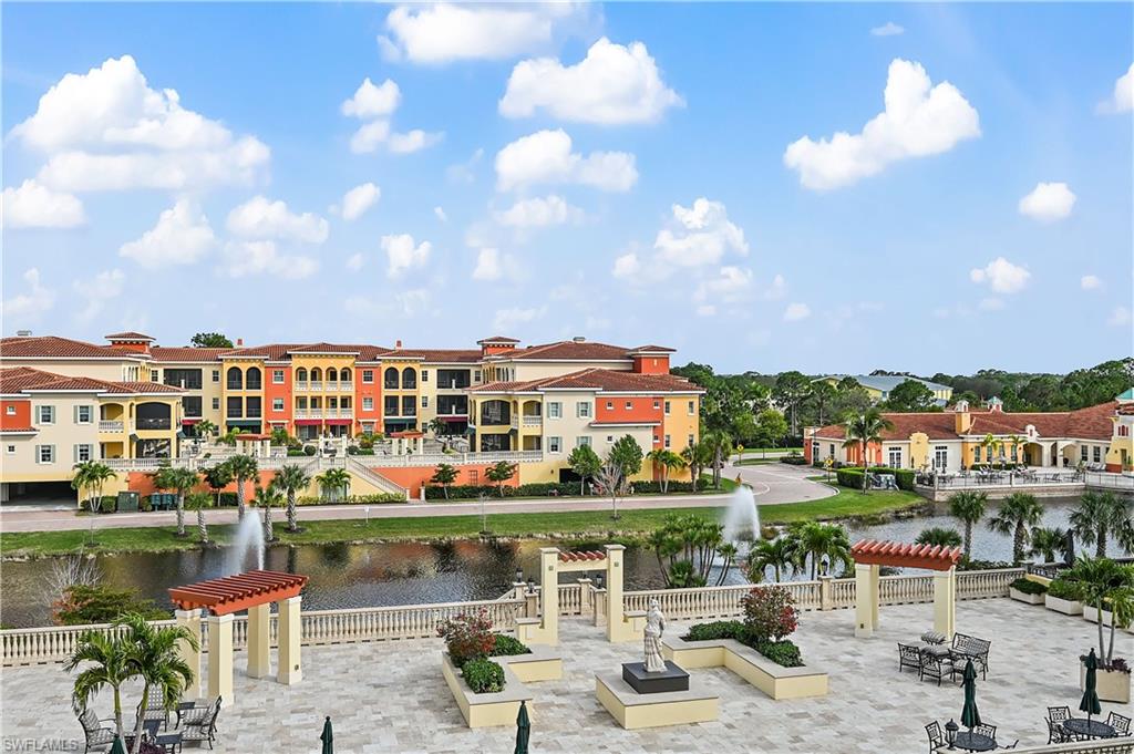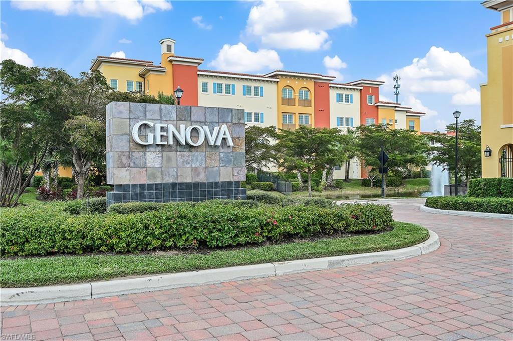 THIS IS A MUST SEE. OPEN AND BRIGHT WITH A GREAT VIEW - 3 bed, 2 bath, 2-car garage 1,748 ACSF luxury condo at Genova in Estero, Florida offers breathtaking water & courtyard views. Upscale features: concrete construction, sound-insulated interior walls, 8 ft solid-core doors, hurricane impact doors & windows,10-foot ceilings, oversized two-car garage. Decorated in contemporary style, luxury finishes are KraftMaid cabinets, quartz counters, Kohler faucets, pull-out pantry drawers, beautiful wood floors, window casing, crown molding. The bathrooms, lanai & balcony are porcelain tile. The study/third bedroom features double-French doors. The spacious master bedroom/bath suite features a large wet-area of double showers with frameless glass. Genova's amenities are very impressive with an indoor lap pool, outdoor resort pool, fitness center, aerobic studio, sauna, clubhouse and bocce courts. And enjoy the convenience of a private gate to adjacent Estero Community Park with its dog park, pickleball courts and community center—all just a short walk away. A prime location close to everything, only one mile from Coconut Point Mall and 10 minutes to RSWF airport or 8 miles to the beach. FURNITURE INCLUDED