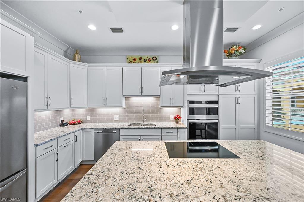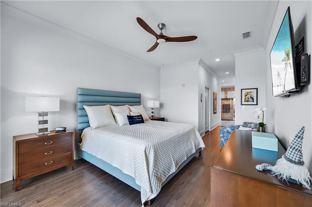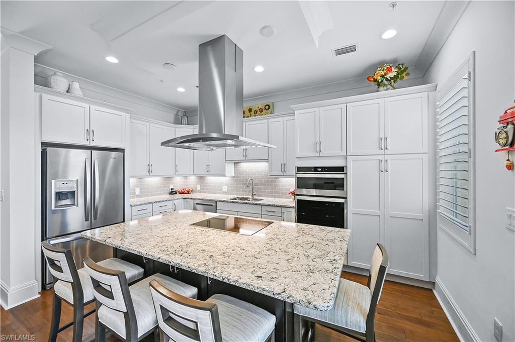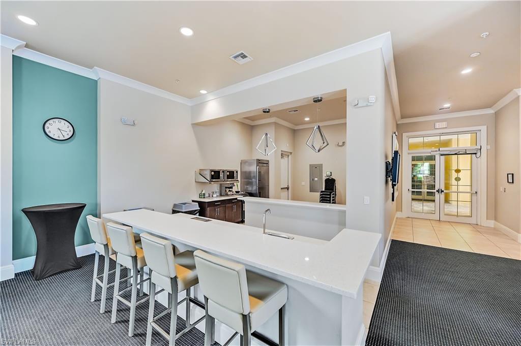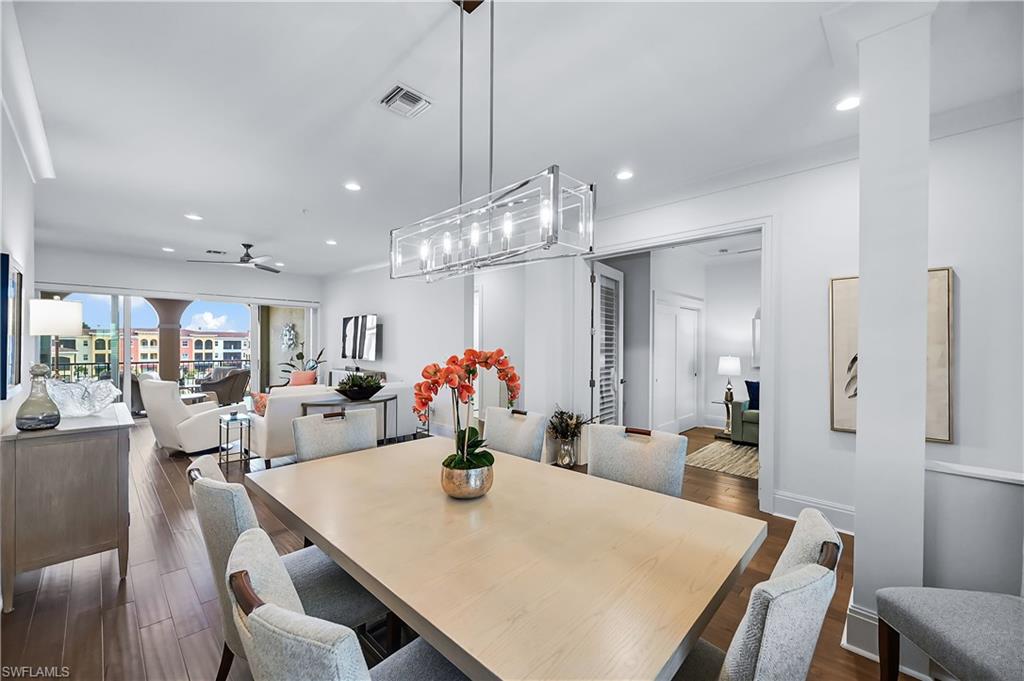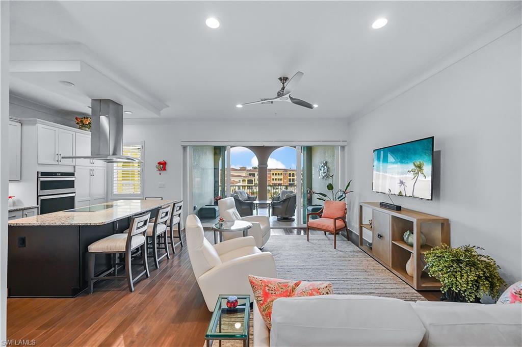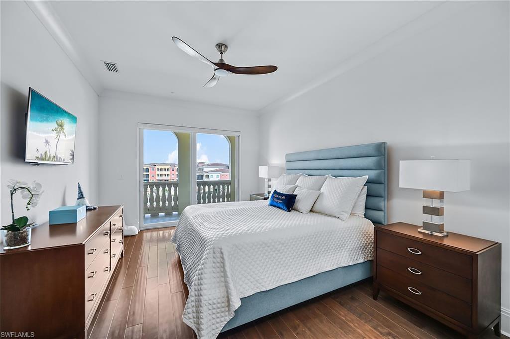 THIS IS A MUST SEE. OPEN AND BRIGHT WITH A GREAT VIEW - 3 bed, 2 bath, 2-car garage 1,748 ACSF luxury condo at Genova in Estero, Florida offers breathtaking water & courtyard views. Upscale features: concrete construction, sound-insulated interior walls, 8 ft solid-core doors, hurricane impact doors & windows,10-foot ceilings, oversized two-car garage. Decorated in contemporary style, luxury finishes are KraftMaid cabinets, quartz counters, Kohler faucets, pull-out pantry drawers, beautiful wood floors, window casing, crown molding. The bathrooms, lanai & balcony are porcelain tile. The study/third bedroom features double-French doors. The spacious master bedroom/bath suite features a large wet-area of double showers with frameless glass. Genova's amenities are very impressive with an indoor lap pool, outdoor resort pool, fitness center, aerobic studio, sauna, clubhouse and bocce courts. And enjoy the convenience of a private gate to adjacent Estero Community Park with its dog park, pickleball courts and community center—all just a short walk away. A prime location close to everything, only one mile from Coconut Point Mall and 10 minutes to RSWF airport or 8 miles to the beach. FURNITURE INCLUDED