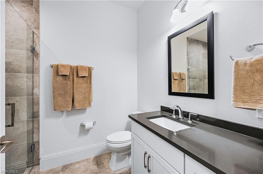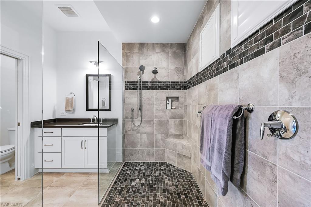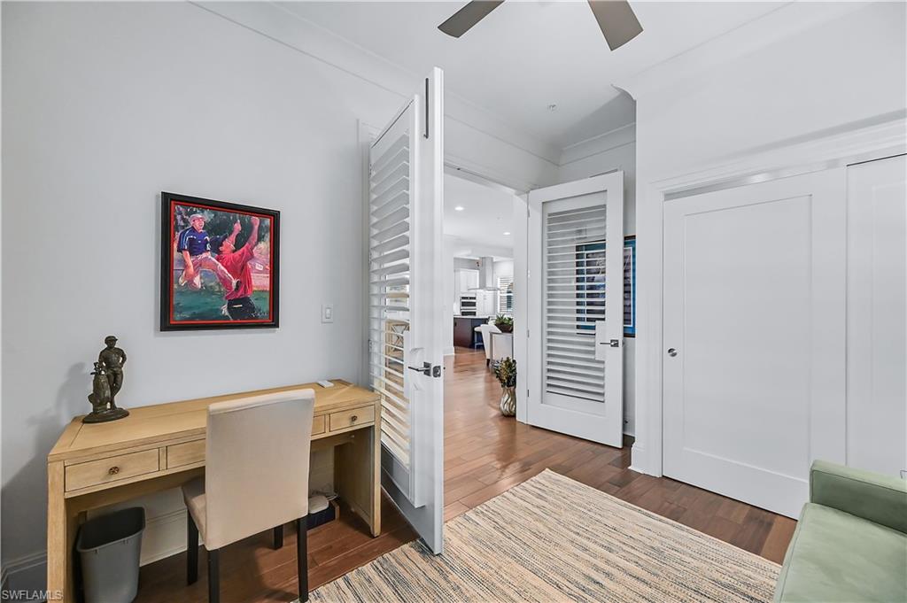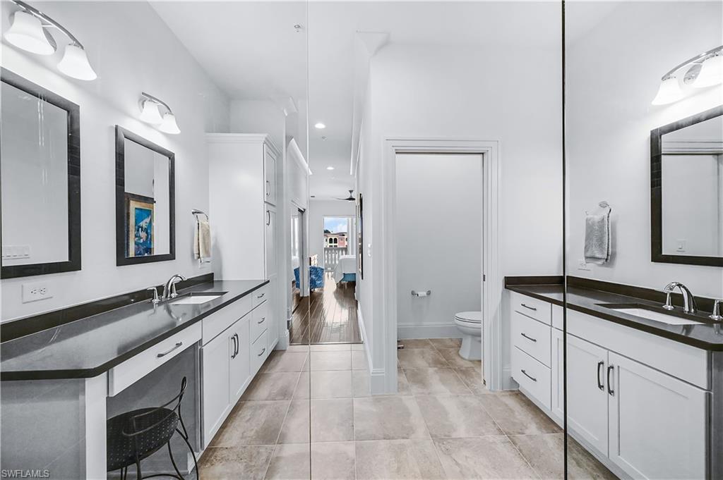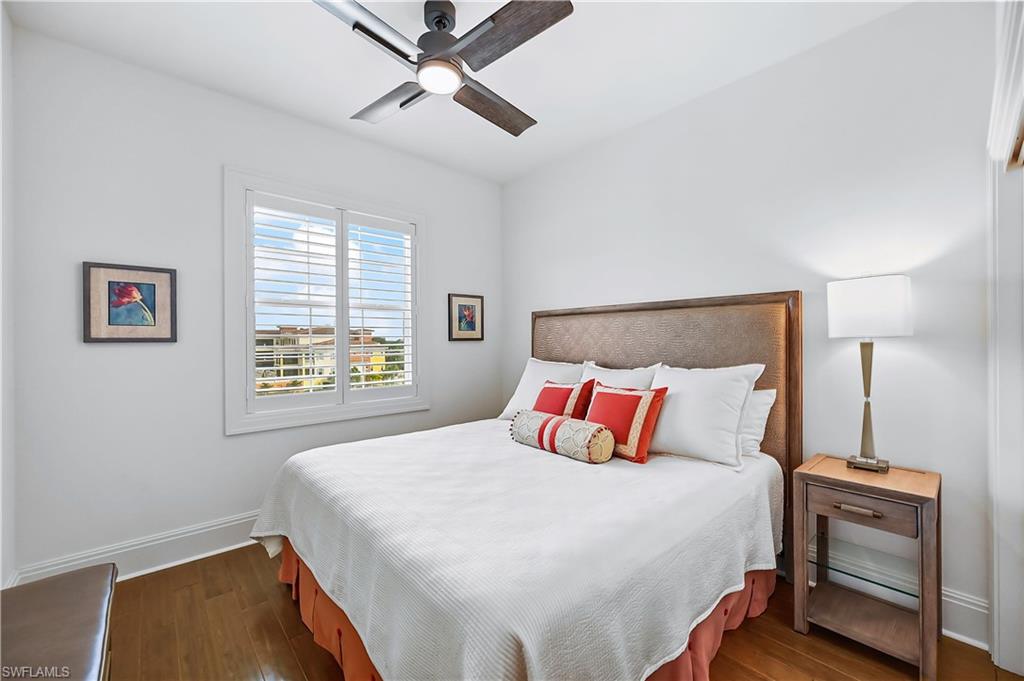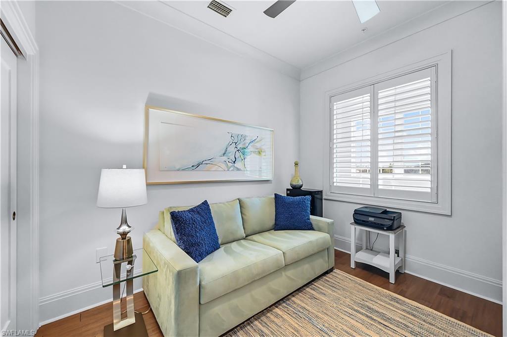 THIS IS A MUST SEE. OPEN AND BRIGHT WITH A GREAT VIEW - 3 bed, 2 bath, 2-car garage 1,748 ACSF luxury condo at Genova in Estero, Florida offers breathtaking water & courtyard views. Upscale features: concrete construction, sound-insulated interior walls, 8 ft solid-core doors, hurricane impact doors & windows,10-foot ceilings, oversized two-car garage. Decorated in contemporary style, luxury finishes are KraftMaid cabinets, quartz counters, Kohler faucets, pull-out pantry drawers, beautiful wood floors, window casing, crown molding. The bathrooms, lanai & balcony are porcelain tile. The study/third bedroom features double-French doors. The spacious master bedroom/bath suite features a large wet-area of double showers with frameless glass. Genova's amenities are very impressive with an indoor lap pool, outdoor resort pool, fitness center, aerobic studio, sauna, clubhouse and bocce courts. And enjoy the convenience of a private gate to adjacent Estero Community Park with its dog park, pickleball courts and community center—all just a short walk away. A prime location close to everything, only one mile from Coconut Point Mall and 10 minutes to RSWF airport or 8 miles to the beach. FURNITURE INCLUDED