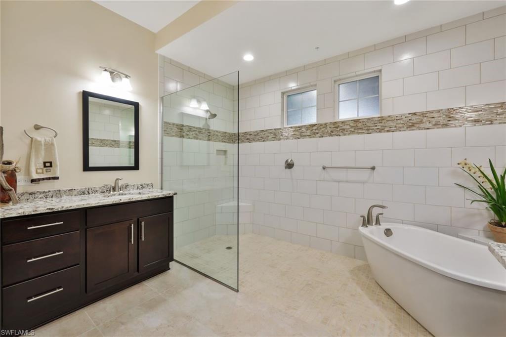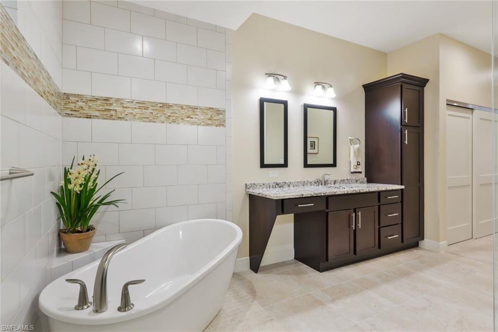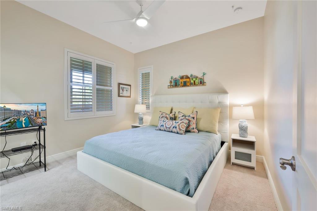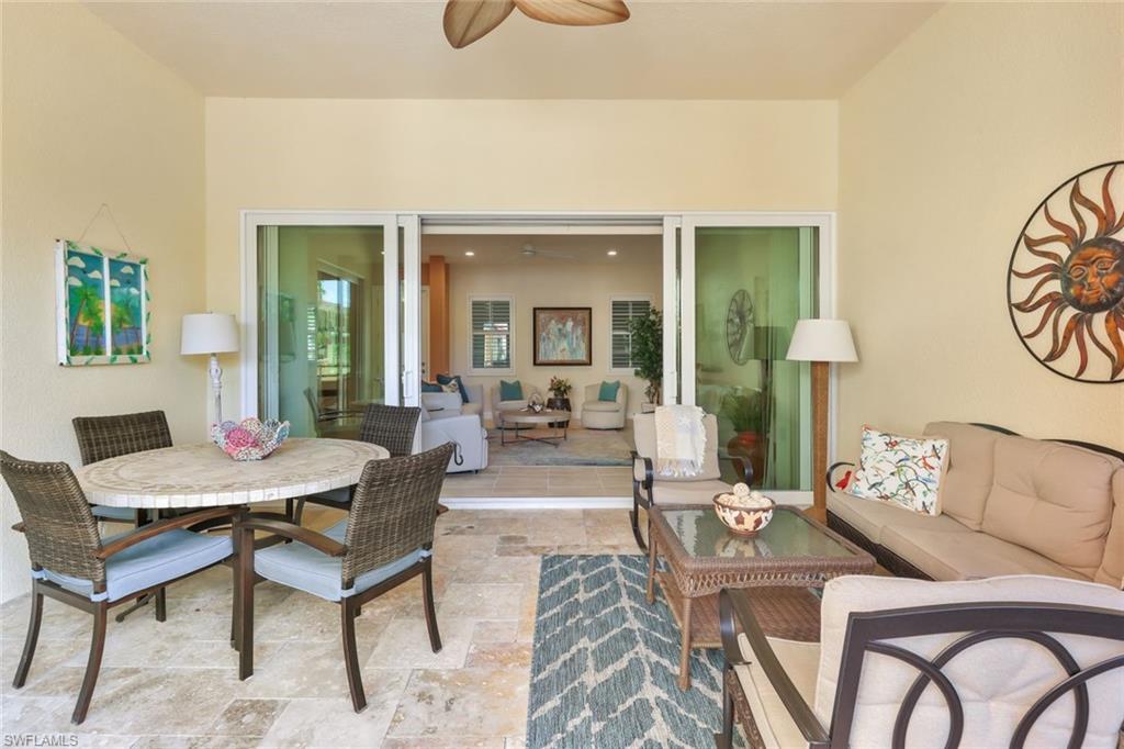 Immaculately maintained w/ abundance of enhancements this 3 bed, 2 bath condo is located in the sought after gated community of Genova at Coconut Point. With t/ most desirable Western exposure, enjoy endless beautiful sunsets! Fall in love w/ the large open concept layout w/ many upgrades including: all windows & doors are impact resistant, interior doors are 8' & solid core, interior walls are fully insulated, plantation shutters, an oversized 2 car garage w/ 18' door, additional climate-controlled storage space & the list goes on! Enjoy the gorgeous kitchen w/ white shaker cabinetry, granite countertops, lovely neutral backsplash, kitchen island w/ storage on both sides, & a hood over your stove so you can cook & entertain! The spacious primary bedroom has direct access to lanai & a wonderful ensuite bathroom w/ freestanding tub, frameless glass walk-in shower, gorgeous tile & listello detail, & dual vanities! Genova offers a lavish lifestyle, including full amenity clubhouse, outdoor pool & spa, indoor lap pool, party room, fitness room& saunas. Located near Coconut Point Mall, RSW airport, & Koreshan State Park, residents enjoy easy access to shopping, dining, & entertainment!