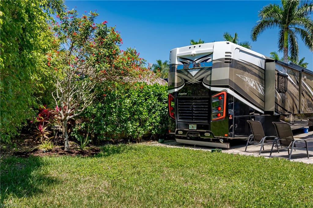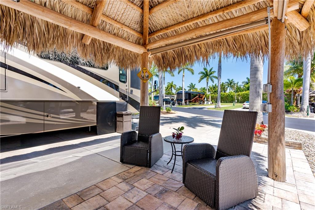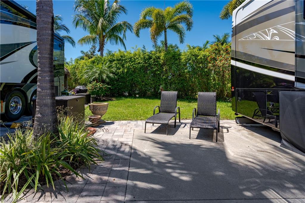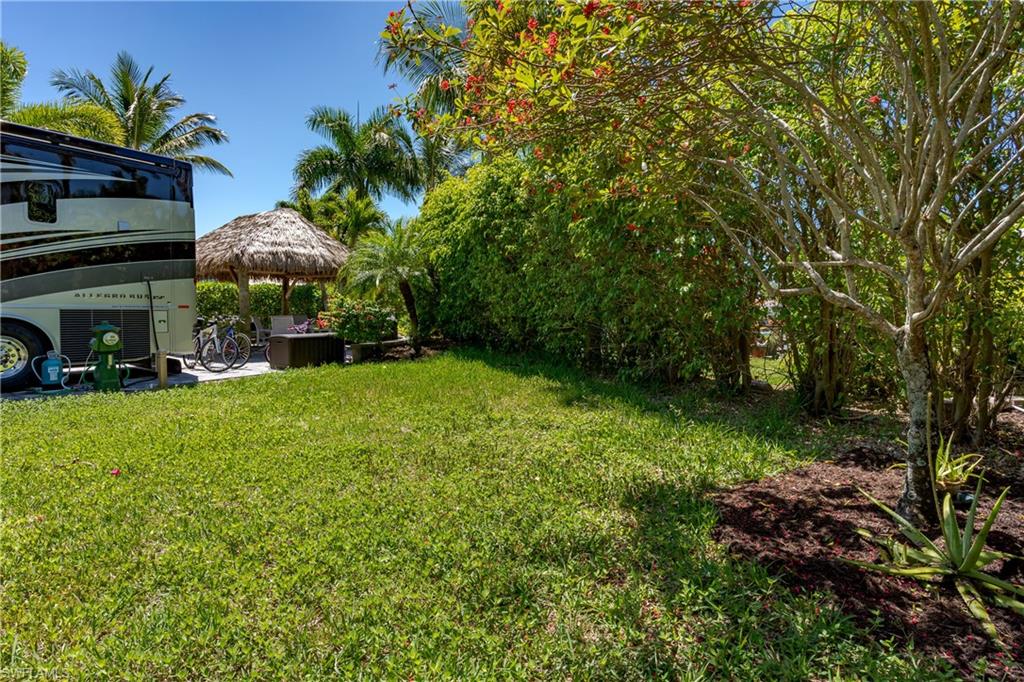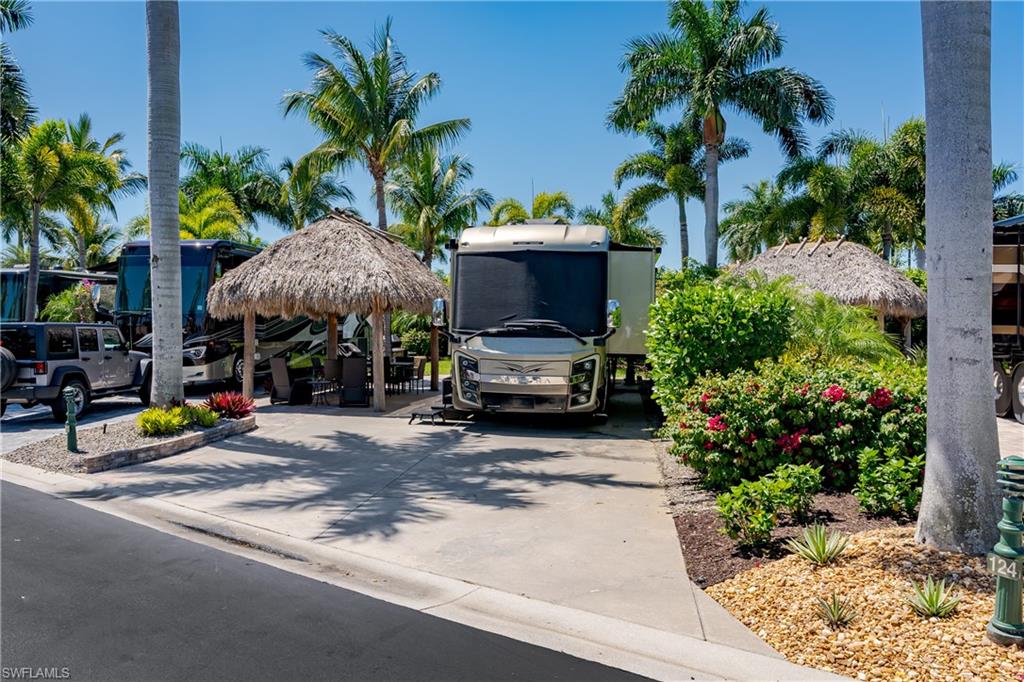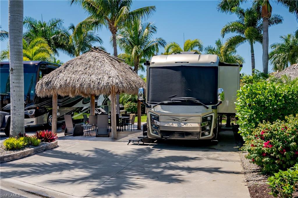 Lot 125 - Welcome to your own slice of paradise! This lot has an oversized Tiki and a huge grassy area in the rear of the property that you can enjoy as lawn, a place for your dog to play fetch and roll around or let your imagination go wild and landscape with beautiful flowers and shrubs. This property also affords space for several separate conversation areas, you can lounge on the grass or just off of it on your pavers, the oversized tiki can accommodate a huge dining table to enjoy a meal and still have room for chairs and end tables under the tiki to just socialize. The tiki has screens on three sides that you can have rolled up for the amazing breezes, or pull down for privacy. The tiki is well positioned so that you can easily access your motorcoach to bring out and replenish food and drink quickly. Come see this amazing property with oversized, side positioned tiki and make it your own. Naples Motorcoach Resort is a Class A only resort and boasts a beautiful infinity pool, hot spa, exercise room, men and ladies' saunas and a kitchen that owners can use. A clubhouse for events whether sponsored by the resort or you can reserve for your own gathering. Two satellite pools each with a hot spa their own rest rooms and a laundry room. We can't forget your furry best friend; the resort also has a dog park!