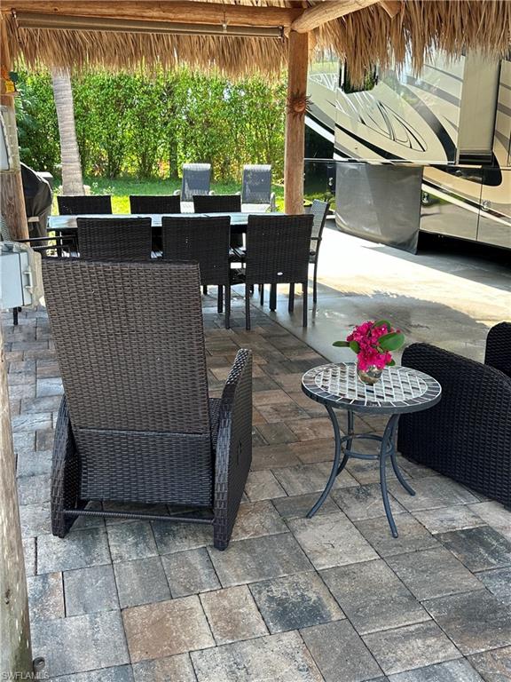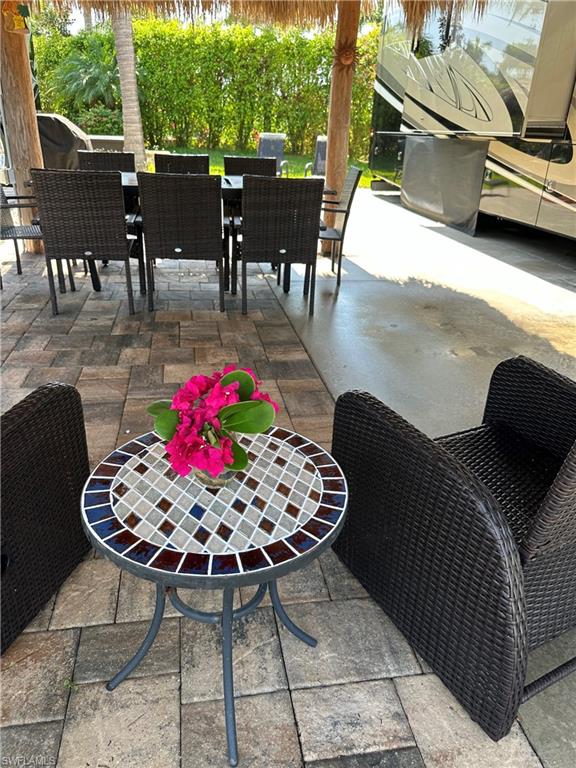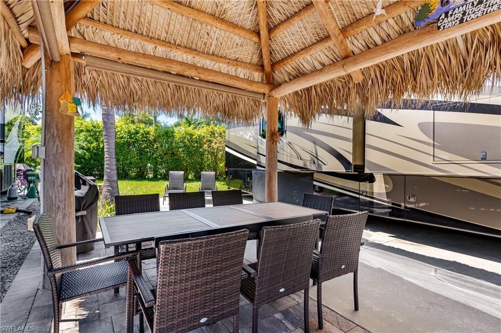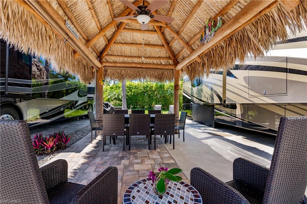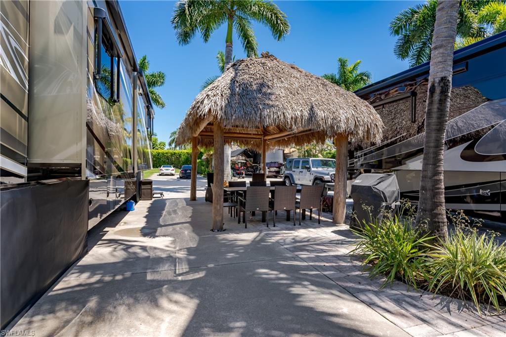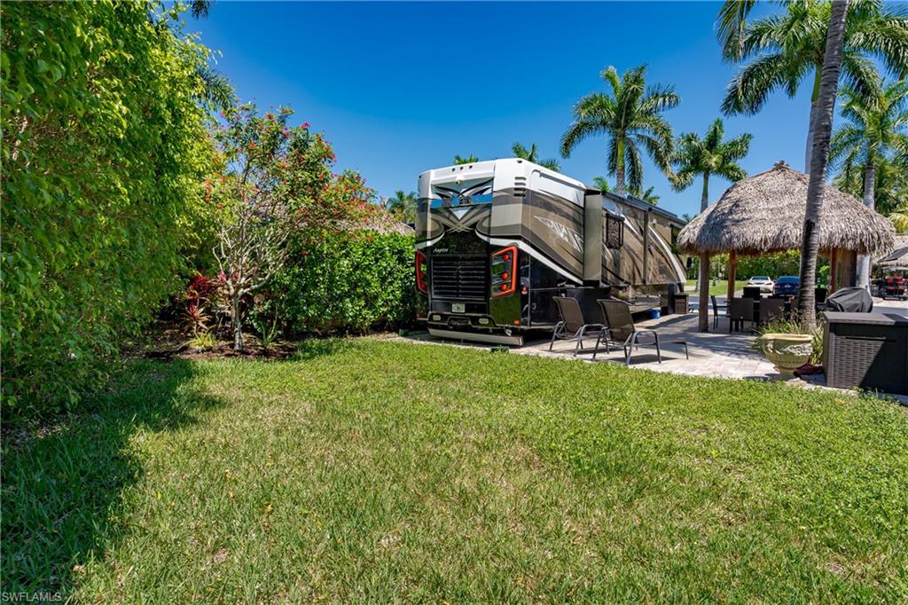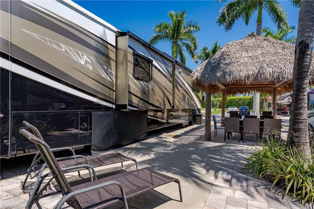 Lot 125 - Welcome to your own slice of paradise! This lot has an oversized Tiki and a huge grassy area in the rear of the property that you can enjoy as lawn, a place for your dog to play fetch and roll around or let your imagination go wild and landscape with beautiful flowers and shrubs. This property also affords space for several separate conversation areas, you can lounge on the grass or just off of it on your pavers, the oversized tiki can accommodate a huge dining table to enjoy a meal and still have room for chairs and end tables under the tiki to just socialize. The tiki has screens on three sides that you can have rolled up for the amazing breezes, or pull down for privacy. The tiki is well positioned so that you can easily access your motorcoach to bring out and replenish food and drink quickly. Come see this amazing property with oversized, side positioned tiki and make it your own. Naples Motorcoach Resort is a Class A only resort and boasts a beautiful infinity pool, hot spa, exercise room, men and ladies' saunas and a kitchen that owners can use. A clubhouse for events whether sponsored by the resort or you can reserve for your own gathering. Two satellite pools each with a hot spa their own rest rooms and a laundry room. We can't forget your furry best friend; the resort also has a dog park!