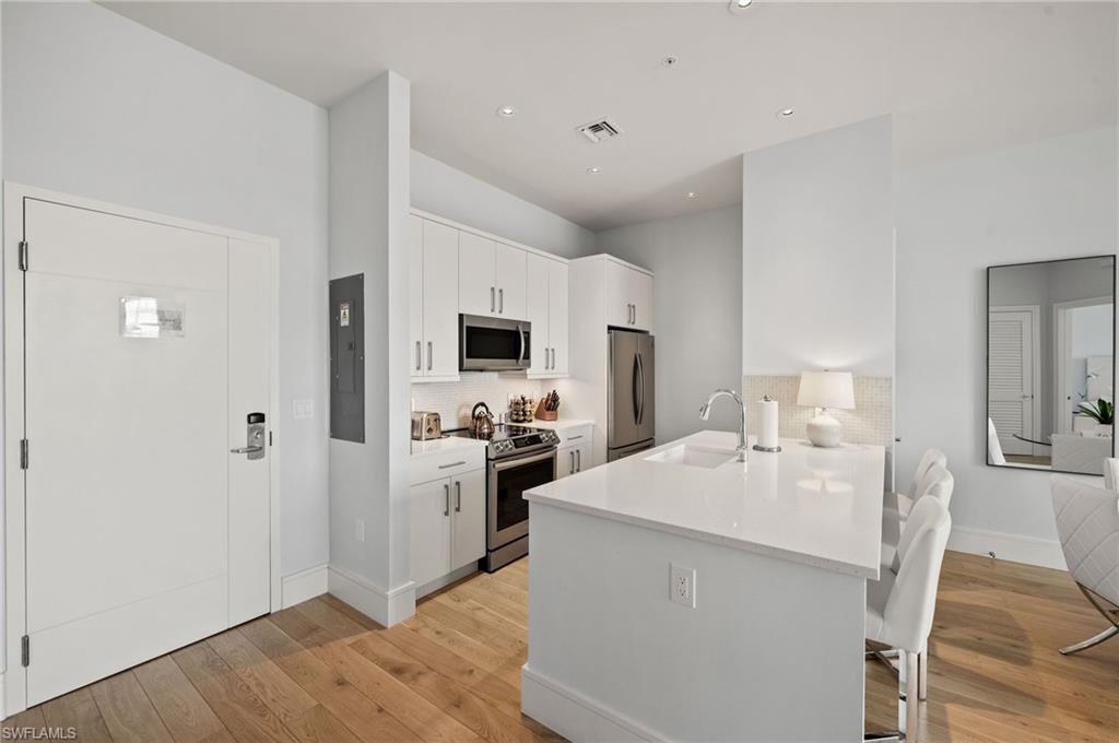 Own a newer 2021 construction stunning property just blocks to 5th Ave. S. and the beaches in Olde Naples under $1M! Furnishings/interiors designed by Clive Daniel Home throughout, facing west with an open green space sunset view and having unique rental zoning flexibility to rent out nightly, weekly or monthly! This impeccable one bedroom unit comes turnkey with sleeping for four and an assigned covered parking space. The perfect slice of Naples ownership that is pet friendly and with an added income generating opportunity! A must see!