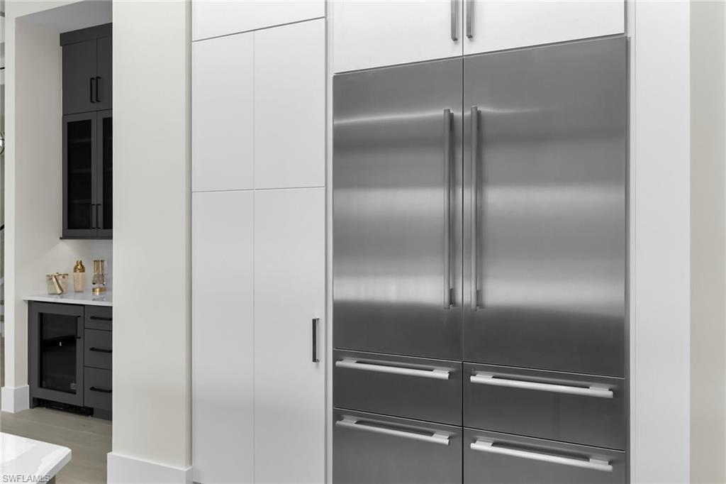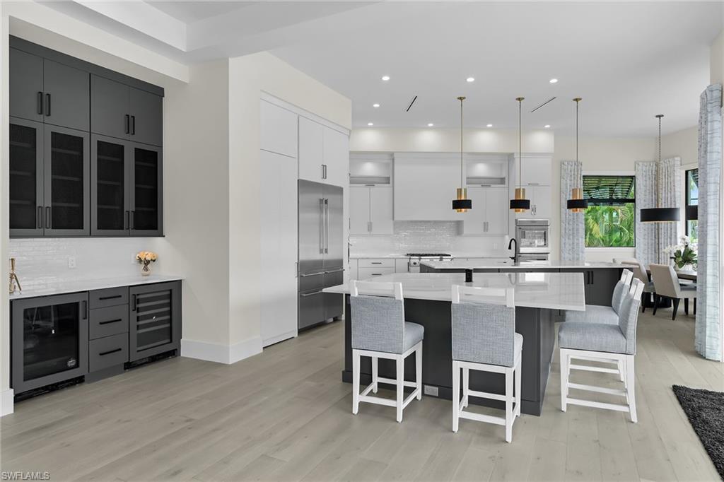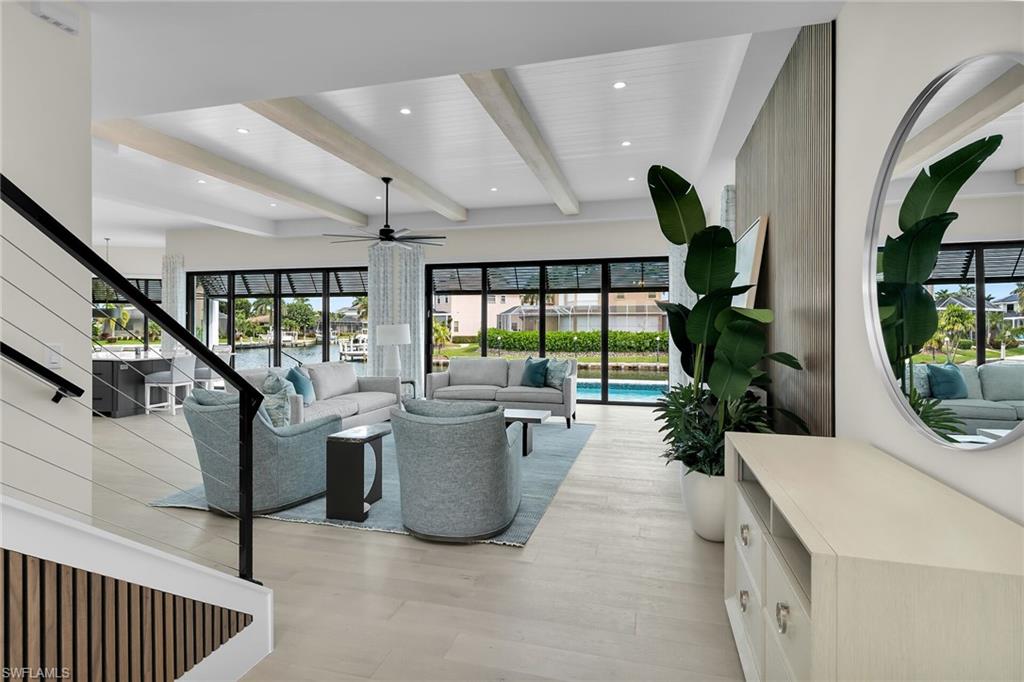 Sister home finished and available for viewing. Reserve now ahead of seasonal price increases. Beautiful coastal home on a diverging waterway with peaceful big water views on more than 170' of new seawall. This stunning home offers more than 4000 square feet under air and a spacious covered lanai space featuring extensive custom outdoor kitchen. The covered lanai is protected by roll down screens/shades and hurricane shutters. The huge 2 1/2 car garage has a special 18' impact overhead door and ceiling height enough for an auto stack for that special extra car and additional large air conditioned storage area. Numerous ceiling beams and custom wood finishes throughout the home. The windows and doors are all impact and UV resistant by PGT. The home is easy walking distance to public beach access, shopping and dining. Estimated completion date October 2025.