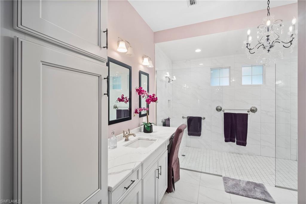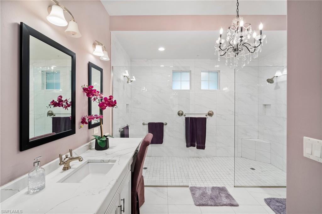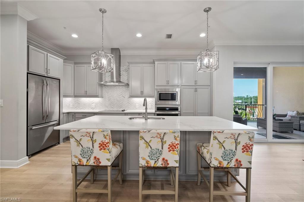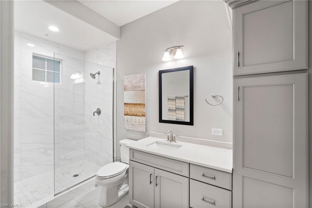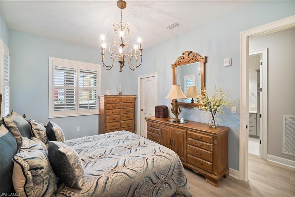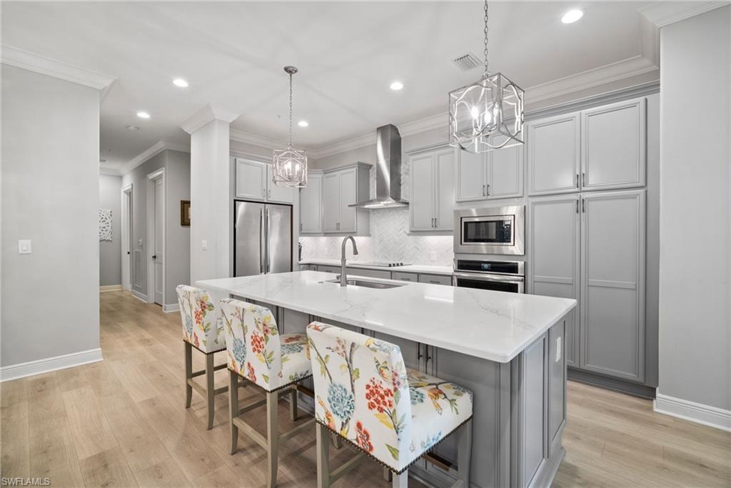 So many great things about this Genova condo. First is the quality, you will not find any condo or house with the better than builder quality. From the time park your car in the oversized 2 car garage with an 18 foot wide door instead of the average 16 foot wide doors of most other communities you will notice the difference immediately and you haven't even been inside the unit yet. The interior is definitely a site to see, from the over 9 foot extended kitchen island with Carrara quartz counters, beautiful light grey cabinets with under cabinet lighting, wall oven and microwave, stainless vent hood with direct vent, electric cooktop and custom marble backsplash make this kitchen truly custom. You will enjoy your great room and dining room that offers so much space for entertaining and a great screened lanai with an awesome view for even more room. Unit is light and bright with all exterior doors and windows impact glass, all interior doors are 8 feet solid core and every interior wall is fully insulated to make sure it's as quiet as possible. Main bathroom is a spa delight. Double showers and shower heads, dual vanities and sinks. You can see the special picked tile in the shower that's a full 3 walls and tile to the ceiling with windows to allow the iight in. Main bedroom is spacious, has a slider to the screened lanai for your morning coffee and it also offers a walk-in closet and a bypass closet. The hall/guest bathroom also has.a window for light a linen closet and another shower with custom wall tile. The guest room was made larger and also offers a walk-in closet. You will notice the french door on the office/study adds to the quality of the entire unit. The only carpet in the entire unit is in the main bedroom all other rooms have hard surface flooring. We haven't even mentioned the great location of Genova in The Village of Estero, great location and so much quality compared to other communities, come take a look you won't be disappointed. Agents, please read confidential comments.