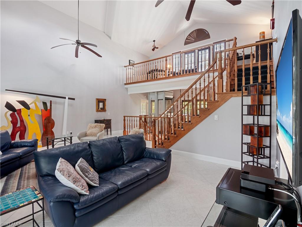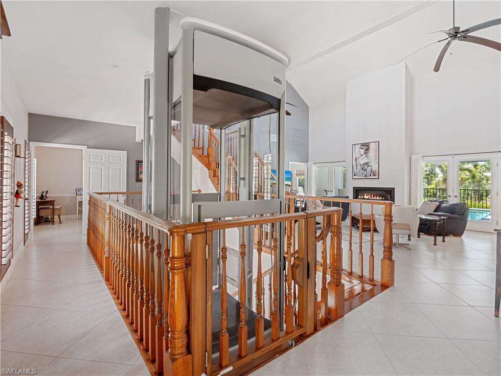 This impeccably located Old Florida-style lake-front 4 Bedroom home offers an ideal blend of privacy and convenience. Nestled on the east end of the island, it boasts 180+/- feet of serene lake frontage on an oversized lot with mature native vegetation and lush landscaping, providing stunning lake views. The location ensures easy access on and off the island, perfect for year-round residents. This well-maintained home, fully updated and ready to be your forever home, features a grand entrance with a winding drive, a grand staircase, and a private elevator. The raised caged pool, recently resurfaced with new pavers and a new pool heater (2023), is a standout feature, complemented by large porches, abundant deck space, and a new metal roof (2024). Inside, the main living level boasts high ceilings, a cupola, and a fireplace in the great room. The master suite offers his and hers baths, while two guest suites each have private baths. Additional spaces include a den with a half bath, a huge loft area, a formal dining room, and a kitchen with high-end Bosch and Monogram appliances. Modern comforts are ensured with a new mini split AC unit, updated AC ductwork, a new dishwasher, and two new water heaters. The lower level includes three large garage bays and ample storage and recreational space. This home combines timeless style with contemporary updates in a secluded, yet accessible, setting.