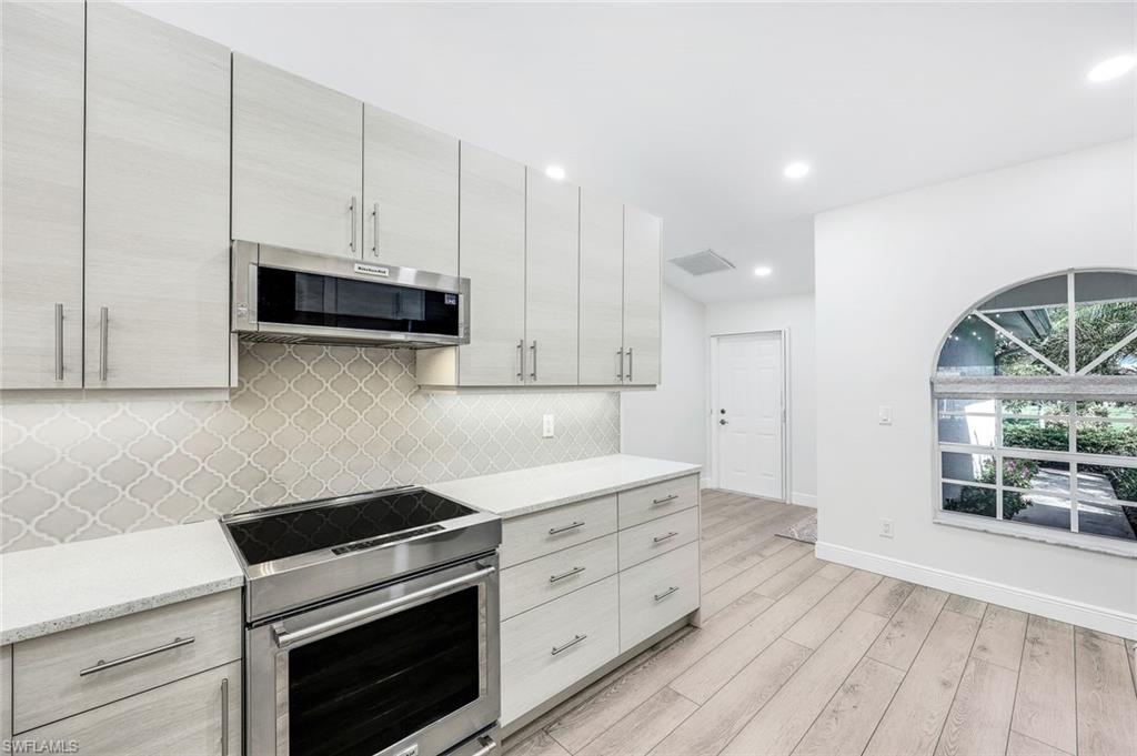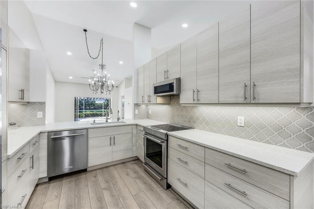 This stunning 3-bedroom, 2-bathroom Villa has been completely remodeled, offering modern elegance and comfort. Step inside to discover a brand-new designer kitchen featuring sleek cabinets, gorgeous quartz countertops, state-of-the-art appliances, a whole house water filtration system, and an instant hot water dispenser. The view from the kitchen overlooks the spacious, light, bright and airy living room with soaring vaulted ceilings, which is great for entertaining friends and family. The rear fully screened in extended lanai has serene breathtaking views of the long lake and beautiful oak tree. The lanai has a green foliage wall separating the neighboring villa that includes a sound barrier for ultimate privacy. Also installed is a remote controlled awning that fully extends, covering the lanai and creating your own private oasis, with just the right amount of sun and shade all day long. Inside, new luxury vinyl flooring throughout enhances the inviting atmosphere of the home. The primary bedroom, located at the rear of the house, boasts a huge walk-in closet, private bathroom, and direct access door to the screened-in lanai which is perfect for enjoying morning coffee or evening sunsets over the lake. One of the two guest bedrooms adjoins to the second bathroom which guests will be able to enjoy. The third bedroom features pocket sliding doors and a closet, which creates an ideal space for either a bedroom, separate sitting room, or a large home office. Looking out the front door, and right across the street, you'll find the large community pool. The attached 2 car garage was just completely refinished with brand new epoxy full flake floors in July 2024. The garage also includes a full screen with sliding panel doors, perfect for the cooler nights when you want to enjoy working in the garage or relaxing with neighbors. Located 9 miles from the white sandy beaches at Naples Pier and just 12 miles to Marco Island, this villa offers both convenience and tranquility. Shadowood Villas Community offers some of the lowest association fees in Naples making this an ideal choice for those seeking a primary residence, rental property, or a winter retreat. Also situated immediately adjacent to the private Wing South Airpark, this would make an incredible home and extremely unique opportunity for the avid aviator. Air traffic is extremely limited. This home is a MUST SEE! Don’t miss your chance to own this exceptional property in one of Naples’ most desirable locations.