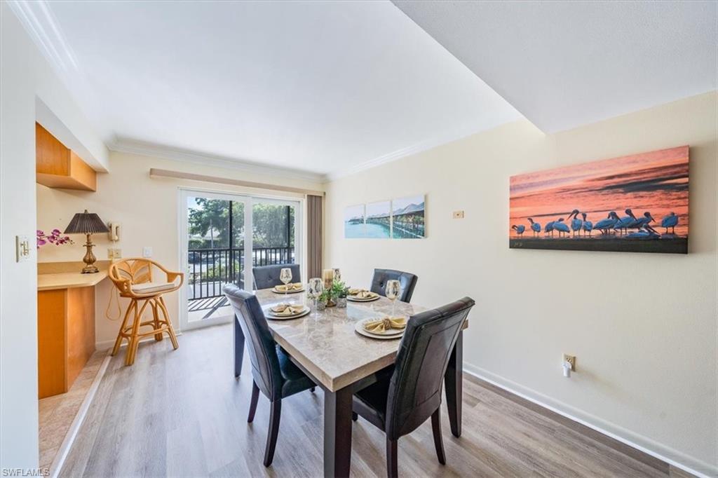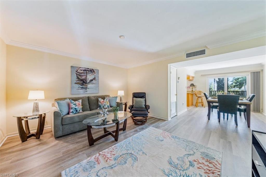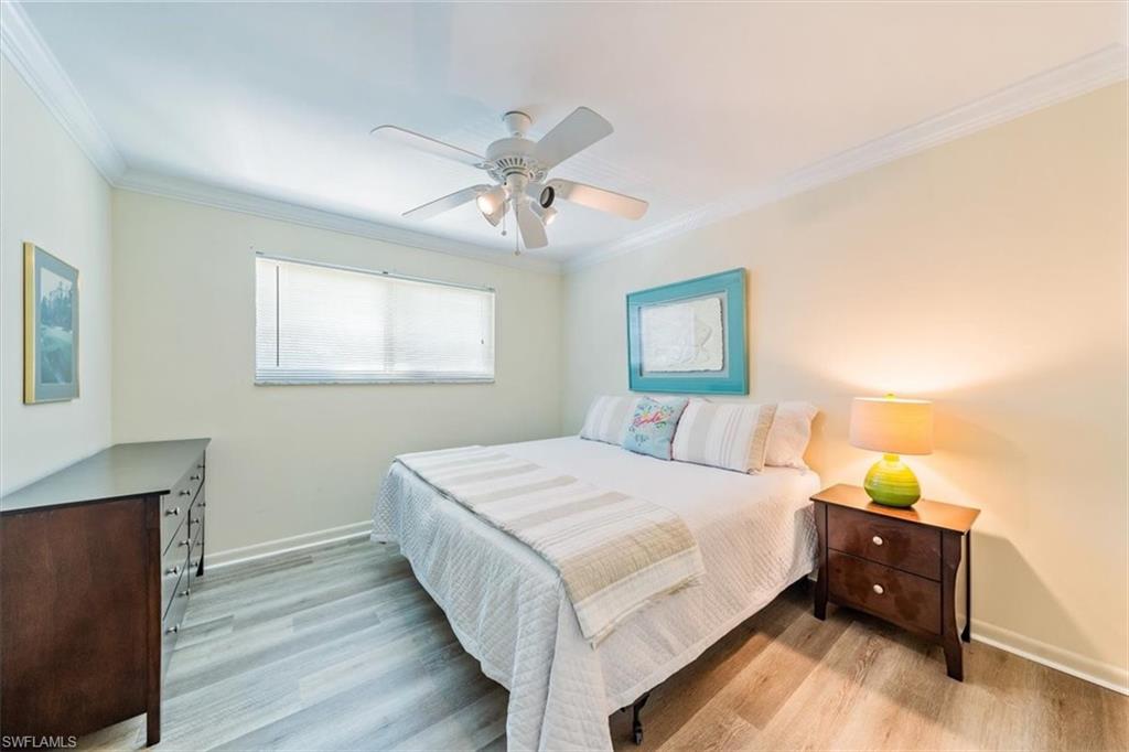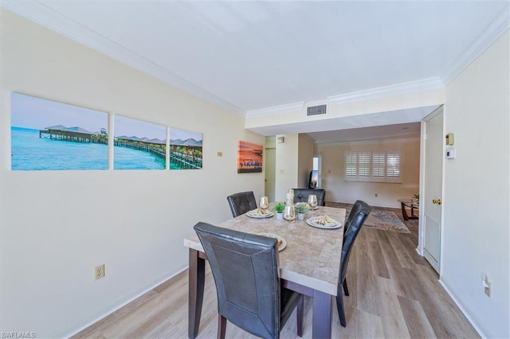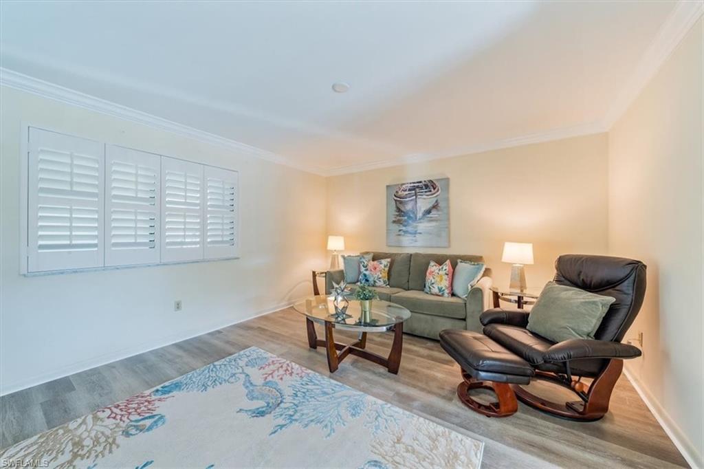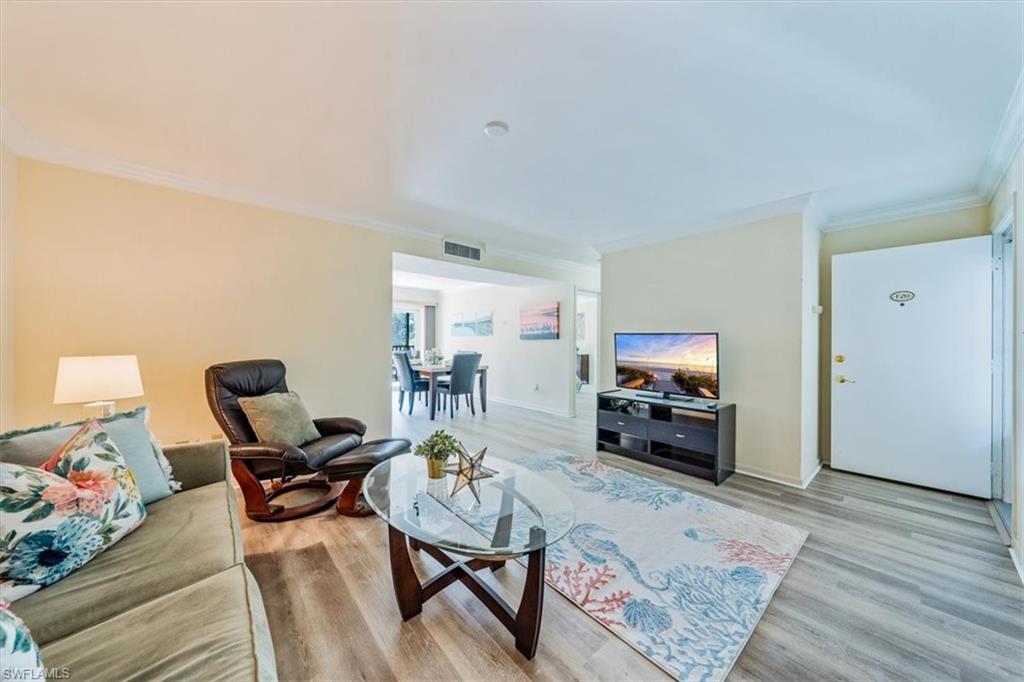 Discover the perfect blend of style and convenience in this beautifully updated 2-bedroom, 2-bathroom end unit, ideally located less than a mile from pristine beaches, vibrant shops, and popular restaurants. Situated on the second floor, this gem offers privacy, peace, and all the comforts of Florida living. Step inside to find luxury vinyl flooring, elegant crown molding, and a fresh coastal ambiance. The new AC (2022) and new water heater ensure comfort year-round, while impact glass sliders and windows paired with electric storm shutters provide added security and peace of mind. An additional feature is the convenience of additional storage space in the laundry room and a newer washing machine. Enjoy the Florida lifestyle on your private, screened-in lanai, perfect for relaxing or entertaining. With all the updates and being offered turnkey furnished, all you need to do is move in and enjoy! Hidden Lake Villas offers a resort lifestyle with social activities, tennis, a 37' x 52' geo-thermal heated pool, gas grills, clubhouse with exercise area, library and function room. Residents can obtain an optional membership to Park Shore Association for private beach access at Raymond Lutgert Park. Located in the heart of Naples with easy access to enjoy all that Southwest Florida has to offer.