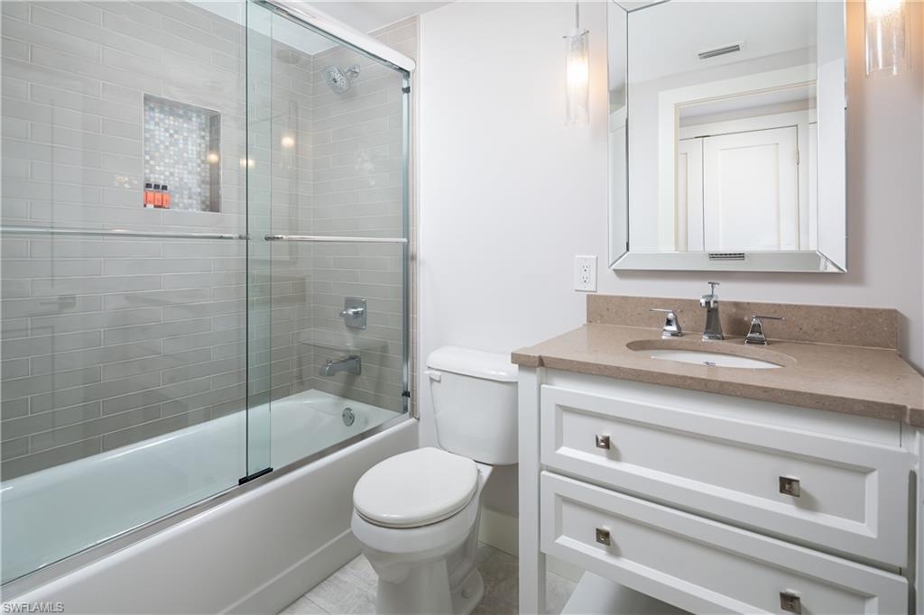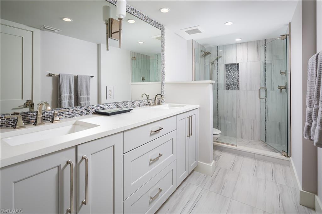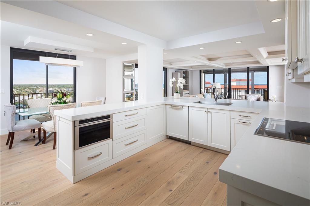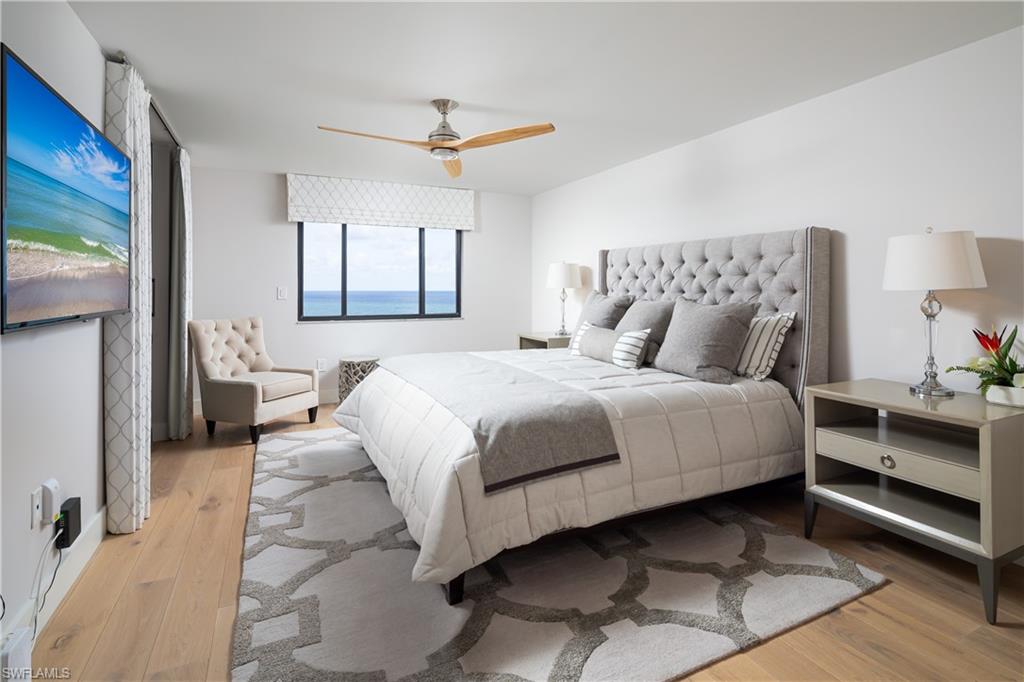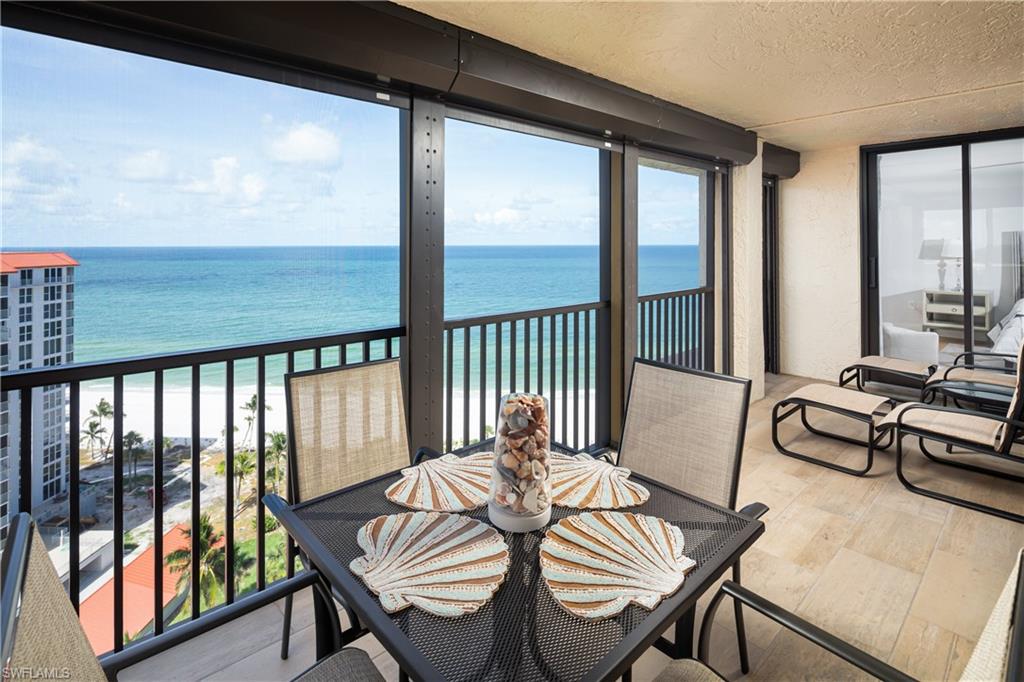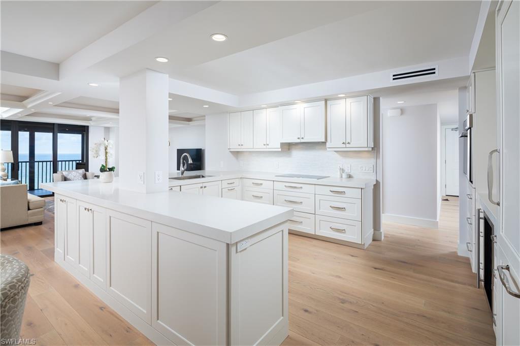 SPECTACULAR Remodel awaits upon the 15th floor in Vanderbilt Gulfside Building 2 - This building did not flood in Ian! Step inside to this coastal masterpiece, featuring exquisite hardwood floors, custom cabinetry and wrap around views of the beach, bay, and city skyline down Gulf Shore Drive. Featuring an ideal split bedroom plan centered around an open kitchen and great room, this turnkey furnished condo features a chef's kitchen, double-thick quartz countertops and stainless appliances including cooktop, wall oven and drawer microwave for ample prep and entertaining space. The dining space and great room are bordered by sliders out to open air balconies and all views center towards the Gulf with a spacious screened in balcony to capture magnificent sunset views. The beachfront master suite has access to the balcony and large window to wake up to the waves, as well as an oversized walk-in closet with custom built-ins and adjoining bathroom with dual sinks and tiled shower with glass accents. Two additional guest bedrooms sit at the back of the unit, with open air balconies perched for bay and gulf views, and two additional guest bathrooms, one as an en-suite. All bathrooms have been updated with fresh tiled showers, frameless glass, new vanities and quartz countertops. These 3 bedroom end units are rarely available in Vanderbilt Gulfside, a premiere beachfront community that features a gated entrance, impressive attended lobbies with on-site management and rich amenities. Residents enjoy a private storage cage and covered deeded parking, as well as 750 feet of beach frontage, the largest heated, salt water pool on Vanderbilt Beach, 2 guest suites, 2 tennis courts, Tesla charging stations, barbecue grills and an exercise facility all overlooking 8+acres of professionally landscaped grounds. Ample reserves and insurance in place!