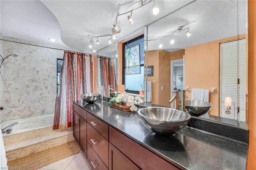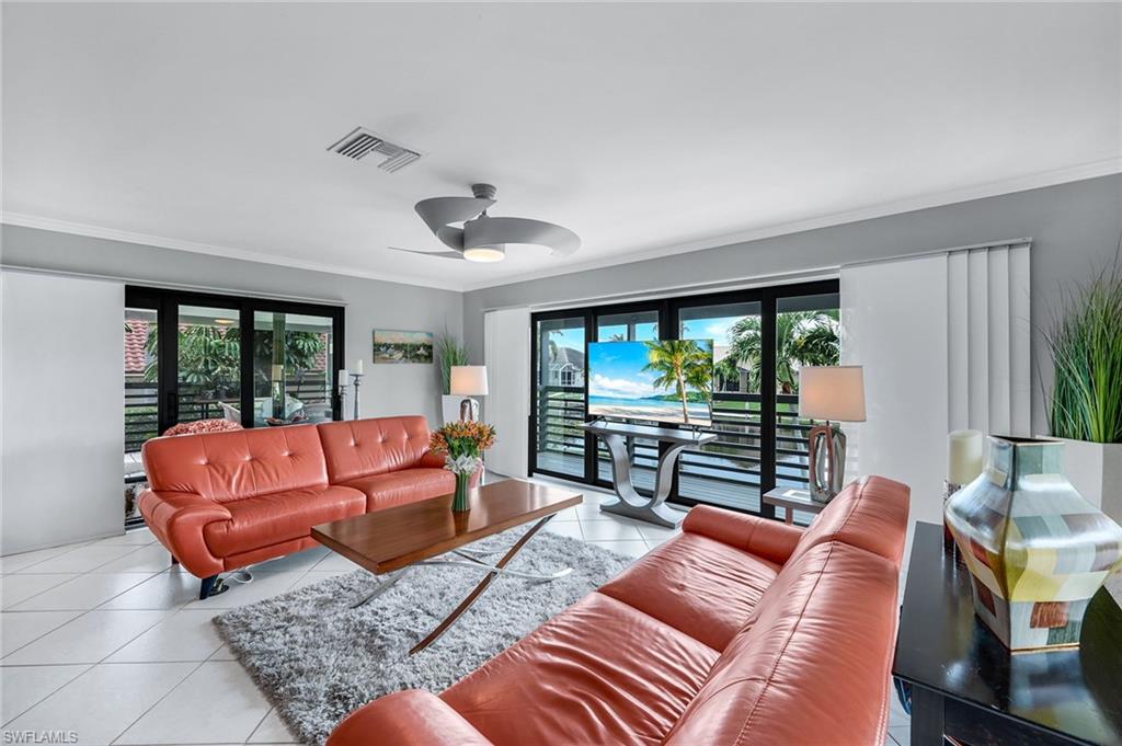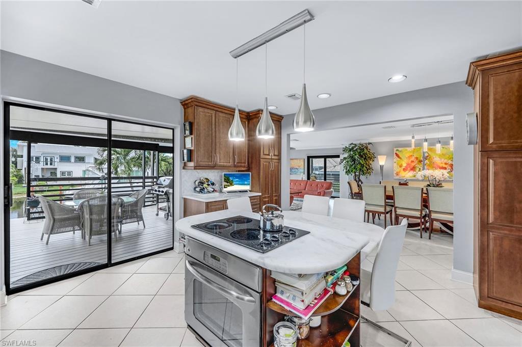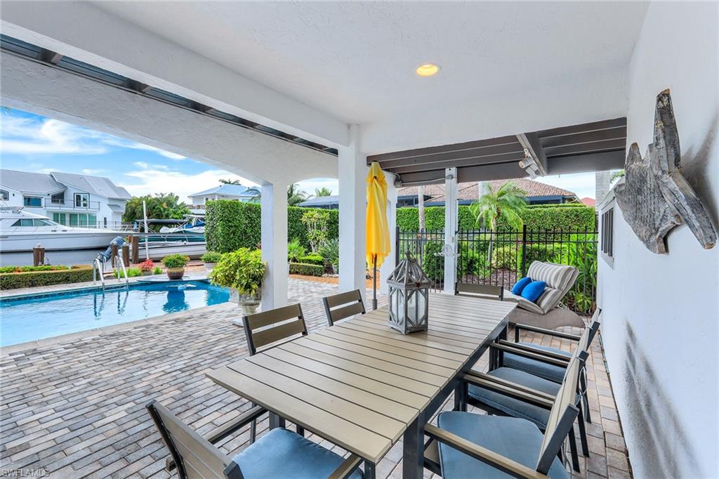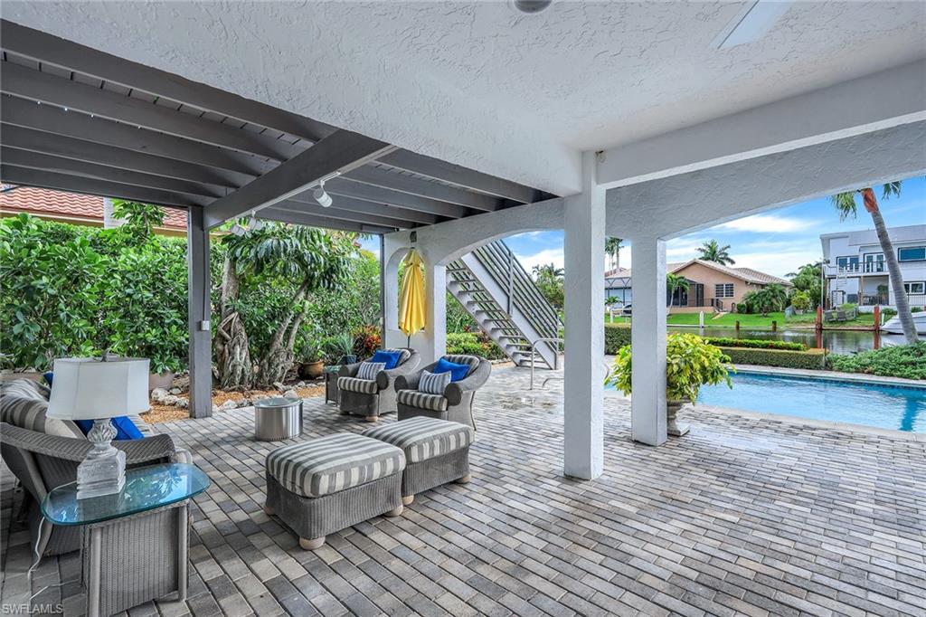 Enjoy quick direct access to the Marco River and Gulf of Mexico from this multi-level three-bedroom, three-bath home. This residence has the ultimate outdoor living space with multiple decks and a spacious open lanai with a pool providing a serene setting for relaxation. Southwest exposure for stunning sunsets, and long water canal views. Larger lot for more waterfront enjoyment with a dock and lift for the boater enthusiast. A warm and welcoming living area includes a spacious dining room that is perfect for entertaining and can seat up to 12 people. Open kitchen with island, breakfast bar, cooktop and custom cabinets. Two primary suites with a custom state-of-the-art walk-in closet. Beautifully maintained landscaping and fully fenced-in backyard. New roof in 2018, circular paver driveway and some sliders are impact glass. Surrounded by many luxurious homes, this prestigious neighborhood is where tranquility is at its best. There is an additional den and full bath on the main level that is non-conforming and may or may not be insurable.
