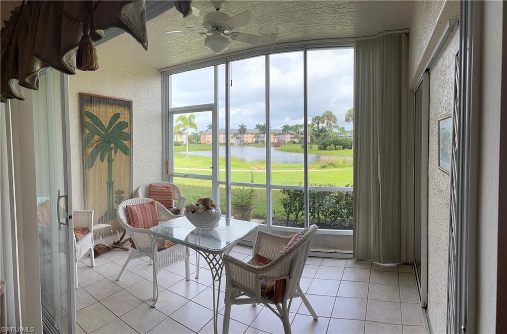 An active community and a lovely 2 BR (primary has walk-in closet), plus flex den (could be 3rd bedroom), 2 BA first floor condo, who could ask for more? This unit has luxury vinyl planking throughout (except wet areas); new a/c in 2020, mew water heater and new roof in 2022. The kitchen with granite counters, a lanai with plexiglass/-screen enclosure that overlooks the pond and golf holes with water feature make this condo extra special. It comes with an assigned parking space (#10) and a private storage closet. Breckenridge is an active community with something for everyone, including an 18-hole par-3 golf course, 8 tennis courts, 3 pickleball courts, 3 bocce courts, 6 shuffleboard courts, 5 pools, a clubhouse with catering kitchen, exercise room, library, storage area for boats and RVs and close vicinity to the beaches, the airport and Florida Gulf Coast University. This lovely condo has everything you need for a comfortable stay; furniture is negotiable. Come see it today; you won't be disappointed.