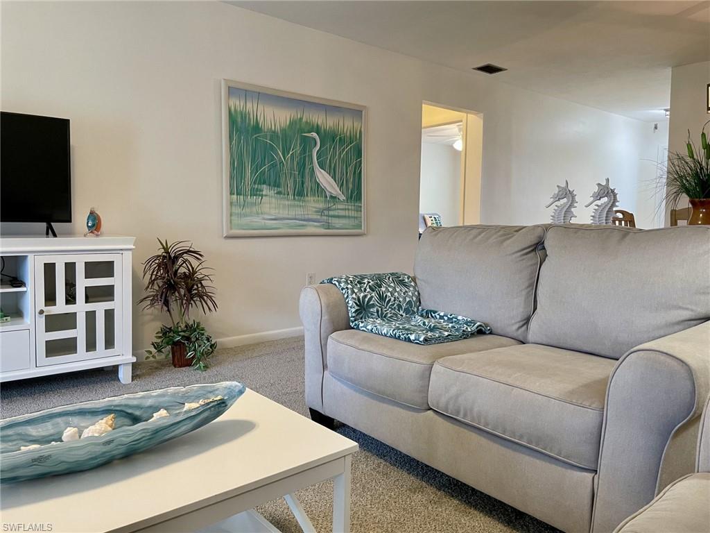Welcome to this fun, friendly and highly sought after community, perfect for both year-round or seasonal living! Affordable HOA fees with an extensive list of inclusions, no special assessments, and located in Flood Zone X500. The interior has been freshly painted and carpeted throughout, creating a move-in-ready space; comes mostly furnished. Ideally located just minutes from shopping, golf courses, beaches, and downtown Naples, this beautifully updated 2nd-floor unit offers an exceptional indoor-outdoor living experience. The sliding glass-enclosed lanai adds extra air-conditioned living space and provides serene views of the tranquil pool and courtyard. Additional conveniences include an in-unit washer/dryer, assigned covered parking, and a separate storage closet. Plus, your small furry friend is welcome in this expanded living area, which boasts peaceful views of the landscaped ground. This is truly a hidden gem in Naples!