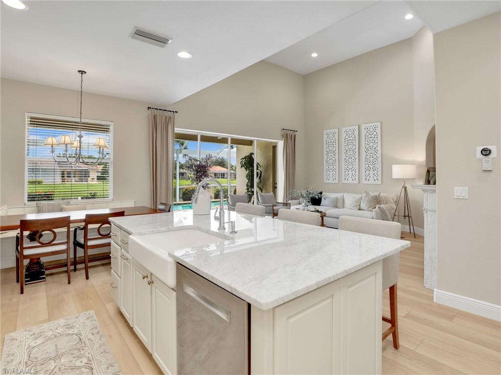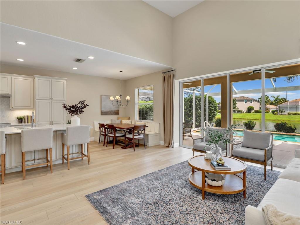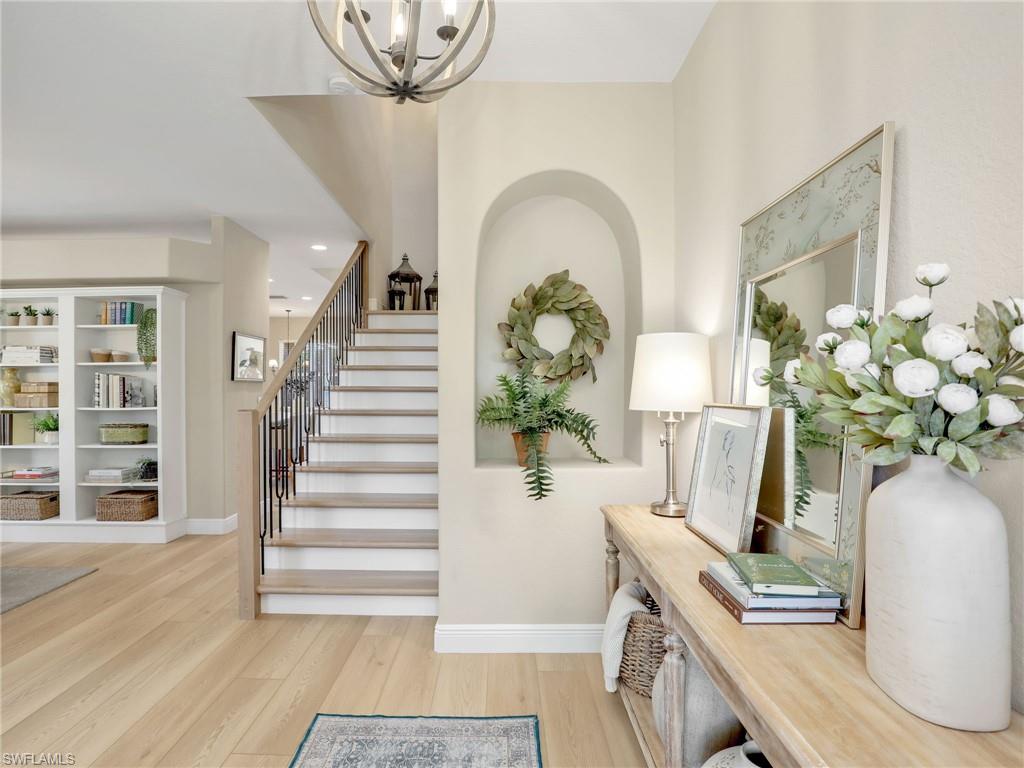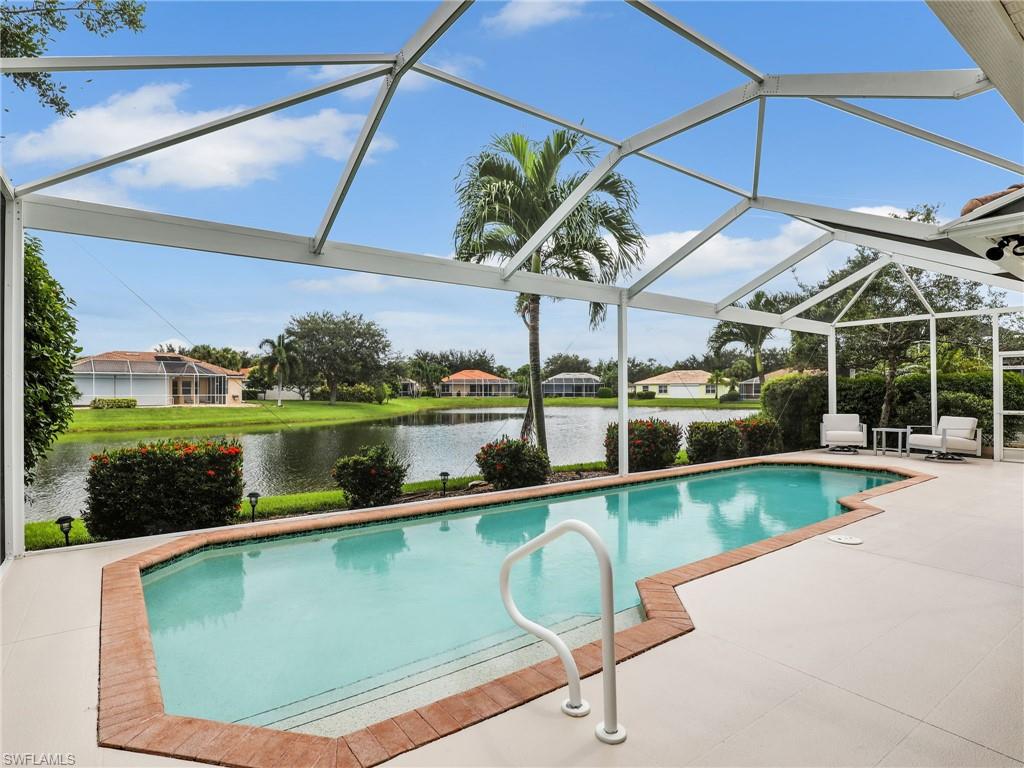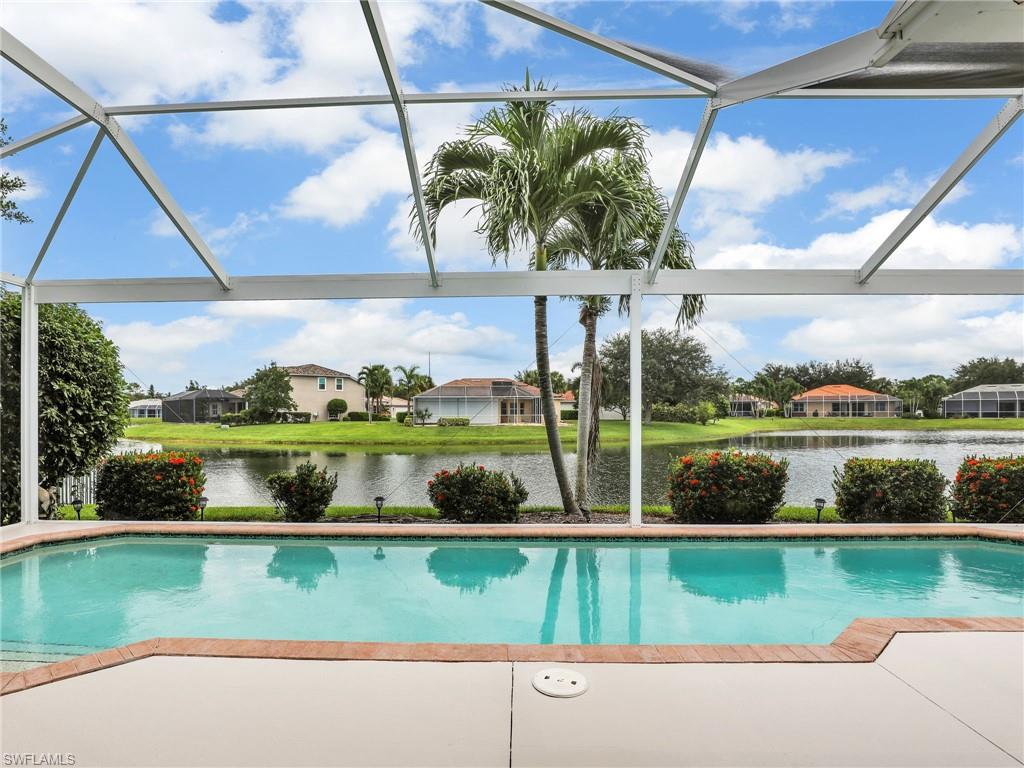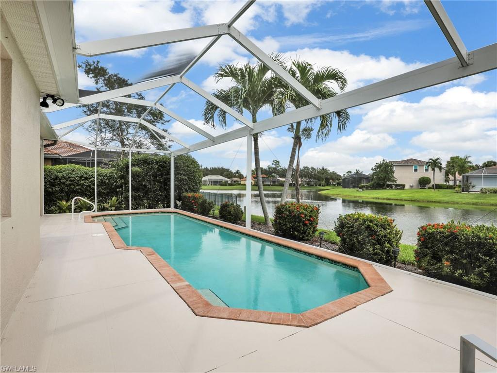 NEWLY RENOVATED. Situated on a quiet cul-de-sac, this beautiful lakefront pool Greenbriar Grande model spanning over 3300 square feet, boasts 5 bedrooms, ( including 1 UPSTAIRS AND 1 DOWNSTAIRS MASTER bedrooms ) 3.5 baths. This home offers everything your family needs, from a modern design to the perfect layout for privacy and comfort. Whether you have a large family, adult children, or in-laws, the space is thoughtfully crafted to meet everyone’s needs. Step inside to find exquisite modern finishes and neutral tones that create a warm, inviting atmosphere. The attention to detail is remarkable, making this home feel as stylish as it is welcoming. With TWO spacious primary en-suites, this home offers unparalleled flexibility. One suite is conveniently located on the main level with tranquil lake and pool views, while the second is a private retreat upstairs. Whether you’re accommodating family, guests, in-laws, or simply want a luxurious retreat, this home is designed to provide comfort, privacy, and flexibility. The open-concept kitchen is an entertainer’s dream. Featuring high-end finishes, including marble countertops, a large 8-foot island, a farmhouse sink, and premium Bosch stainless steel appliances, it's the perfect blend of function and style. The charming built-in seating adds storage and space, making it ideal for casual meals or gathering with family and friends. Natural light floods the home through large windows and pocketing glass sliding doors, offering breathtaking views of the serene lake that serves as the backdrop for the living and dining areas. Step outside to your very own slice of paradise with a beautifully landscaped yard, elegant lighting, and a pool area overlooking the lake. This tranquil outdoor space is perfect for enjoying peaceful moments in the Florida sunshine. Don’t miss out on the opportunity to experience the best of Naples living in this exceptional lakefront home! NEW LARGE BARREL TILE ROOF 2018, POOL CAGE 2019, AC UNITS 2019, WATER HEATER 2018