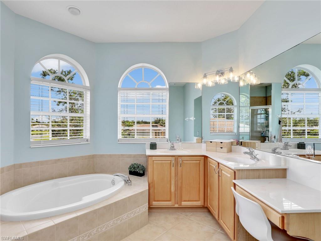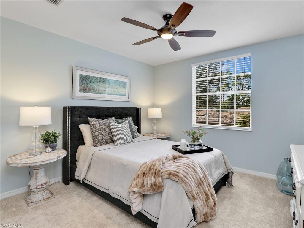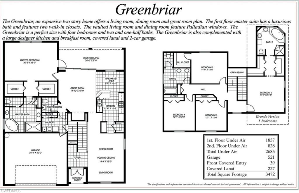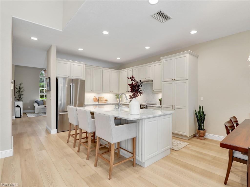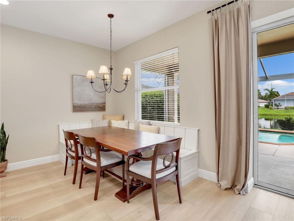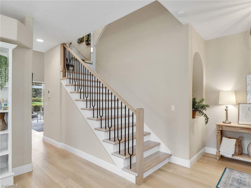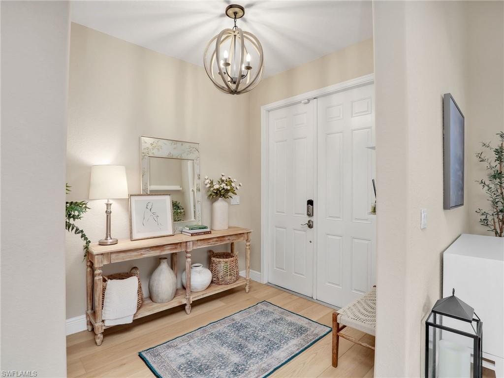 NEWLY RENOVATED. Situated on a quiet cul-de-sac, this beautiful lakefront pool Greenbriar Grande model spanning over 3300 square feet, boasts 5 bedrooms, ( including 1 UPSTAIRS AND 1 DOWNSTAIRS MASTER bedrooms ) 3.5 baths. This home offers everything your family needs, from a modern design to the perfect layout for privacy and comfort. Whether you have a large family, adult children, or in-laws, the space is thoughtfully crafted to meet everyone’s needs. Step inside to find exquisite modern finishes and neutral tones that create a warm, inviting atmosphere. The attention to detail is remarkable, making this home feel as stylish as it is welcoming. With TWO spacious primary en-suites, this home offers unparalleled flexibility. One suite is conveniently located on the main level with tranquil lake and pool views, while the second is a private retreat upstairs. Whether you’re accommodating family, guests, in-laws, or simply want a luxurious retreat, this home is designed to provide comfort, privacy, and flexibility. The open-concept kitchen is an entertainer’s dream. Featuring high-end finishes, including marble countertops, a large 8-foot island, a farmhouse sink, and premium Bosch stainless steel appliances, it's the perfect blend of function and style. The charming built-in seating adds storage and space, making it ideal for casual meals or gathering with family and friends. Natural light floods the home through large windows and pocketing glass sliding doors, offering breathtaking views of the serene lake that serves as the backdrop for the living and dining areas. Step outside to your very own slice of paradise with a beautifully landscaped yard, elegant lighting, and a pool area overlooking the lake. This tranquil outdoor space is perfect for enjoying peaceful moments in the Florida sunshine. Don’t miss out on the opportunity to experience the best of Naples living in this exceptional lakefront home! NEW LARGE BARREL TILE ROOF 2018, POOL CAGE 2019, AC UNITS 2019, WATER HEATER 2018