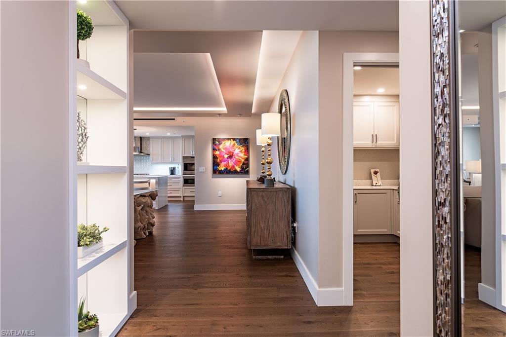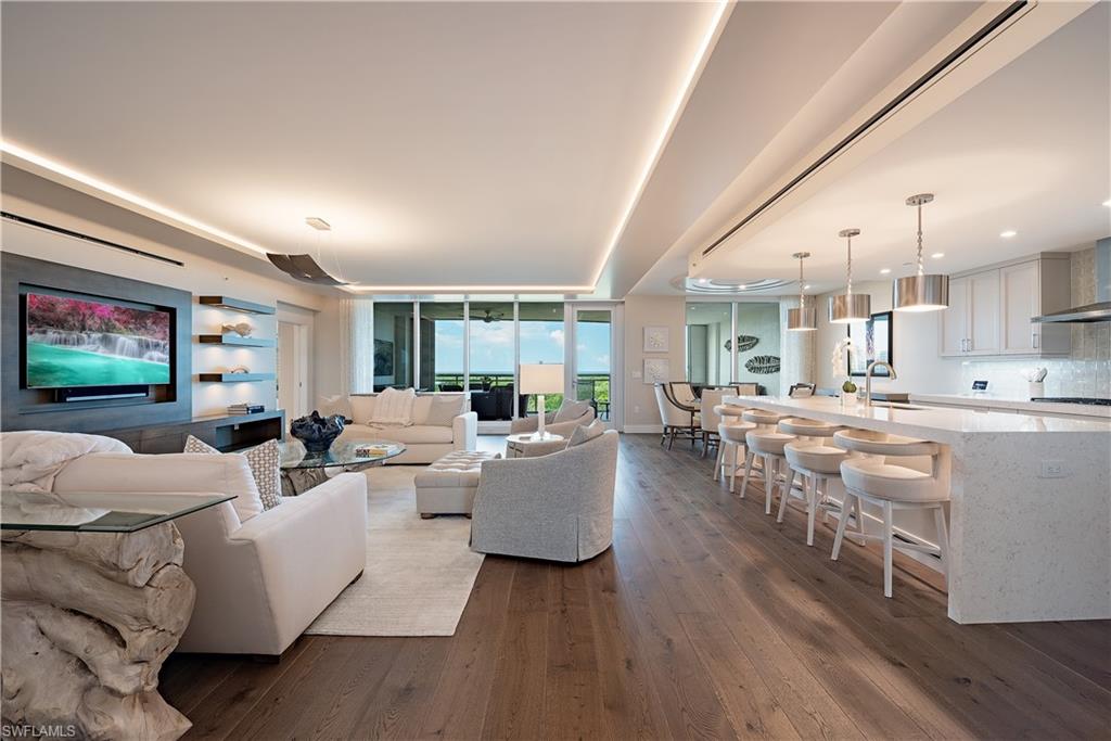 Price reduced over $700K since December, enjoy remainder of this season with immediate occupancy. Welcome to Kalea Bay unit 602, a sophisticated turn-key furnished Sky Home in Kalea Bay. Step off the elevator directly into your expansive home of just under 3300SF of interior space. Amazing views through walls of floor to ceiling glass to Wiggins Pass and sunsets over the Gulf. Relax on the 500+ SF curvilinear designed lanai with contemporary glass rails and recently installed hurricane shutters. Popular Great Room floor plan seamlessly combines style and function and includes 3 bedrooms and 3.5 baths along with spacious Den/Office. The welcoming Great Room is enormous with multiple seating areas and wood toned custom entertainment wall with lighted floating shelves. All floors throughout unit are Legno Bastone wide plank hardwood and complement the neutral toned transitional furnishings. Gourmet white kitchen features Wolf and Sub-Zero appliances including natural gas cooktop and adjoining Butler Pantry has wine cooler. Master suite features floor to ceiling western views and has opulent bath with floating tub, dual vanities and generous sized walk- in custom closet. Two guest rooms are ensuite and located on opposite side of unit affording privacy for all. Recent upgrades include fresh paint, wallpaper and updated window treatments including electric shades in all rooms. Unit has stunning lighting with full Lutron automation. Tower 100 includes amazing gallery type entrance lobby with captivating mural sized photographs. The roof top features roof top pool, sky lounge and open-air fitness area. World Class amenities continue at the 100,000 SF Kalea Bay Club amenity center featuring 3 pools, two restaurants, expansive decks, two open air bars, teen lounge/kids room and State of the Art Wellness Center. Convenient to the Club are also 4 tennis courts and 8 pickleball courts. Your guests that appreciate an extra level of privacy can also enjoy overnight accommodations at the on- site Bay Cottages