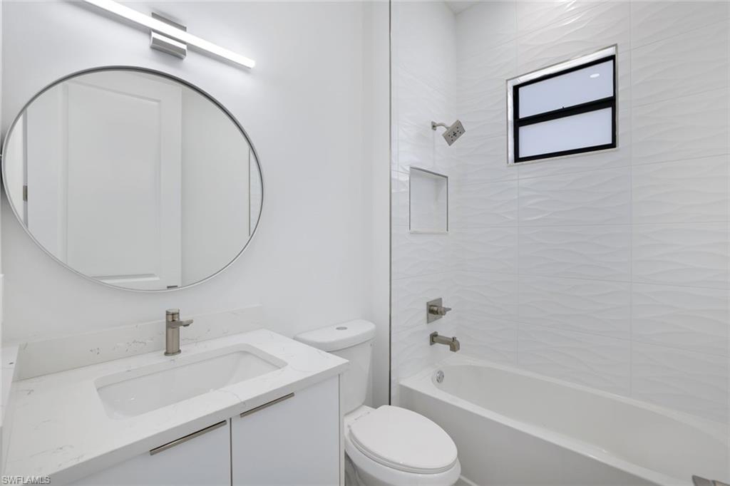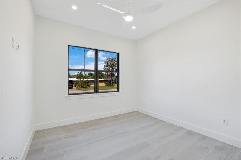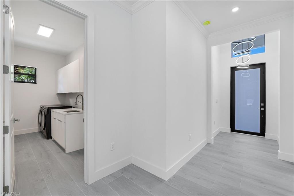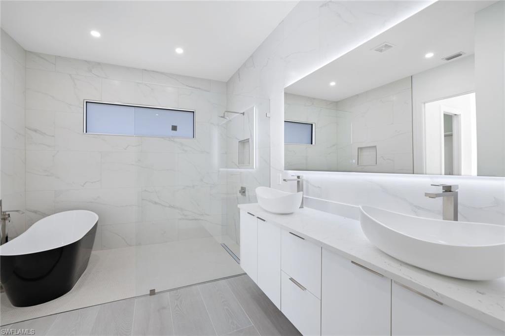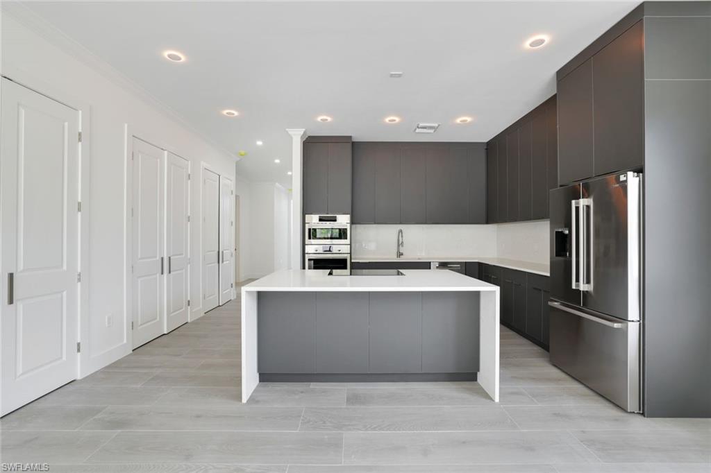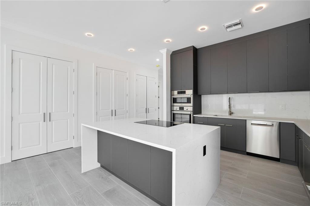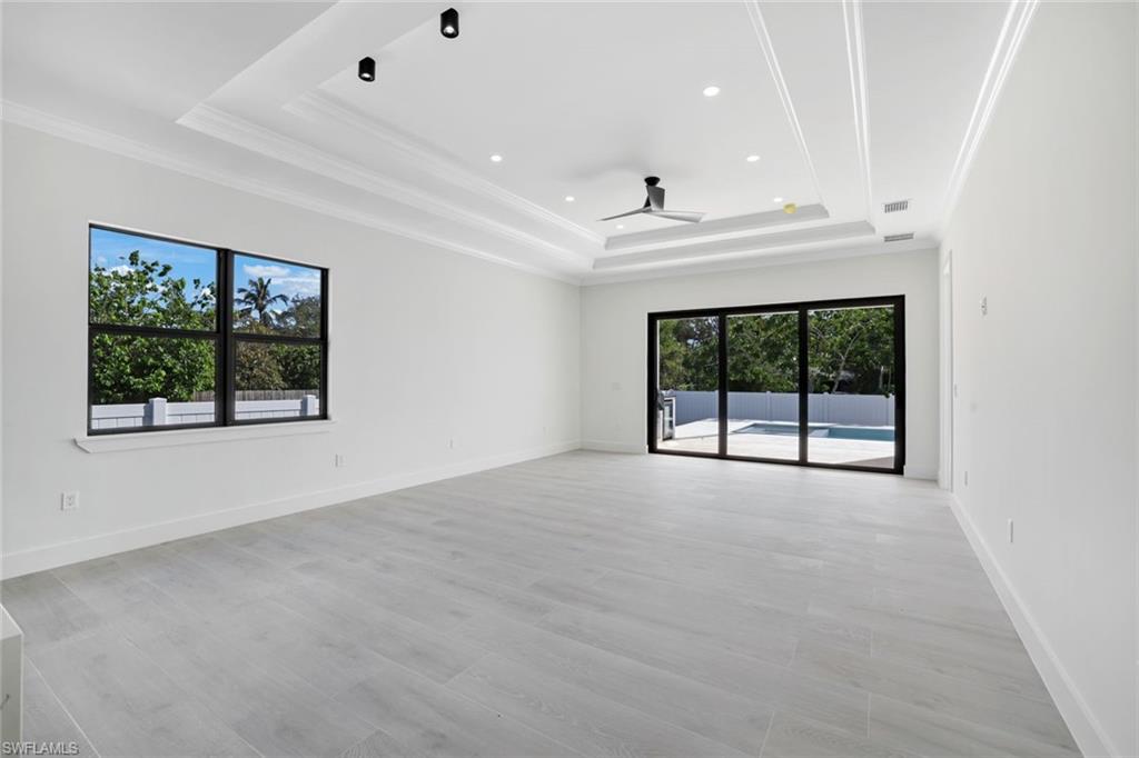 Stunning new construction offering modern luxury, clean architectural lines, and exceptional natural light throughout. This contemporary residence welcomes you with an impressive front elevation featuring dramatic rooflines, oversized impact windows, and gorgeous wood-accent garage doors. Inside, the open-concept layout showcases soaring ceilings, expansive living spaces, and seamless indoor–outdoor flow. The designer kitchen is the showpiece of the home—equipped with sleek flat-panel cabinetry, a large quartz waterfall island, premium stainless-steel appliances, and abundant storage. Multiple kitchen angles show a blend of elegance and functionality perfect for cooking and entertaining. The living and dining areas are bright and spacious, enhanced by wide-plank flooring, recessed lighting, and panoramic windows that frame the outdoor views. Sliding glass doors open to a beautifully finished covered lanai and pool area, creating the ideal setting for Florida living. Spa-inspired bathrooms feature floating vanities, frameless glass showers, freestanding soaking tubs, and modern matte-black fixtures. The bedrooms offer generous space, large windows, and clean, contemporary finishes. Step outside to the resort-style backyard with a sparkling pool, sun shelf, and ample deck space perfect for relaxing and hosting guests. The home sits on a manicured lot with fresh landscaping, presenting a crisp and polished curb appeal. With its modern design, luxury finishes, and thoughtfully crafted layout, this home delivers the perfect blend of sophistication, comfort, and contemporary Florida style.