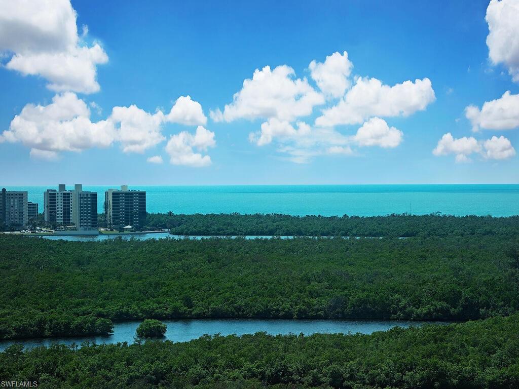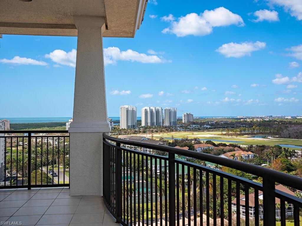 Experience unparalleled luxury in this stunning sky residence, accessible via a private elevator that opens directly into the spacious living area with volume ceilings, complemented by a secure gated Private 2-Car Enclosed Garage with private Storage Space at Nevis at Cove Towers in North Naples. Imagine owning one of the three most-coveted penthouse end-units as your paradise home with this highly desirable 17th-floor unit. With panoramic views, each window frames picturesque scenes of the Gulf of Mexico, bay, lush tropical landscapes, and the newly designed Kinsale Golf Course. Inside, elegant wood-plank flooring flows seamlessly throughout the main living area, enhanced by a stylish wet bar complete with a refrigerator and ice maker—perfect for entertaining guests. The open and airy kitchen features seating on one side and a den on the other, creating an inviting space for both relaxation and casual dining. The primary suite is a haven of tranquility, featuring custom closets and a spa-like bathroom equipped with a jetted tub, double sinks, and a separate shower. Two additional en-suite guest bedrooms provide generous accommodations, sharing a second balcony for enjoying the views. This extraordinary residence also includes a private two-car garage and ample storage space. The exclusive Calypso Club provides resort-style amenities such as a pool/spa, exercise room, gas grills, and guest suites. Upon closing, the buyer pays a one-time $8,750 Transferable Membership fee for the Tarpon Cove Yacht & Racquet Club, which offers a full-service restaurant, tiki bar, newly constructed tennis courts, and pickleball. Ideally located, this beautiful condo is just minutes from Mercato and Waterside Shops and a short drive to 3rd St S & 5th Ave S in Olde Naples where you can enjoy fine dining, world-class shopping, and pristine white sand beaches.