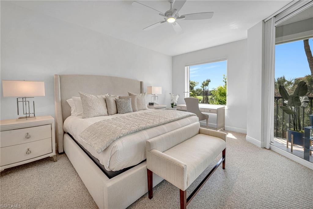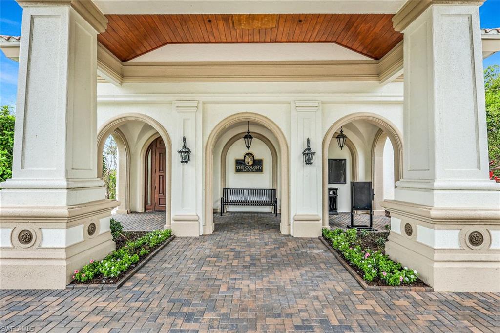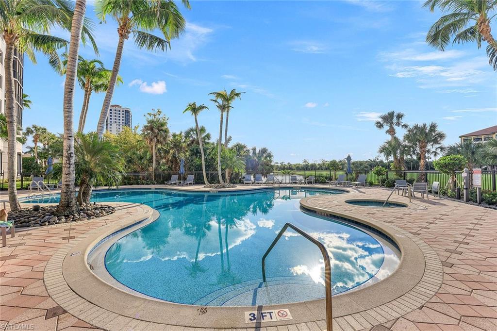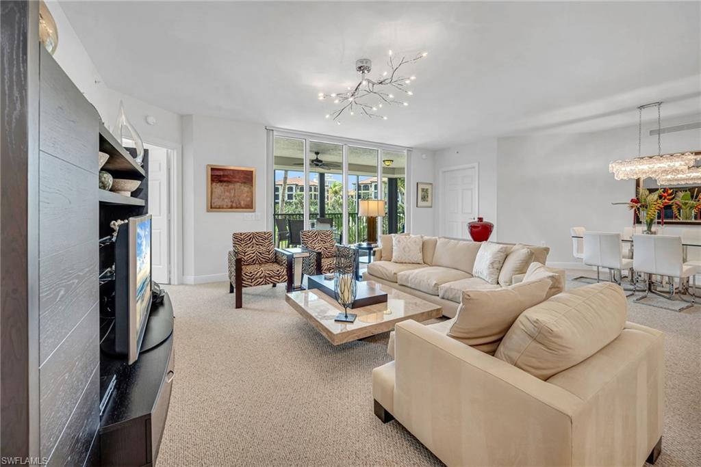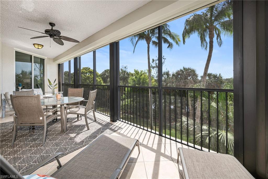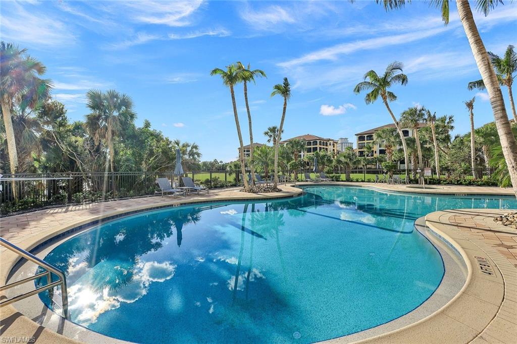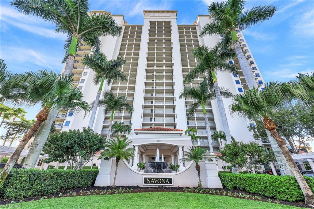 In a lush, tropical oasis, this second-floor resort-style condominium offers an exquisite blend of luxury and tranquility. As you relax on the screened lanai, a gentle breeze greets you amid the sound of the rustling of palm trees. Upon entering, you're greeted by an airy and inviting space, flooded with natural light pouring in through expansive windows that frame breathtaking views of the surrounding landscape. The interior design seamlessly marries modern elegance with coastal charm, creating a serene ambiance that instantly puts you at ease. The living area beckons with plush furnishings, providing the ideal spot to unwind after a day on the golf course. Adjacent to the living room, sliding glass doors lead out to a private lanai, where you can savor your morning coffee while soaking in vistas of the lake and golf course beyond. The kitchen is a delight, boasting sleek granite countertops, stainless steel appliances and ample cabinet space for all your culinary essentials. Whether you're whipping up a quick snack or preparing a gourmet feast, this kitchen offers style and functionality. Retreat to the primary suite, a luxurious sanctuary designed for ultimate relaxation. Here, you'll find a sumptuous king-sized bed adorned with crisp linens, a spacious walk-in closet, and an en-suite bath complete with a deep soaking tub and separate glass-enclosed shower. Sliding glass doors in the bedroom lead to a private lanai, where you can unwind under the stars before retiring for the night. Hurricane shutters provide privacy and protection. Guest bedrooms are separated offering visitors privacy with en-suite baths. Navona offers a sparkling swimming pool, a well-equipped fitness center, a movie theater, pool pavilion and private social room. Overflow family and friends will enjoy newly renovated guest suites. The Colony Golf & Country Club community is close to nearby Coconut Point Mall, with dining, shopping and entertainment, and the airport is a quick 20-minute drive. The Bay Club is a private waterfront restaurant exclusive to Colony residents. There is also a private beach island accessed by a nearby water shuttle, and canoe and kayak, fitness, pickleball, tennis and bocce complete your luxury lifestyle!