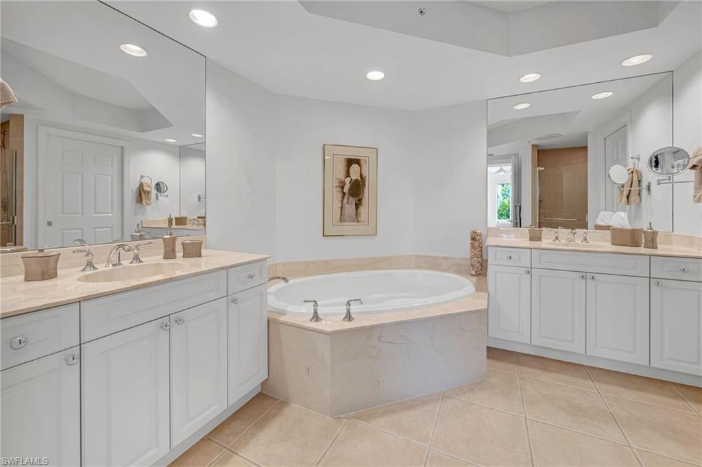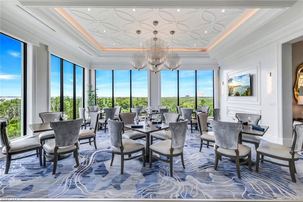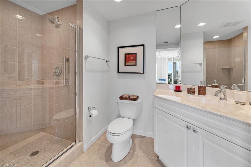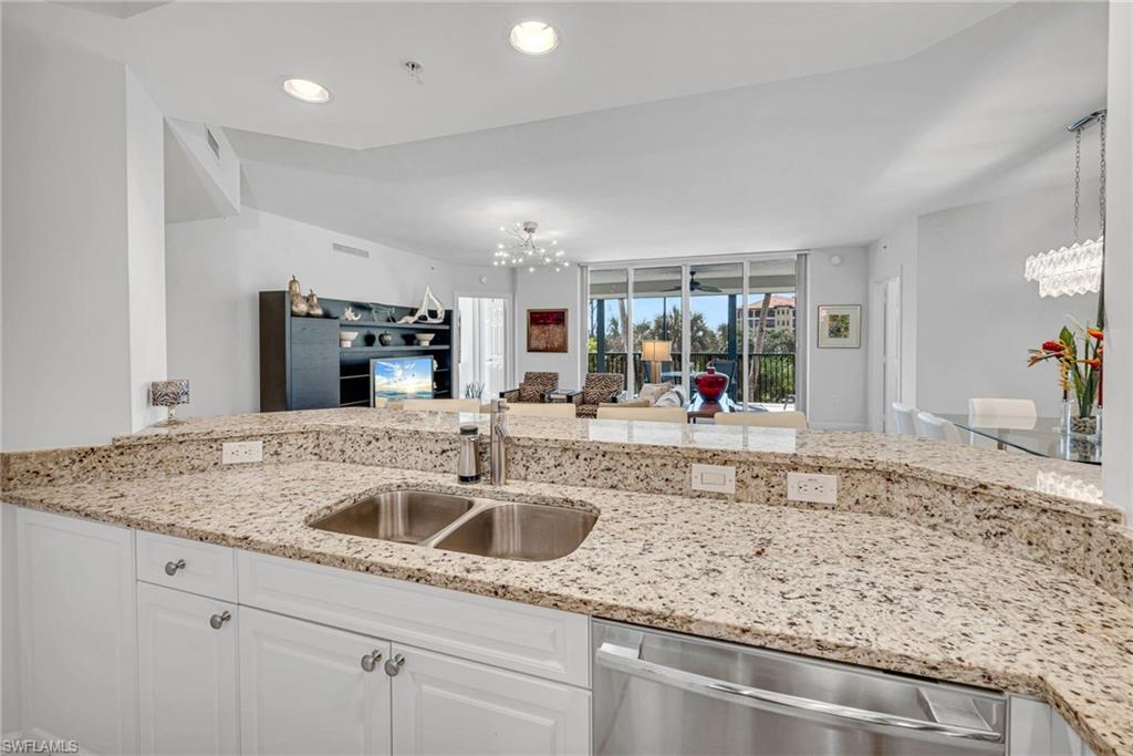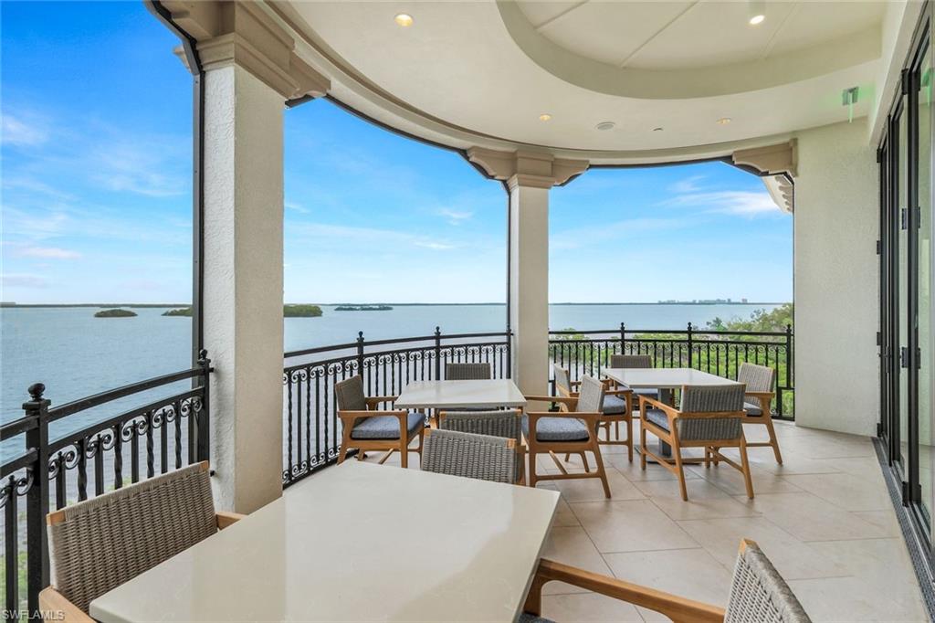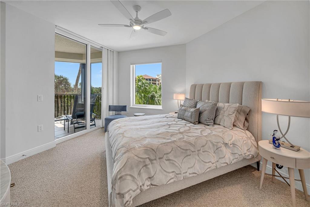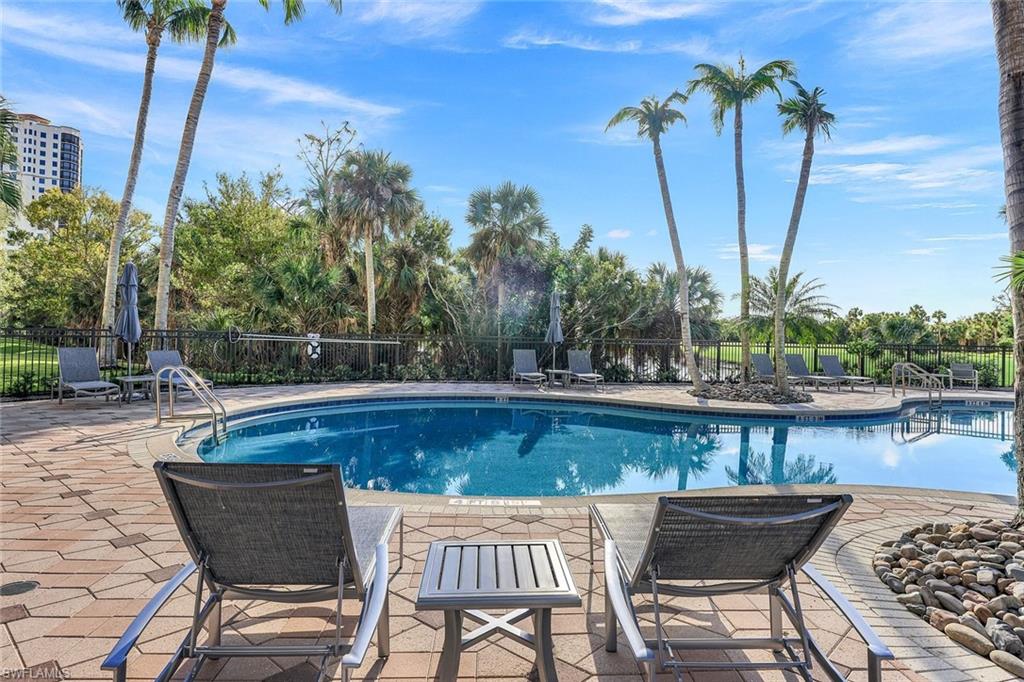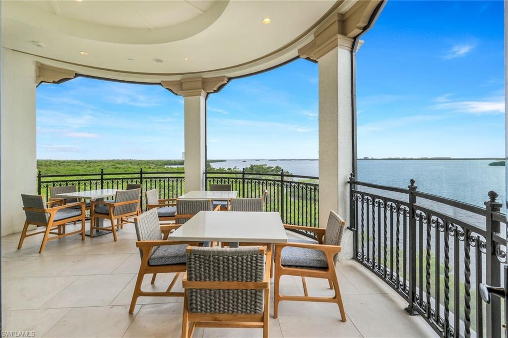 In a lush, tropical oasis, this second-floor resort-style condominium offers an exquisite blend of luxury and tranquility. As you relax on the screened lanai, a gentle breeze greets you amid the sound of the rustling of palm trees. Upon entering, you're greeted by an airy and inviting space, flooded with natural light pouring in through expansive windows that frame breathtaking views of the surrounding landscape. The interior design seamlessly marries modern elegance with coastal charm, creating a serene ambiance that instantly puts you at ease. The living area beckons with plush furnishings, providing the ideal spot to unwind after a day on the golf course. Adjacent to the living room, sliding glass doors lead out to a private lanai, where you can savor your morning coffee while soaking in vistas of the lake and golf course beyond. The kitchen is a delight, boasting sleek granite countertops, stainless steel appliances and ample cabinet space for all your culinary essentials. Whether you're whipping up a quick snack or preparing a gourmet feast, this kitchen offers style and functionality. Retreat to the primary suite, a luxurious sanctuary designed for ultimate relaxation. Here, you'll find a sumptuous king-sized bed adorned with crisp linens, a spacious walk-in closet, and an en-suite bath complete with a deep soaking tub and separate glass-enclosed shower. Sliding glass doors in the bedroom lead to a private lanai, where you can unwind under the stars before retiring for the night. Hurricane shutters provide privacy and protection. Guest bedrooms are separated offering visitors privacy with en-suite baths. Navona offers a sparkling swimming pool, a well-equipped fitness center, a movie theater, pool pavilion and private social room. Overflow family and friends will enjoy newly renovated guest suites. The Colony Golf & Country Club community is close to nearby Coconut Point Mall, with dining, shopping and entertainment, and the airport is a quick 20-minute drive. The Bay Club is a private waterfront restaurant exclusive to Colony residents. There is also a private beach island accessed by a nearby water shuttle, and canoe and kayak, fitness, pickleball, tennis and bocce complete your luxury lifestyle!