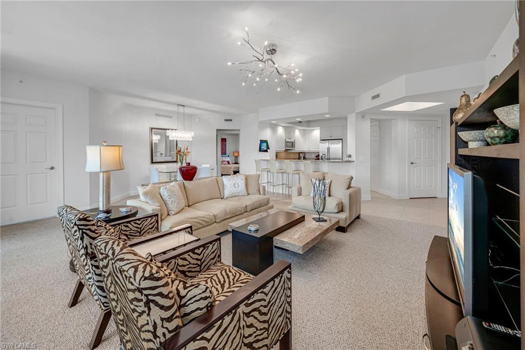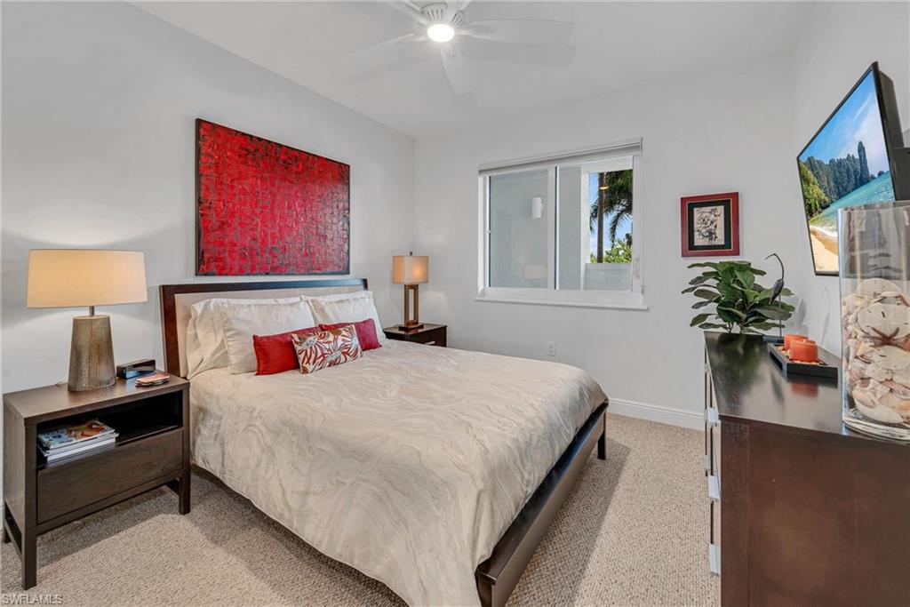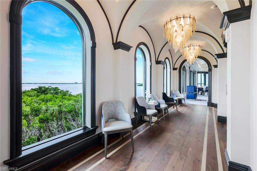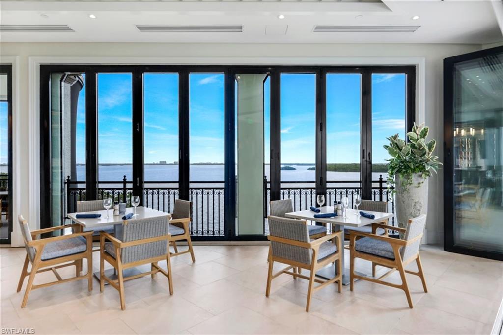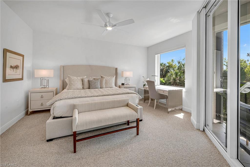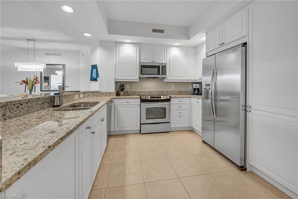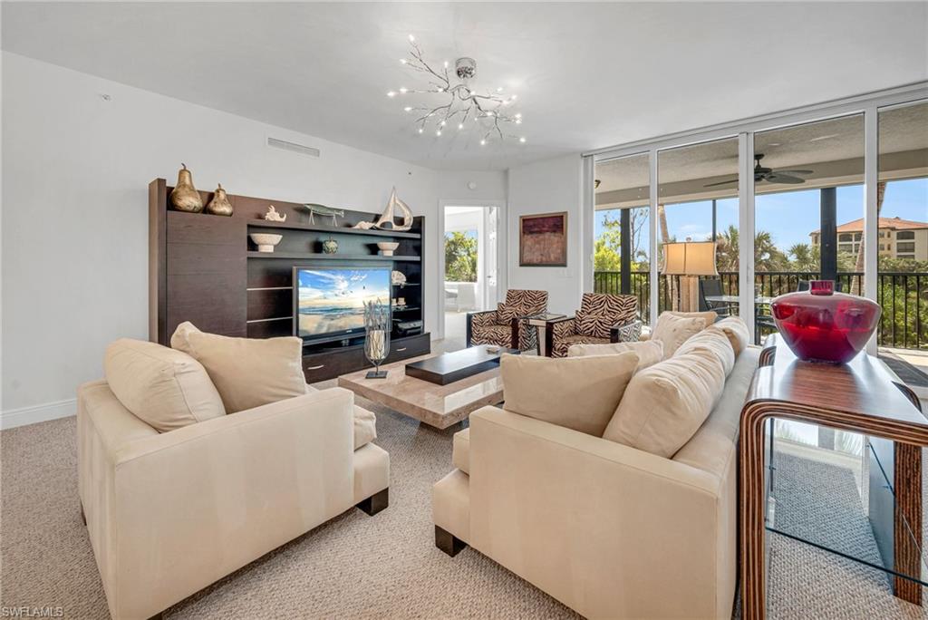 In a lush, tropical oasis, this second-floor resort-style condominium offers an exquisite blend of luxury and tranquility. As you relax on the screened lanai, a gentle breeze greets you amid the sound of the rustling of palm trees. Upon entering, you're greeted by an airy and inviting space, flooded with natural light pouring in through expansive windows that frame breathtaking views of the surrounding landscape. The interior design seamlessly marries modern elegance with coastal charm, creating a serene ambiance that instantly puts you at ease. The living area beckons with plush furnishings, providing the ideal spot to unwind after a day on the golf course. Adjacent to the living room, sliding glass doors lead out to a private lanai, where you can savor your morning coffee while soaking in vistas of the lake and golf course beyond. The kitchen is a delight, boasting sleek granite countertops, stainless steel appliances and ample cabinet space for all your culinary essentials. Whether you're whipping up a quick snack or preparing a gourmet feast, this kitchen offers style and functionality. Retreat to the primary suite, a luxurious sanctuary designed for ultimate relaxation. Here, you'll find a sumptuous king-sized bed adorned with crisp linens, a spacious walk-in closet, and an en-suite bath complete with a deep soaking tub and separate glass-enclosed shower. Sliding glass doors in the bedroom lead to a private lanai, where you can unwind under the stars before retiring for the night. Hurricane shutters provide privacy and protection. Guest bedrooms are separated offering visitors privacy with en-suite baths. Navona offers a sparkling swimming pool, a well-equipped fitness center, a movie theater, pool pavilion and private social room. Overflow family and friends will enjoy newly renovated guest suites. The Colony Golf & Country Club community is close to nearby Coconut Point Mall, with dining, shopping and entertainment, and the airport is a quick 20-minute drive. The Bay Club is a private waterfront restaurant exclusive to Colony residents. There is also a private beach island accessed by a nearby water shuttle, and canoe and kayak, fitness, pickleball, tennis and bocce complete your luxury lifestyle!