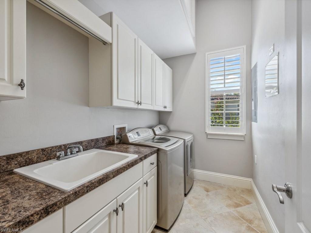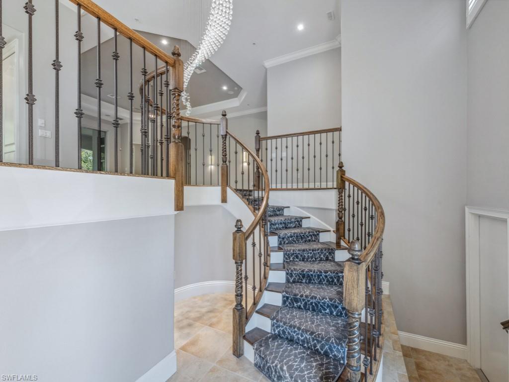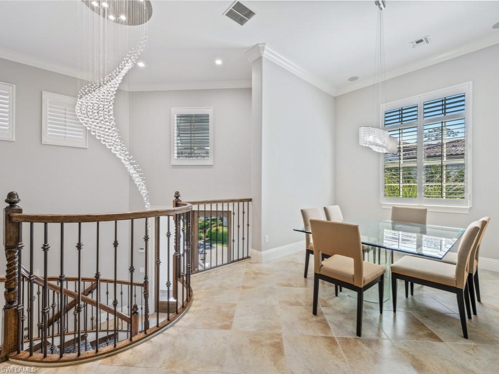 Located in the beautiful Mediterra Golf & Country Club - NEWLY RENOVATED PRIVATE BEACH CLUB - A grand foyer entry & captivating wood-embellished spiral staircase welcome you to this lovely second-floor coach home equipped with a private elevator! Updated light & bright tones, featuring many upgrades throughout, including hurricane impact windows & doors, a modern kitchen, washer & dryer, plantation shutters, custom lighting fixtures, and ceiling speakers. Abundant light soaks into the main living areas through oversized glass sliders, which open to the screened lanai that is surrounded by serene preserve views. The one-of-a-kind modern kitchen includes upgraded stainless steel appliances, rich raised panel wood cabinetry, a natural gas stove with a vented hood, lowered granite countertops & breakfast bar. The primary bedroom suite offers oversized picture windows, tray ceilings & direct outdoor access to the lanai from the primary bedroom. His & her vanities are found in the bath with large mirrors, a soaking tub, and a separate walk-in shower. The den is the perfect home office space with a tropical landscape view. Mediterra is a prestigious luxury golf & country club community featuring Two championship Tom-Fazio golf courses for avid golfers, a private beach club with restaurant & bar, multiple tennis courts, pickle-ball & bocce, fitness center, pristine bike & jogging trails, and luxurious dining at the private country club restaurant. The Mediterra Beach Club offers an escape to a 10,000 sq. ft two-story private oceanfront paradise on the Gulf of Mexico. Featuring a restaurant & bar that serves members via indoor & outdoor dining, this private facility boasts a heated swimming pool, a sundeck, and cabana beach service for chairs, umbrellas & refreshments.