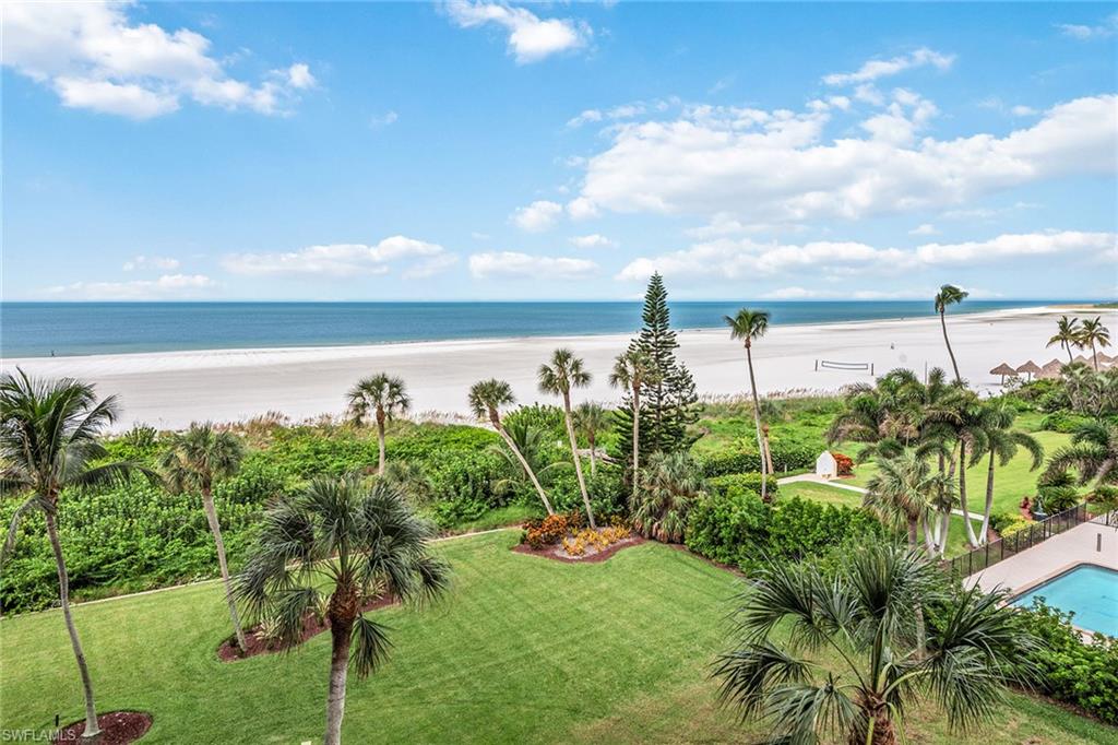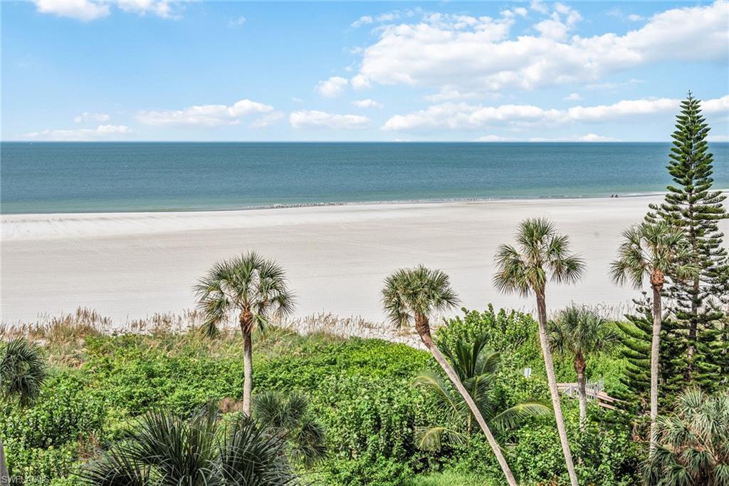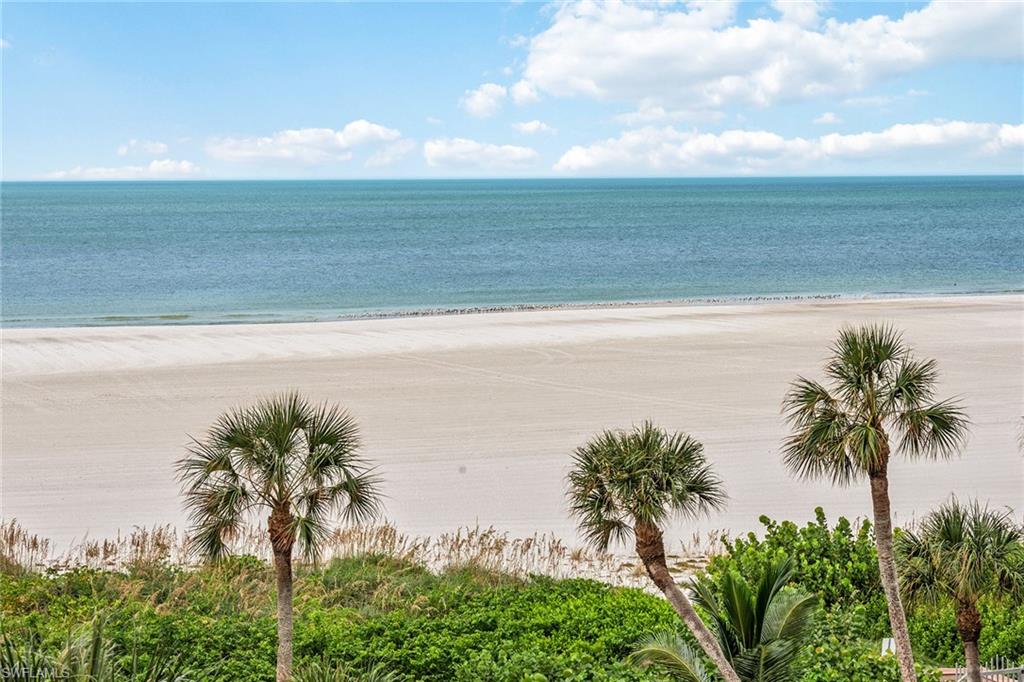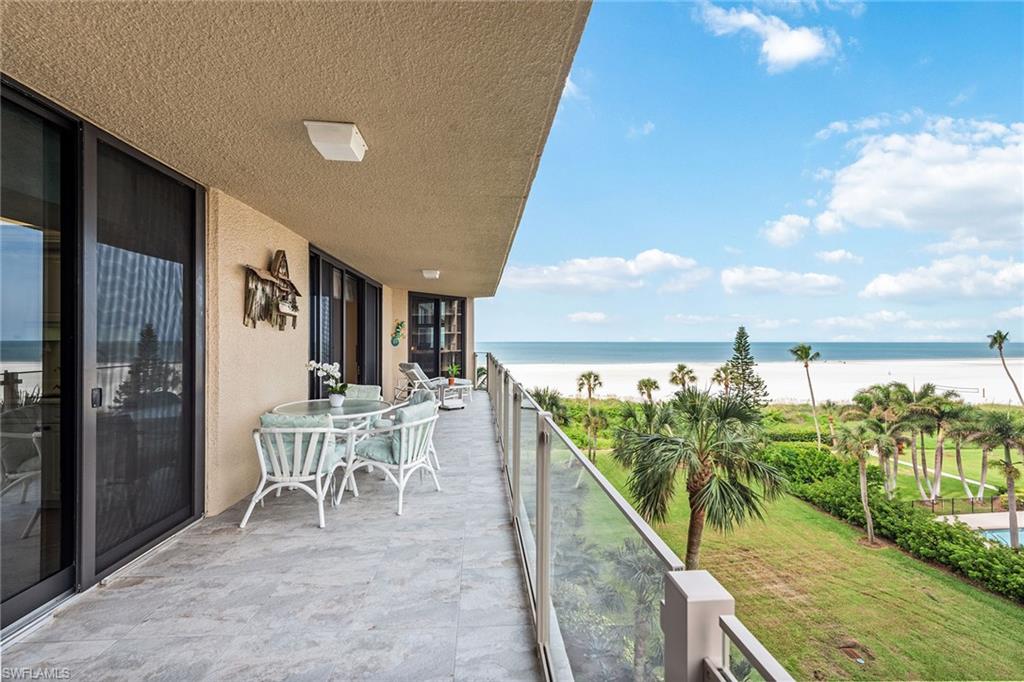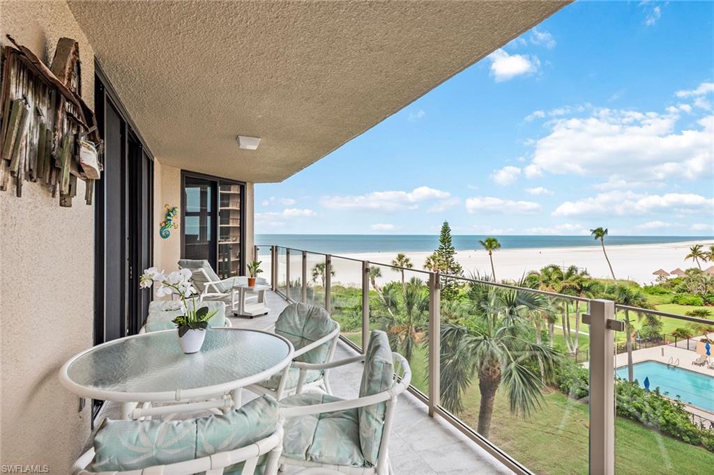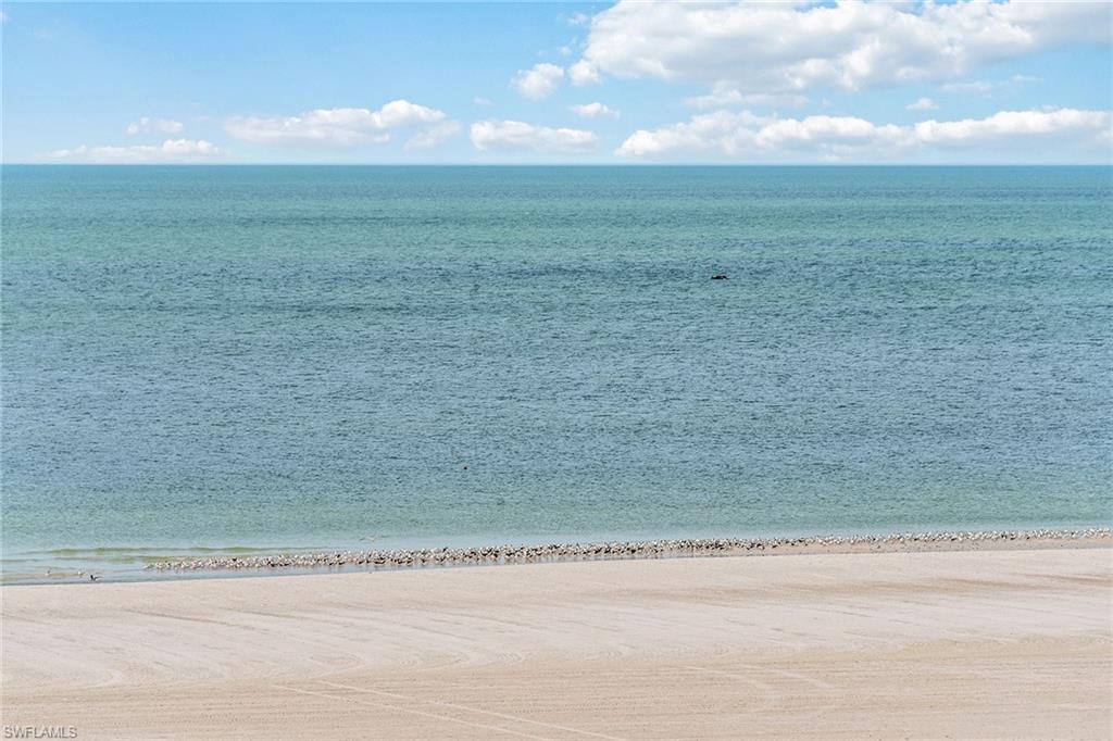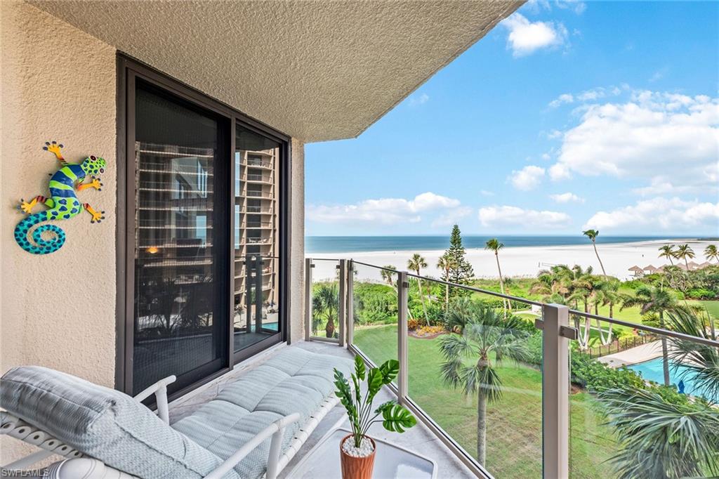 This stunning beachfront condominium in the luxurious Prince building offers breathtaking views of the gulf and Marco Island's pristine beach from every room. On the fifth floor, this two-bedroom, two-bath residence boasts private lanai access from all rooms through impact-resistant sliding glass doors, welcoming gentle sea breezes and the soothing sounds of the ocean. The open wrap-around lanai, with glass railings and tile flooring, provides the ideal setting for enjoying the panoramic views. Inside, the home is furnished and features crown molding throughout, with a kitchen that includes a tray ceiling, white cabinetry, quartz countertops, a two-seater breakfast counter, and newer appliances such as a French door refrigerator and microwave. The kitchen also includes a range with a warming drawer, dishwasher and a pantry for added convenience. The open dining and living area is ideal for entertaining, with a dry bar, custom shelving, a full wall mirror that enhances the sense of space and direct access to the lanai. The owner’s suite offers stunning gulf views, lanai access, a walk-in closet and an en-suite bath with a spacious vanity, a walk-in shower with a frameless glass enclosure, and a linen closet. The guest bedroom also enjoys lanai access and an en-suite bath with a shower-tub combo, tiled floor-to-ceiling with a glass enclosure. Residents of The Prince enjoy a wealth of luxury amenities, including gated security, a social room, heated pool and spa, fitness center, tennis courts, pickleball, barbecue area and private beach access. Ideally near fine dining, shopping and the JW Marriott, this home offers the ultimate in beachfront living with easy access to all Marco Island has to offer, including award-winning beaches, gourmet and casual dining, boutiques, golf, paddleboarding, fitness clubs, yacht clubs, marinas, kayaking, libraries, parks, museums and more. Just a short drive from prestigious Naples and all Southwest Florida attractions, this condominium combines island living with modern convenience.