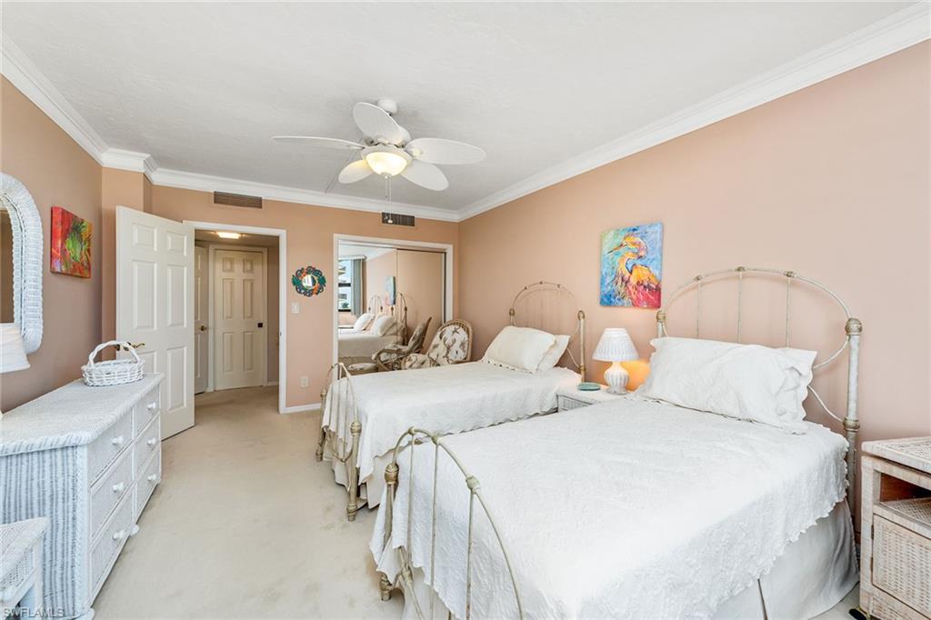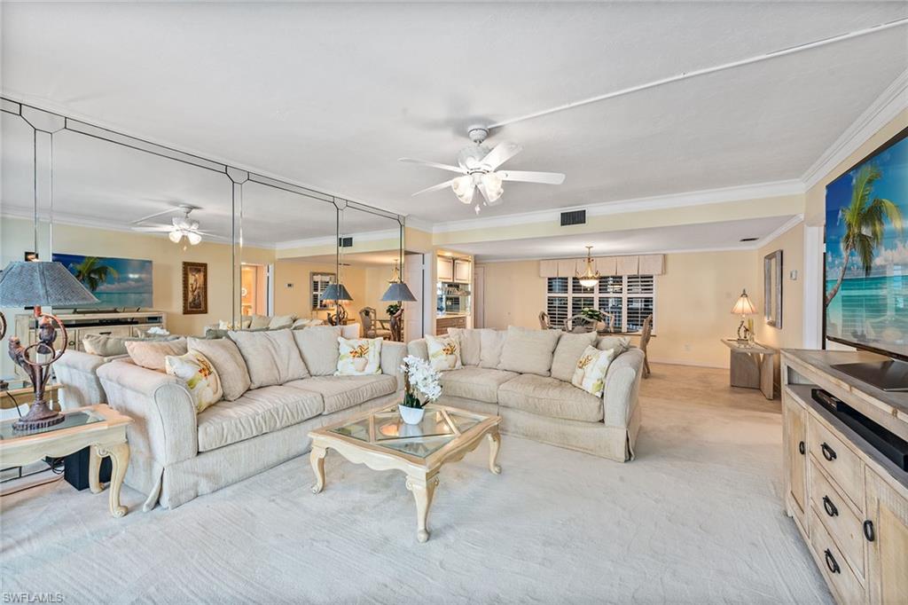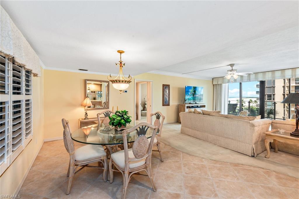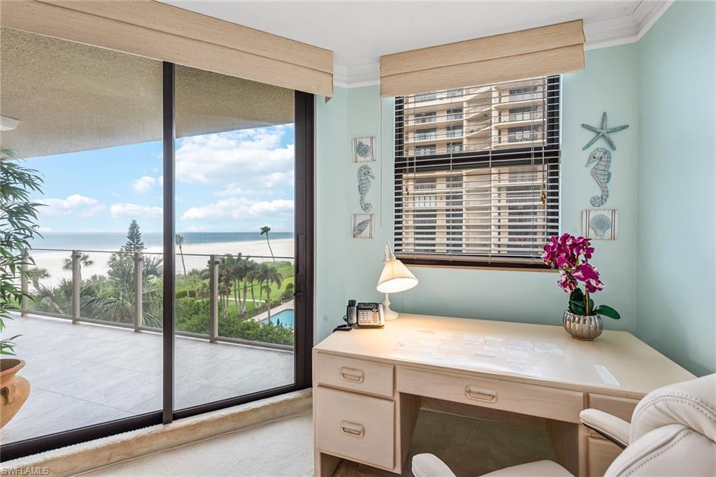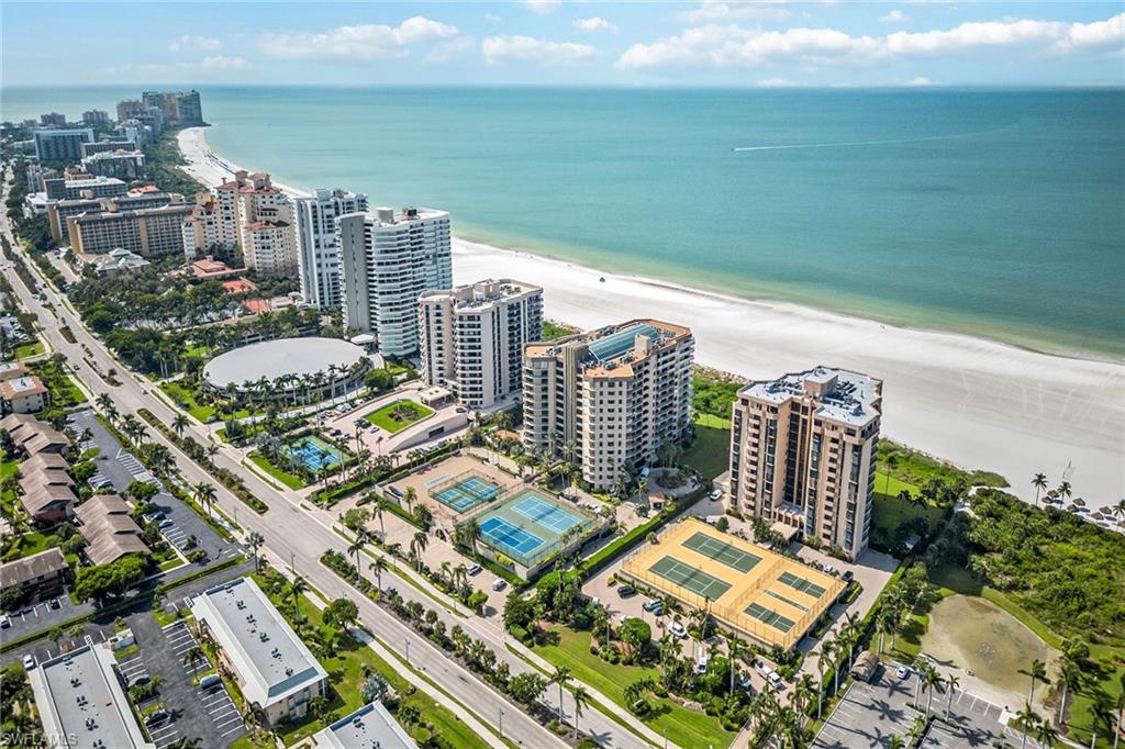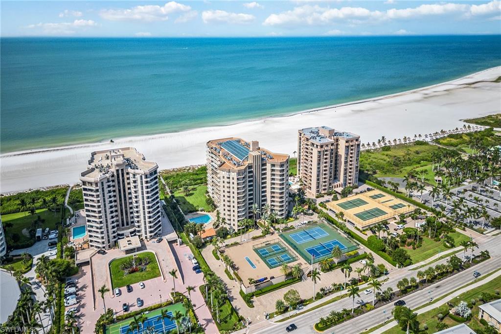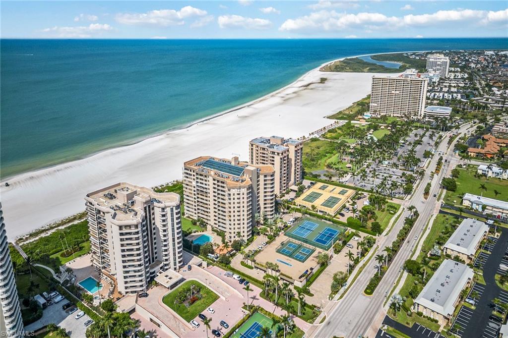 This stunning beachfront condominium in the luxurious Prince building offers breathtaking views of the gulf and Marco Island's pristine beach from every room. On the fifth floor, this two-bedroom, two-bath residence boasts private lanai access from all rooms through impact-resistant sliding glass doors, welcoming gentle sea breezes and the soothing sounds of the ocean. The open wrap-around lanai, with glass railings and tile flooring, provides the ideal setting for enjoying the panoramic views. Inside, the home is furnished and features crown molding throughout, with a kitchen that includes a tray ceiling, white cabinetry, quartz countertops, a two-seater breakfast counter, and newer appliances such as a French door refrigerator and microwave. The kitchen also includes a range with a warming drawer, dishwasher and a pantry for added convenience. The open dining and living area is ideal for entertaining, with a dry bar, custom shelving, a full wall mirror that enhances the sense of space and direct access to the lanai. The owner’s suite offers stunning gulf views, lanai access, a walk-in closet and an en-suite bath with a spacious vanity, a walk-in shower with a frameless glass enclosure, and a linen closet. The guest bedroom also enjoys lanai access and an en-suite bath with a shower-tub combo, tiled floor-to-ceiling with a glass enclosure. Residents of The Prince enjoy a wealth of luxury amenities, including gated security, a social room, heated pool and spa, fitness center, tennis courts, pickleball, barbecue area and private beach access. Ideally near fine dining, shopping and the JW Marriott, this home offers the ultimate in beachfront living with easy access to all Marco Island has to offer, including award-winning beaches, gourmet and casual dining, boutiques, golf, paddleboarding, fitness clubs, yacht clubs, marinas, kayaking, libraries, parks, museums and more. Just a short drive from prestigious Naples and all Southwest Florida attractions, this condominium combines island living with modern convenience.