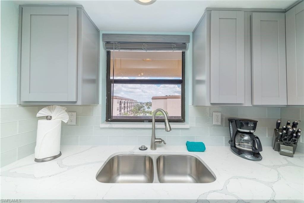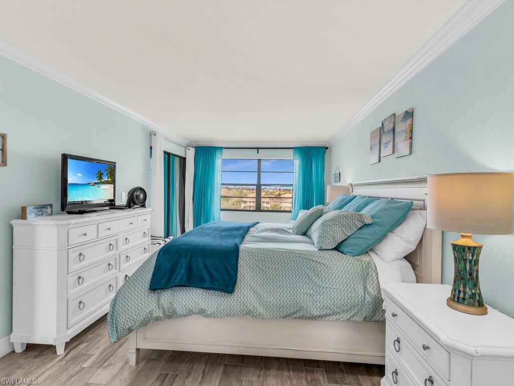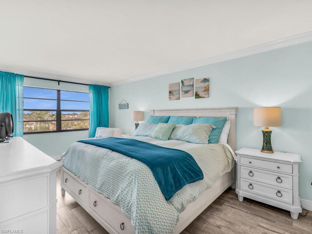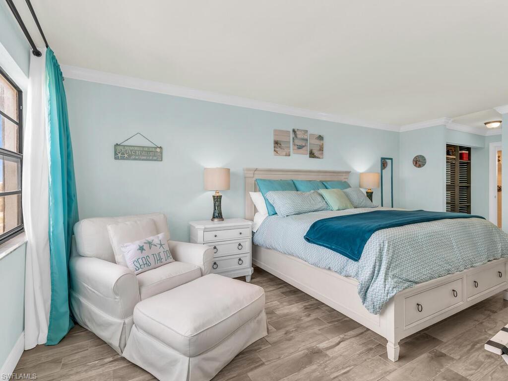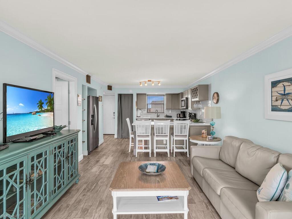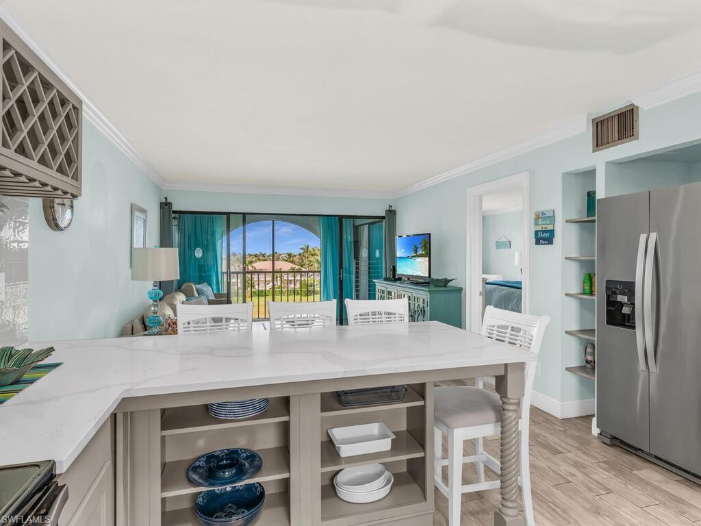 Don't miss this beautifully updated 1 bed 1 bath Anglers Cove condo with sunny western exposure. No shortage of space with the custom slider enclosed lanai that opens up for the warm Marco Island breeze or doubles as additional ac space. Great investment condo with weekly rentals allowed and electric included in condo fee. Recently remodeled in 2018 with a very bright, vibrant design which included a large updated kitchen with full size stainless steel fridge, dishwasher, shaker style cabinets, additional counter seating space and quartz countertops. Beautiful tile backsplash to accentuate the the cabinetry and counter tops and from the kitchen window you get a great peak a boo view of the bay. New A/C in 2021 with U/V sanitation light, water heater replaced in 2018 and washer/dryer hookup already installed in unit! New furniture with 2 couches that are pull out beds and are perfect for hosting guests in the light and bright coastal design. Stunning tile floors and walk in shower with therapeutic pebble shower floor for a luxury feel and a new vanity. New carpet in the bedroom and new king size bed, custom closet shelving plus a locked owners closet for personal items. Anglers Cove is a waterfront resort style community with boat docks available for leasing and is direct Gulf access. Along with 2 huge pools 2 hot tubs, 2 tennis courts and an outstanding outdoor restaurant for all to enjoy.
