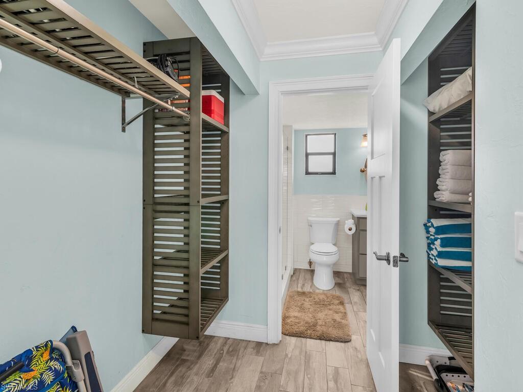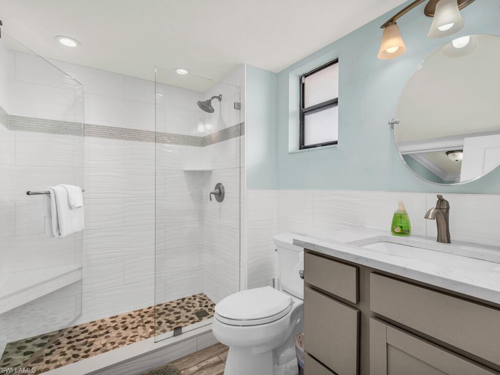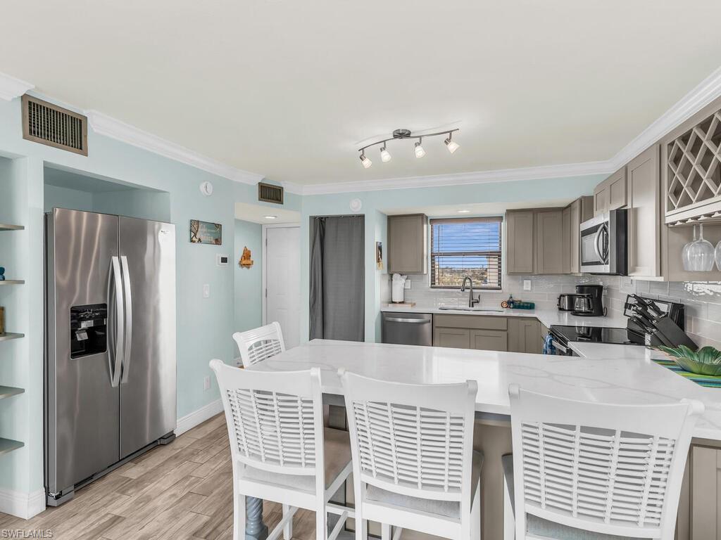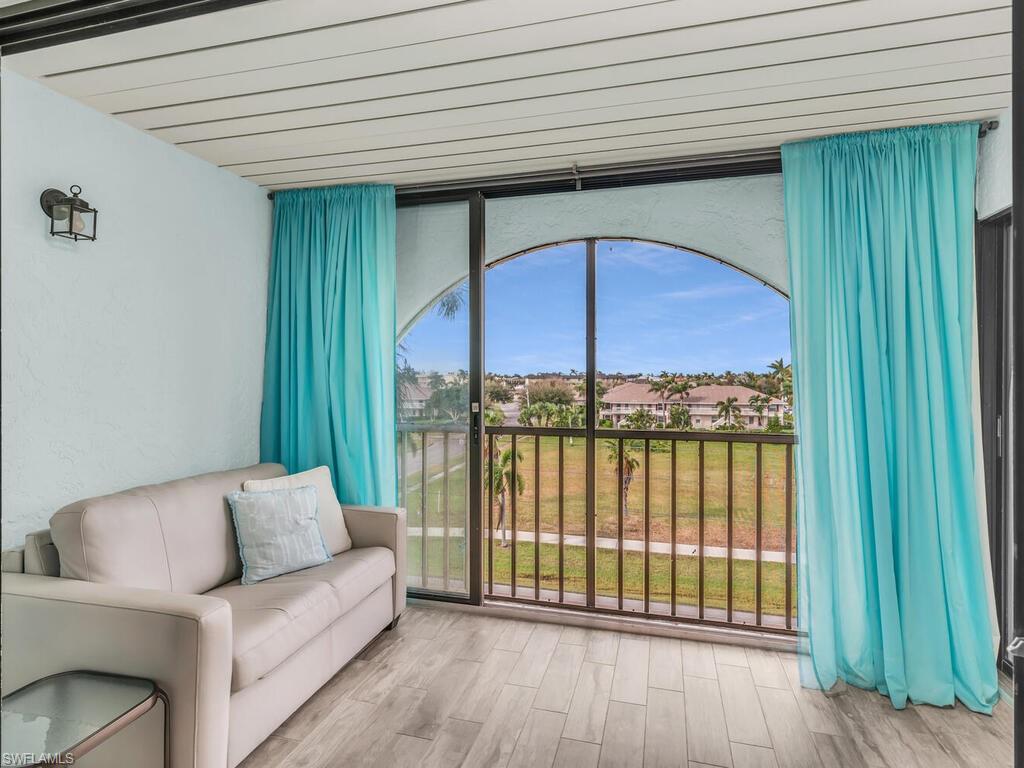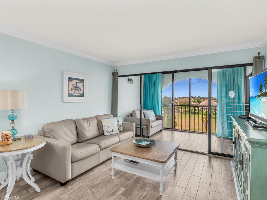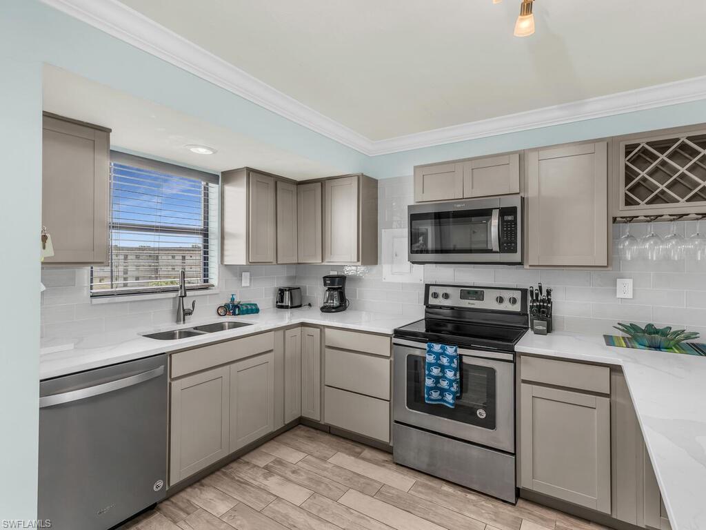 Don't miss this beautifully updated 1 bed 1 bath Anglers Cove condo with sunny western exposure. No shortage of space with the custom slider enclosed lanai that opens up for the warm Marco Island breeze or doubles as additional ac space. Great investment condo with weekly rentals allowed and electric included in condo fee. Recently remodeled in 2018 with a very bright, vibrant design which included a large updated kitchen with full size stainless steel fridge, dishwasher, shaker style cabinets, additional counter seating space and quartz countertops. Beautiful tile backsplash to accentuate the the cabinetry and counter tops and from the kitchen window you get a great peak a boo view of the bay. New A/C in 2021 with U/V sanitation light, water heater replaced in 2018 and washer/dryer hookup already installed in unit! New furniture with 2 couches that are pull out beds and are perfect for hosting guests in the light and bright coastal design. Stunning tile floors and walk in shower with therapeutic pebble shower floor for a luxury feel and a new vanity. New carpet in the bedroom and new king size bed, custom closet shelving plus a locked owners closet for personal items. Anglers Cove is a waterfront resort style community with boat docks available for leasing and is direct Gulf access. Along with 2 huge pools 2 hot tubs, 2 tennis courts and an outstanding outdoor restaurant for all to enjoy.