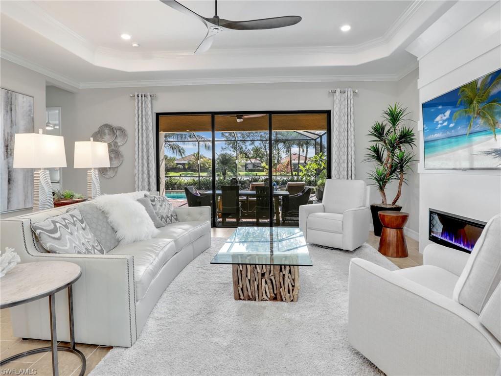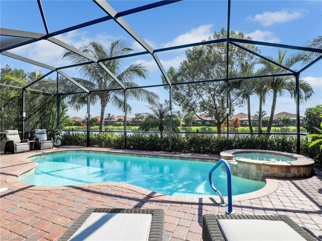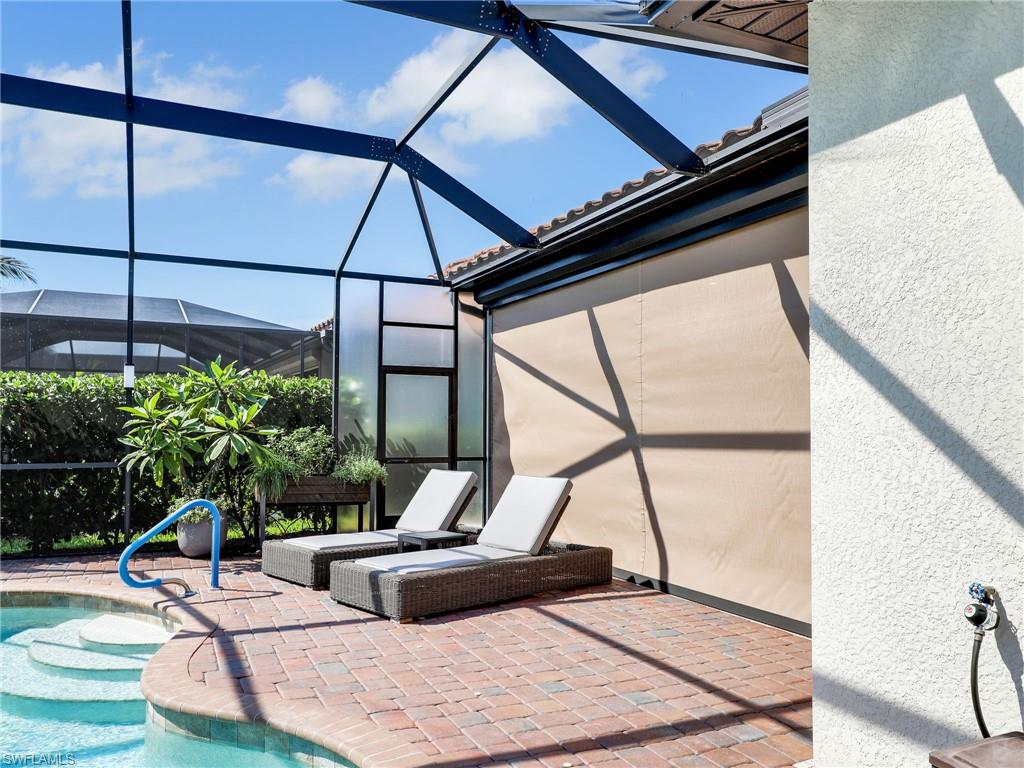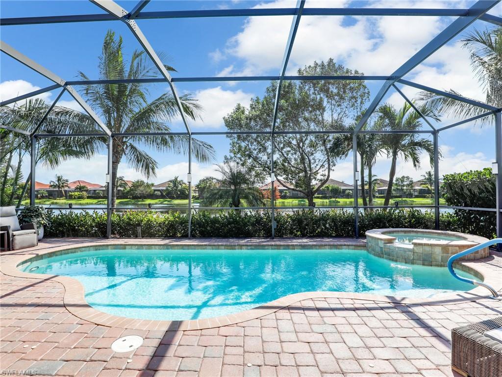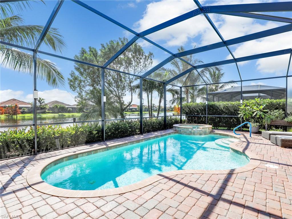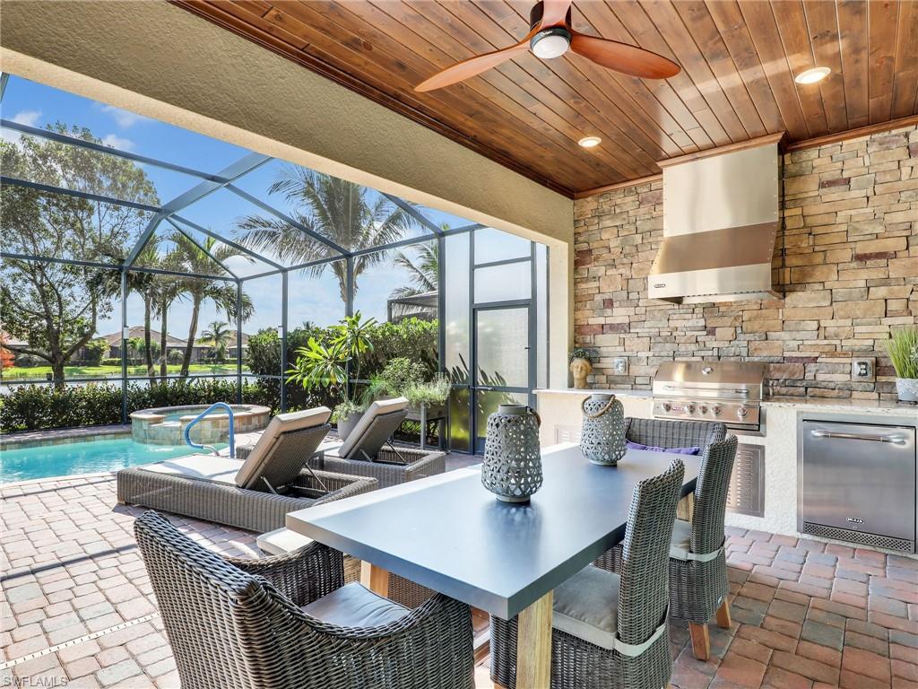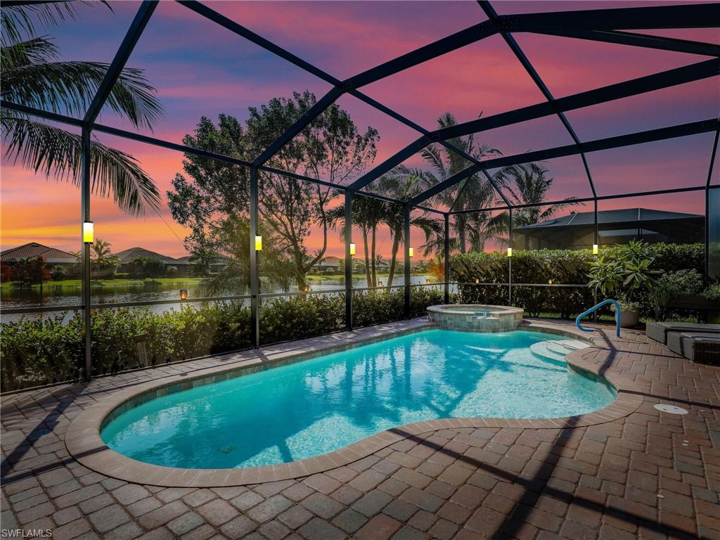 Step into SWFL luxury living! This immaculately kept home showcases too many high-end upgrades to list with 4 beds/3 baths and 2247 sqft of living space. Before even entering, you are greeted by a paver drive and walkway, luscious landscaping with professionally installed landscape lighting and custom front door with glass insert, allowing natural light to illuminate the interior. Once inside, 10-foot ceilings with crown moulding greet you with direct views to the living space and outdoor oasis through the 12-foot triple sliding glass doors. The split floorplan provides lots of options with one secondary bedroom featuring an ensuite bathroom with granite countertops, a walk-in tiled shower with frameless glass enclosure and rainfall shower head. The other two bedrooms (one currently being used as a den) are across the hall and share a bathroom, also with granite countertops, a bathtub with glass shower enclosure and rainfall shower head. There is no carpet in sight here; flooring throughout is tile or wood. The open concept living space feels bright and spacious with tray ceilings in both the dining and living rooms. Stylish light fixtures and ceiling fans adorn the spaces and plantation shutters allow you to easily let the natural light in or maintain privacy when desired. The living room is accented with an electric fireplace encased in stunning decorative framework. Nearby, the kitchen dazzles with 42” upper cabinets with crown moulding, stainless-steel appliances, a built-in oven and microwave, and granite countertops with a single basin stainless-steel sink. The walk-in pantry has been lined with custom wood shelving for extra storage and all bottom kitchen cabinets have pull out rolling shelving installed for easy access to all your cookware. At the rear of the home, the expansive primary suite offers views of the backyard, pool and pond with private access to the lanai. Two closets are available to accommodate your needs, a walk-in and reach-in, both with custom built-in shelving to make organizing and storage a breeze. Enjoy a spa day in your ensuite bathroom, with granite countertops, dual sinks, private commode space, garden tub, and tiled walk-in shower with glass enclosure and rainfall shower head. The primary suite has programmable automatic smart shades in both the bathroom and bedroom. Nothing beats Florida living more than having a backyard oasis. Step outside onto your covered and screened lanai offering plenty of space for outdoor dining or socializing. Your outdoor kitchen highlights Bull brand propane gas grill and fridge with granite countertops and stonework accents. Cool off in your saltwater pool and spa overlooking the landscaped backyard and pond or turn on the pool heater for year-round use. Stay protected from storms with impact rated windows and installed lanai storm shade. Enjoy access to the community amenities with this SOCIAL club membership home. Bocce ball and pickleball coming in fall 2025!