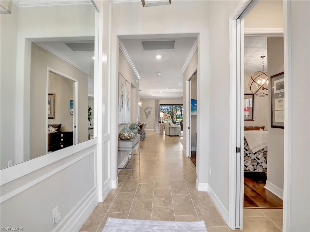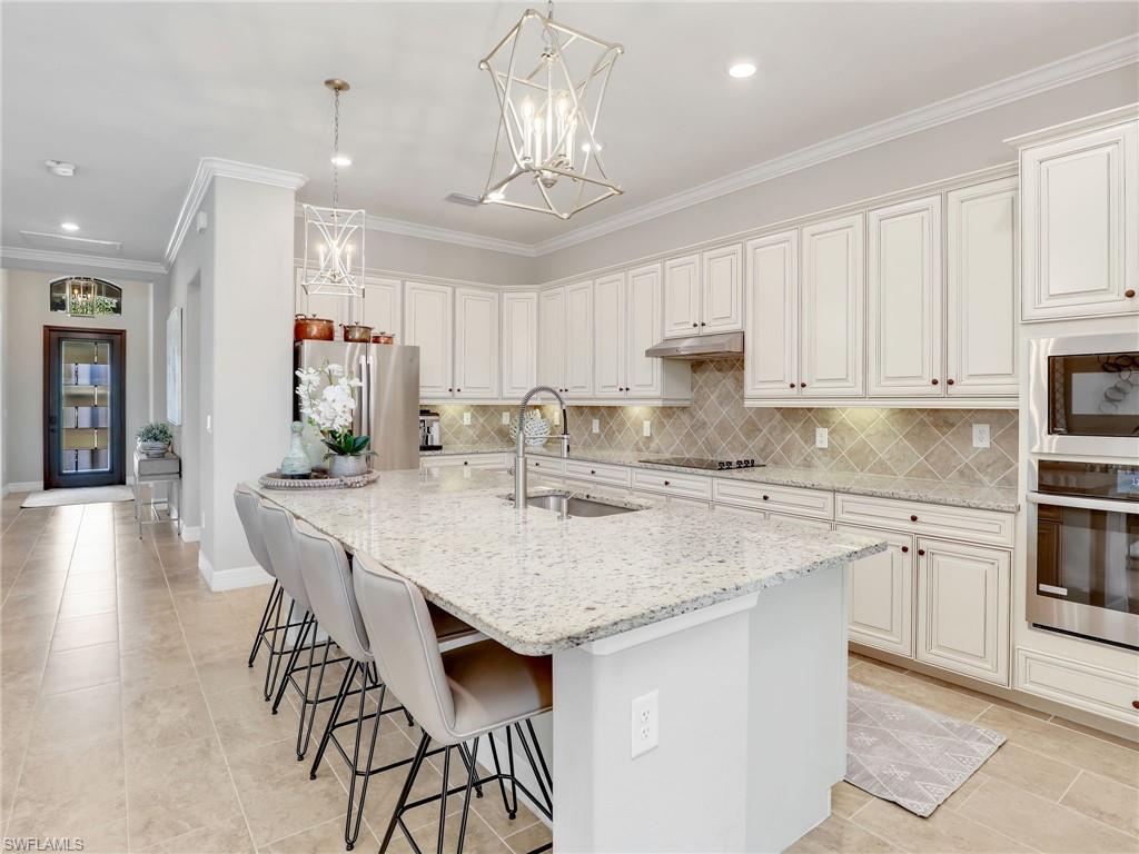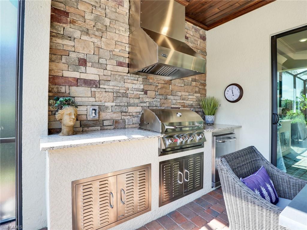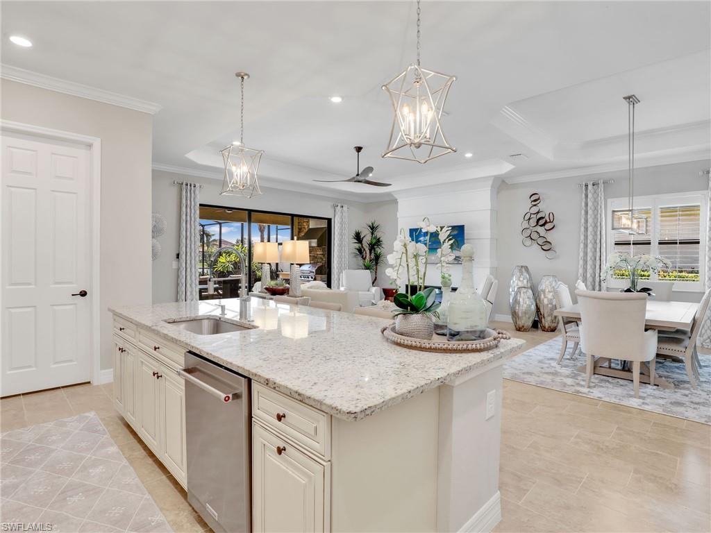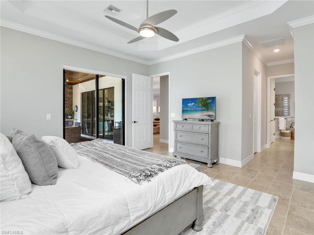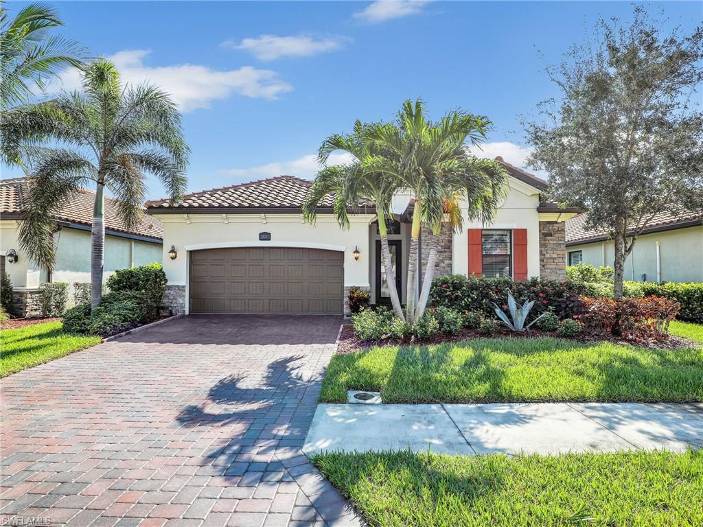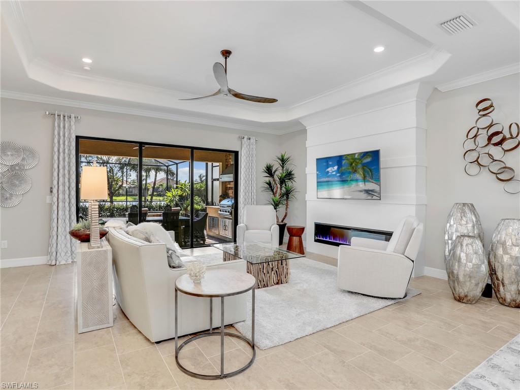 Step into SWFL luxury living! This immaculately kept home showcases too many high-end upgrades to list with 4 beds/3 baths and 2247 sqft of living space. Before even entering, you are greeted by a paver drive and walkway, luscious landscaping with professionally installed landscape lighting and custom front door with glass insert, allowing natural light to illuminate the interior. Once inside, 10-foot ceilings with crown moulding greet you with direct views to the living space and outdoor oasis through the 12-foot triple sliding glass doors. The split floorplan provides lots of options with one secondary bedroom featuring an ensuite bathroom with granite countertops, a walk-in tiled shower with frameless glass enclosure and rainfall shower head. The other two bedrooms (one currently being used as a den) are across the hall and share a bathroom, also with granite countertops, a bathtub with glass shower enclosure and rainfall shower head. There is no carpet in sight here; flooring throughout is tile or wood. The open concept living space feels bright and spacious with tray ceilings in both the dining and living rooms. Stylish light fixtures and ceiling fans adorn the spaces and plantation shutters allow you to easily let the natural light in or maintain privacy when desired. The living room is accented with an electric fireplace encased in stunning decorative framework. Nearby, the kitchen dazzles with 42” upper cabinets with crown moulding, stainless-steel appliances, a built-in oven and microwave, and granite countertops with a single basin stainless-steel sink. The walk-in pantry has been lined with custom wood shelving for extra storage and all bottom kitchen cabinets have pull out rolling shelving installed for easy access to all your cookware. At the rear of the home, the expansive primary suite offers views of the backyard, pool and pond with private access to the lanai. Two closets are available to accommodate your needs, a walk-in and reach-in, both with custom built-in shelving to make organizing and storage a breeze. Enjoy a spa day in your ensuite bathroom, with granite countertops, dual sinks, private commode space, garden tub, and tiled walk-in shower with glass enclosure and rainfall shower head. The primary suite has programmable automatic smart shades in both the bathroom and bedroom. Nothing beats Florida living more than having a backyard oasis. Step outside onto your covered and screened lanai offering plenty of space for outdoor dining or socializing. Your outdoor kitchen highlights Bull brand propane gas grill and fridge with granite countertops and stonework accents. Cool off in your saltwater pool and spa overlooking the landscaped backyard and pond or turn on the pool heater for year-round use. Stay protected from storms with impact rated windows and installed lanai storm shade. Enjoy access to the community amenities with this SOCIAL club membership home. Bocce ball and pickleball coming in fall 2025!