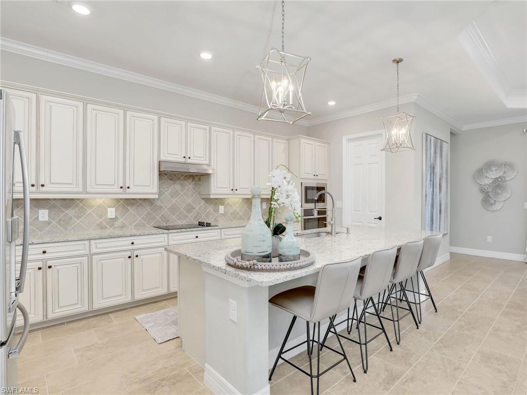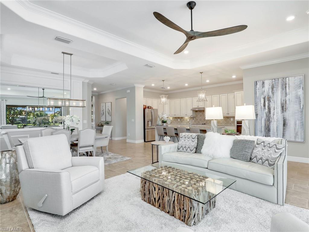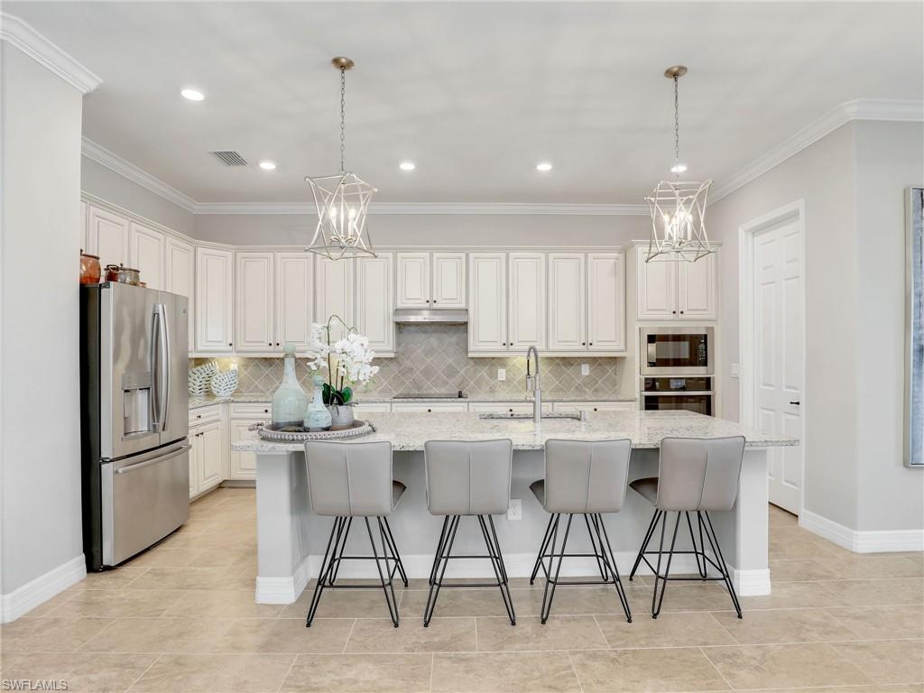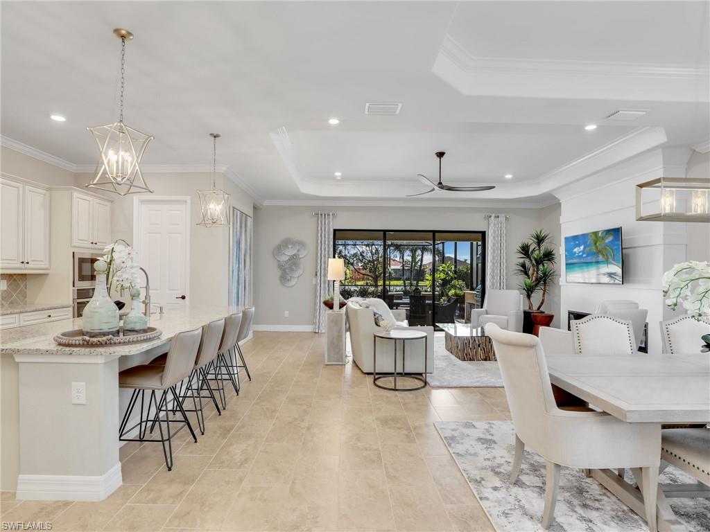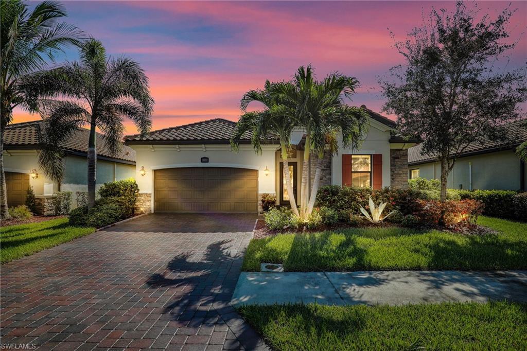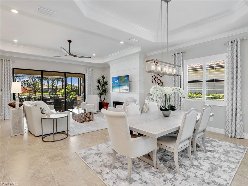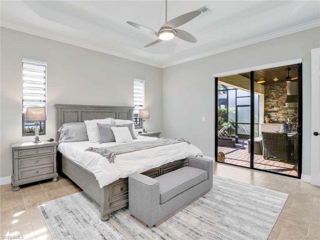 Step into SWFL luxury living! This immaculately kept home showcases too many high-end upgrades to list with 4 beds/3 baths and 2247 sqft of living space. Before even entering, you are greeted by a paver drive and walkway, luscious landscaping with professionally installed landscape lighting and custom front door with glass insert, allowing natural light to illuminate the interior. Once inside, 10-foot ceilings with crown moulding greet you with direct views to the living space and outdoor oasis through the 12-foot triple sliding glass doors. The split floorplan provides lots of options with one secondary bedroom featuring an ensuite bathroom with granite countertops, a walk-in tiled shower with frameless glass enclosure and rainfall shower head. The other two bedrooms (one currently being used as a den) are across the hall and share a bathroom, also with granite countertops, a bathtub with glass shower enclosure and rainfall shower head. There is no carpet in sight here; flooring throughout is tile or wood. The open concept living space feels bright and spacious with tray ceilings in both the dining and living rooms. Stylish light fixtures and ceiling fans adorn the spaces and plantation shutters allow you to easily let the natural light in or maintain privacy when desired. The living room is accented with an electric fireplace encased in stunning decorative framework. Nearby, the kitchen dazzles with 42” upper cabinets with crown moulding, stainless-steel appliances, a built-in oven and microwave, and granite countertops with a single basin stainless-steel sink. The walk-in pantry has been lined with custom wood shelving for extra storage and all bottom kitchen cabinets have pull out rolling shelving installed for easy access to all your cookware. At the rear of the home, the expansive primary suite offers views of the backyard, pool and pond with private access to the lanai. Two closets are available to accommodate your needs, a walk-in and reach-in, both with custom built-in shelving to make organizing and storage a breeze. Enjoy a spa day in your ensuite bathroom, with granite countertops, dual sinks, private commode space, garden tub, and tiled walk-in shower with glass enclosure and rainfall shower head. The primary suite has programmable automatic smart shades in both the bathroom and bedroom. Nothing beats Florida living more than having a backyard oasis. Step outside onto your covered and screened lanai offering plenty of space for outdoor dining or socializing. Your outdoor kitchen highlights Bull brand propane gas grill and fridge with granite countertops and stonework accents. Cool off in your saltwater pool and spa overlooking the landscaped backyard and pond or turn on the pool heater for year-round use. Stay protected from storms with impact rated windows and installed lanai storm shade. Enjoy access to the community amenities with this SOCIAL club membership home. Bocce ball and pickleball coming in fall 2025!
