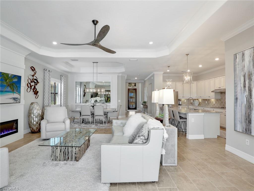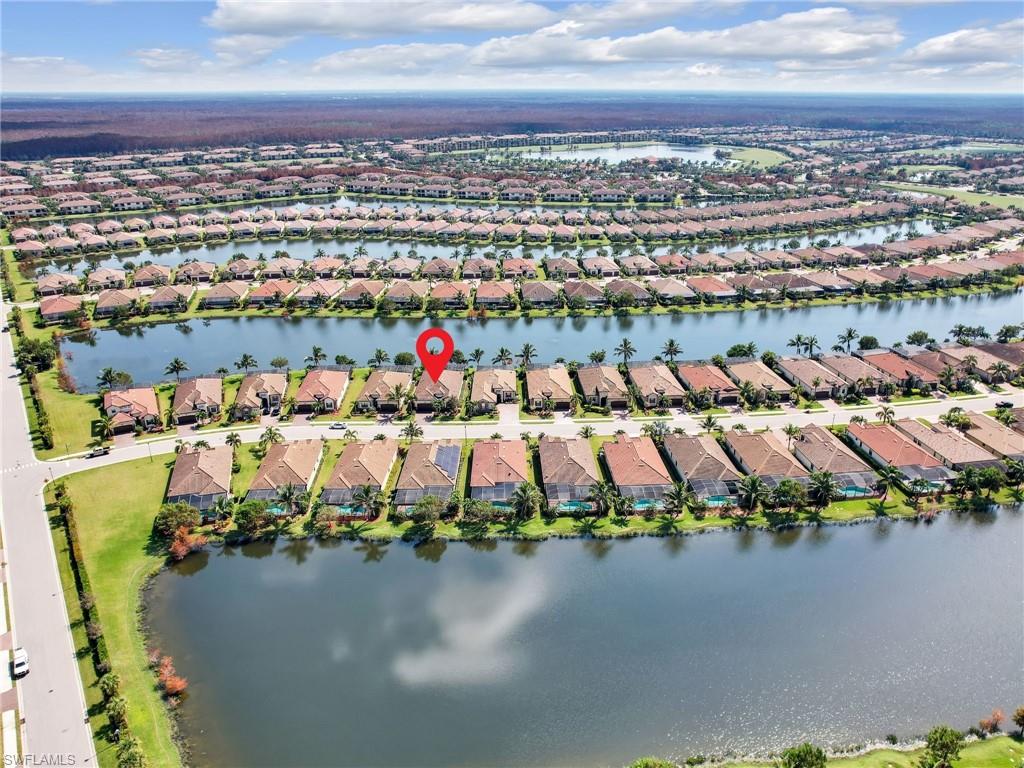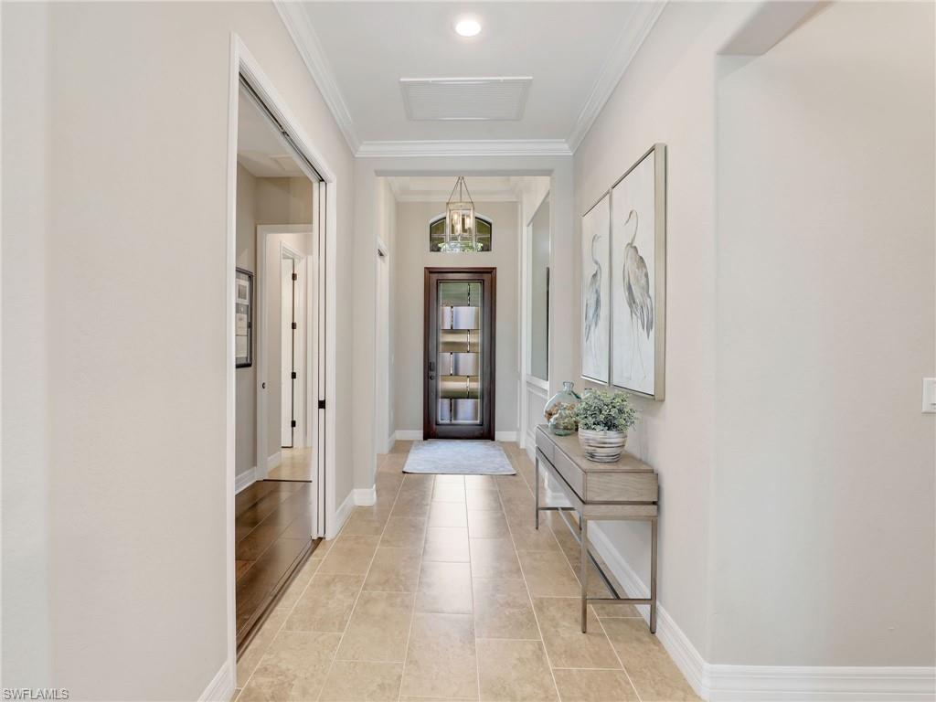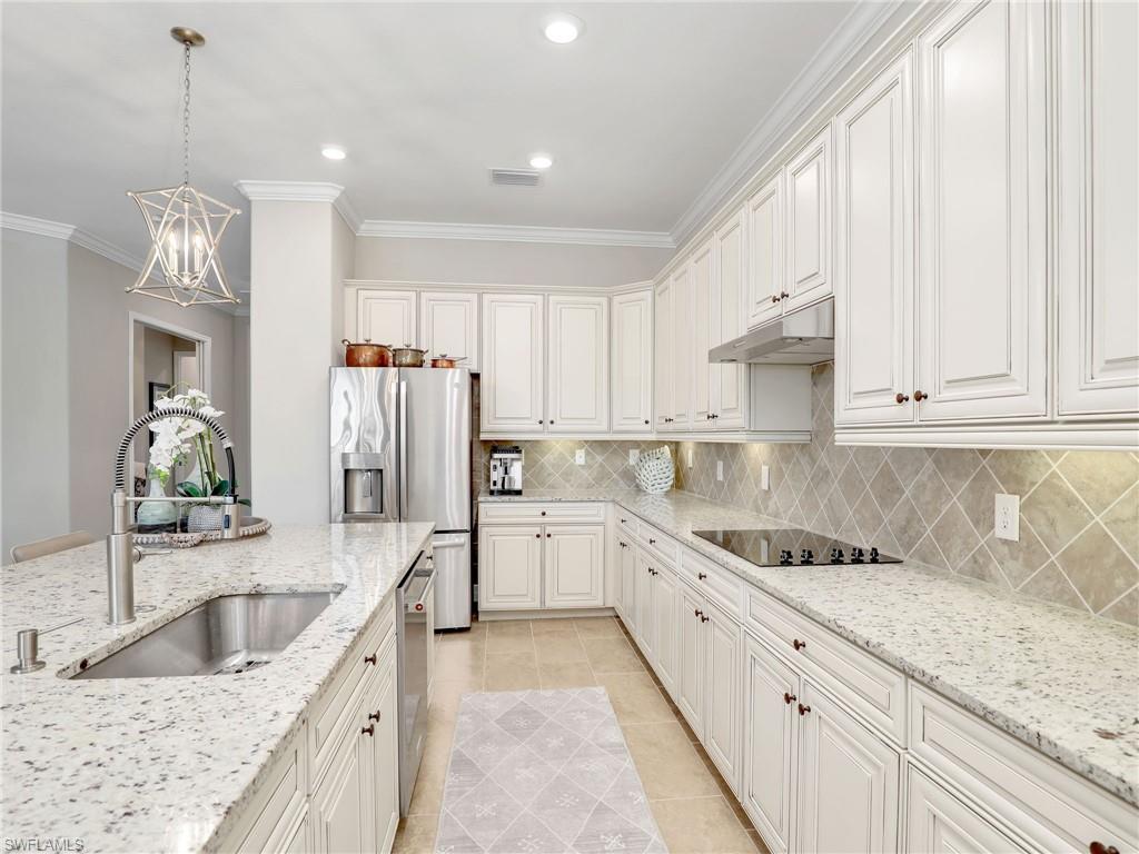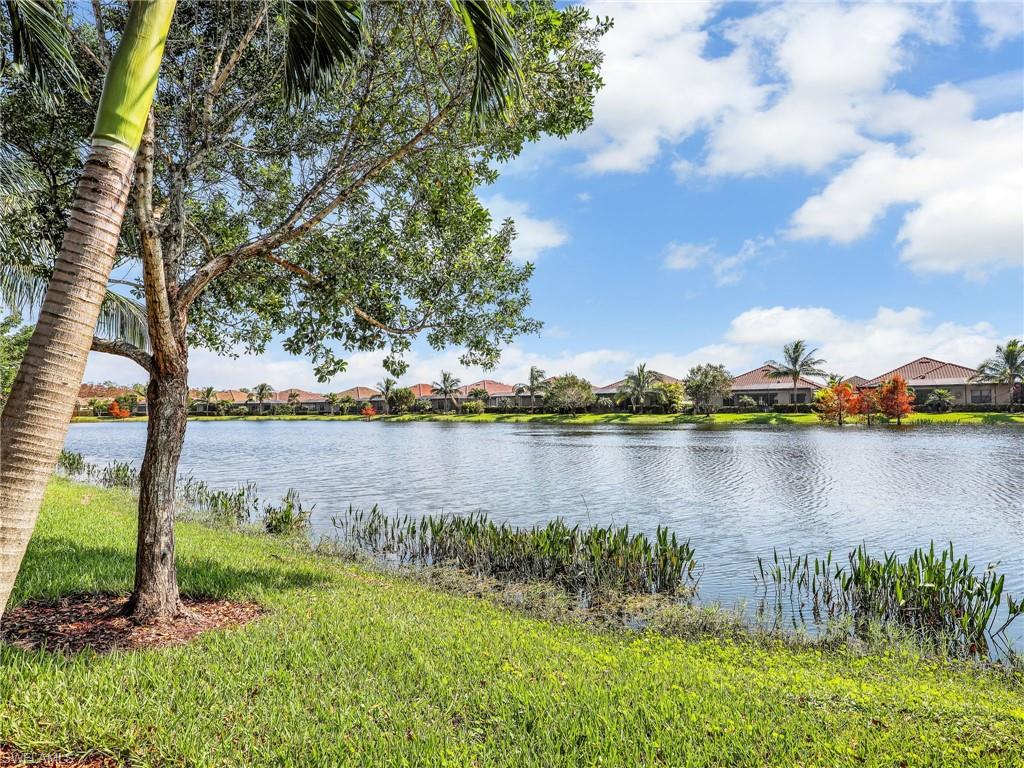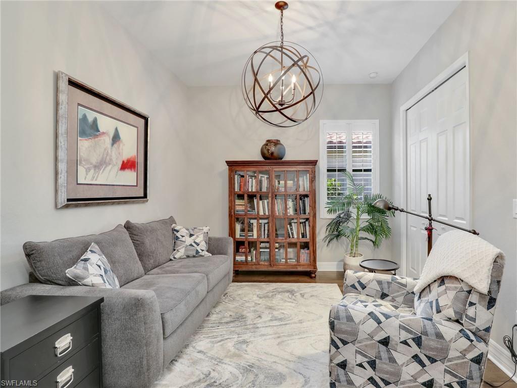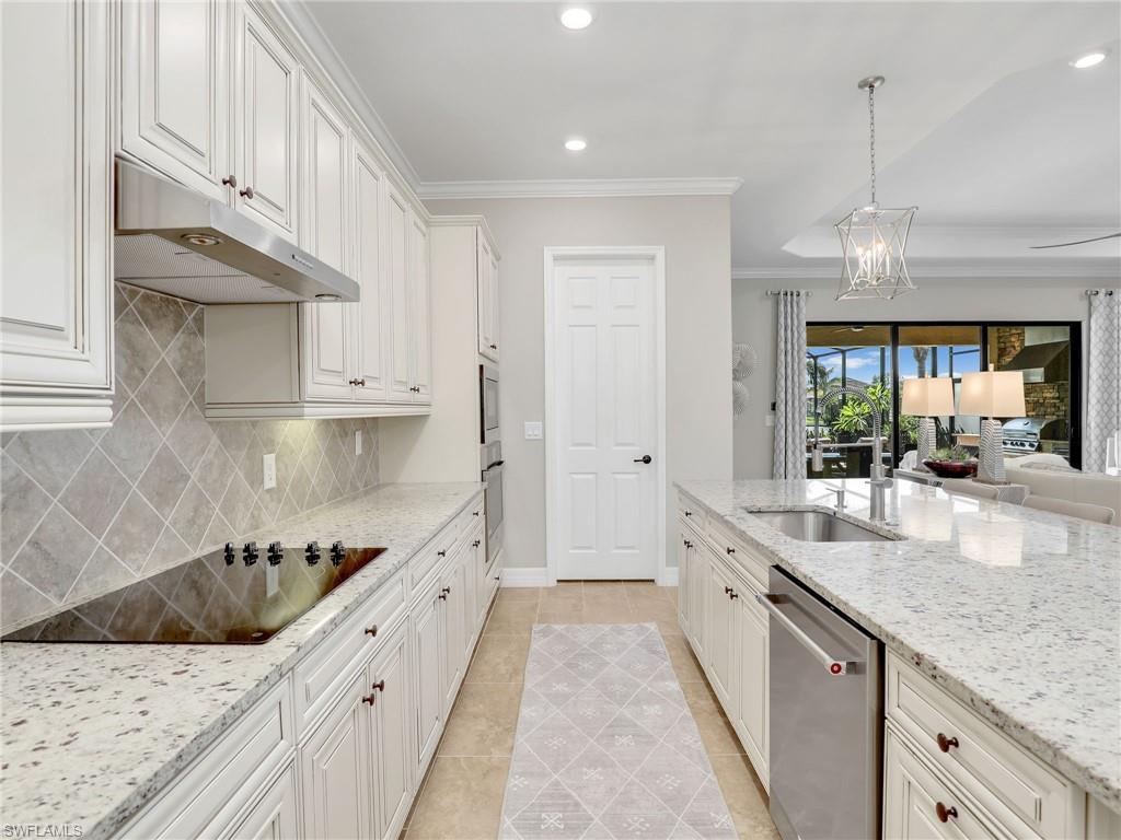 Step into SWFL luxury living! This immaculately kept home showcases too many high-end upgrades to list with 4 beds/3 baths and 2247 sqft of living space. Before even entering, you are greeted by a paver drive and walkway, luscious landscaping with professionally installed landscape lighting and custom front door with glass insert, allowing natural light to illuminate the interior. Once inside, 10-foot ceilings with crown moulding greet you with direct views to the living space and outdoor oasis through the 12-foot triple sliding glass doors. The split floorplan provides lots of options with one secondary bedroom featuring an ensuite bathroom with granite countertops, a walk-in tiled shower with frameless glass enclosure and rainfall shower head. The other two bedrooms (one currently being used as a den) are across the hall and share a bathroom, also with granite countertops, a bathtub with glass shower enclosure and rainfall shower head. There is no carpet in sight here; flooring throughout is tile or wood. The open concept living space feels bright and spacious with tray ceilings in both the dining and living rooms. Stylish light fixtures and ceiling fans adorn the spaces and plantation shutters allow you to easily let the natural light in or maintain privacy when desired. The living room is accented with an electric fireplace encased in stunning decorative framework. Nearby, the kitchen dazzles with 42” upper cabinets with crown moulding, stainless-steel appliances, a built-in oven and microwave, and granite countertops with a single basin stainless-steel sink. The walk-in pantry has been lined with custom wood shelving for extra storage and all bottom kitchen cabinets have pull out rolling shelving installed for easy access to all your cookware. At the rear of the home, the expansive primary suite offers views of the backyard, pool and pond with private access to the lanai. Two closets are available to accommodate your needs, a walk-in and reach-in, both with custom built-in shelving to make organizing and storage a breeze. Enjoy a spa day in your ensuite bathroom, with granite countertops, dual sinks, private commode space, garden tub, and tiled walk-in shower with glass enclosure and rainfall shower head. The primary suite has programmable automatic smart shades in both the bathroom and bedroom. Nothing beats Florida living more than having a backyard oasis. Step outside onto your covered and screened lanai offering plenty of space for outdoor dining or socializing. Your outdoor kitchen highlights Bull brand propane gas grill and fridge with granite countertops and stonework accents. Cool off in your saltwater pool and spa overlooking the landscaped backyard and pond or turn on the pool heater for year-round use. Stay protected from storms with impact rated windows and installed lanai storm shade. Enjoy access to the community amenities with this SOCIAL club membership home. Bocce ball and pickleball coming in fall 2025!