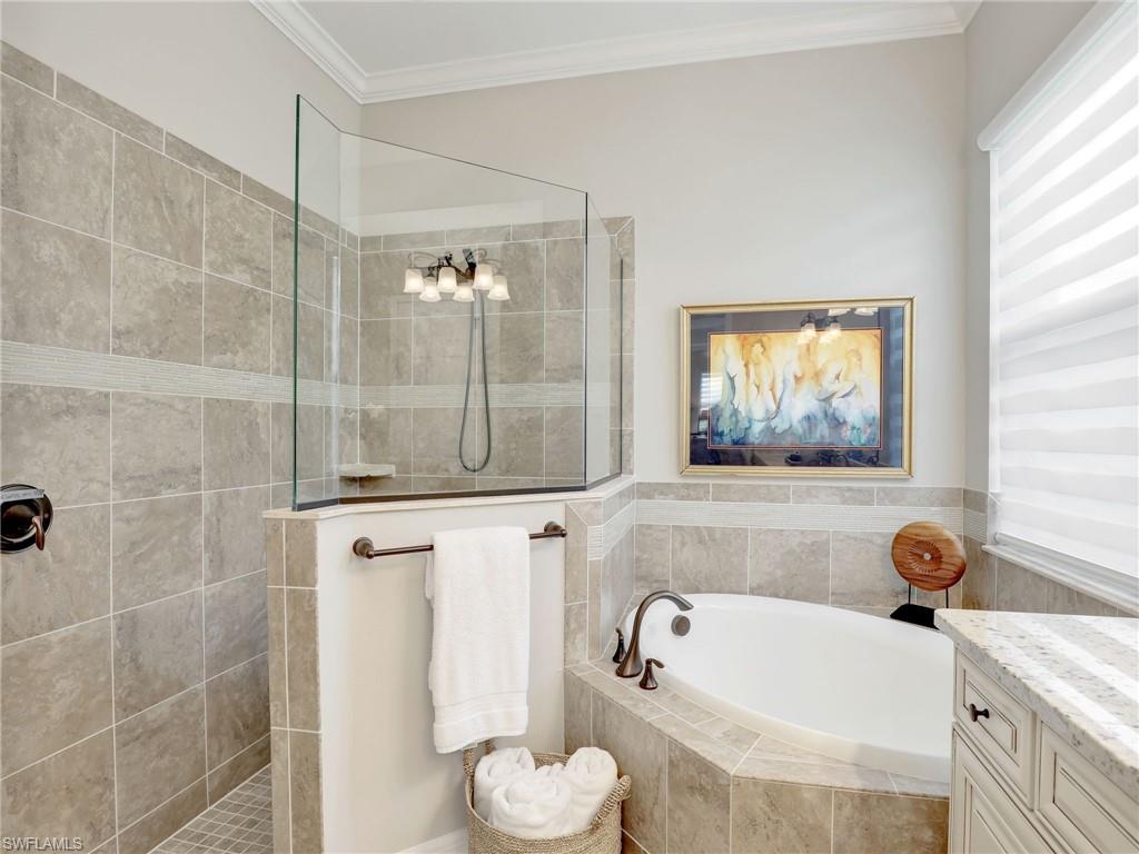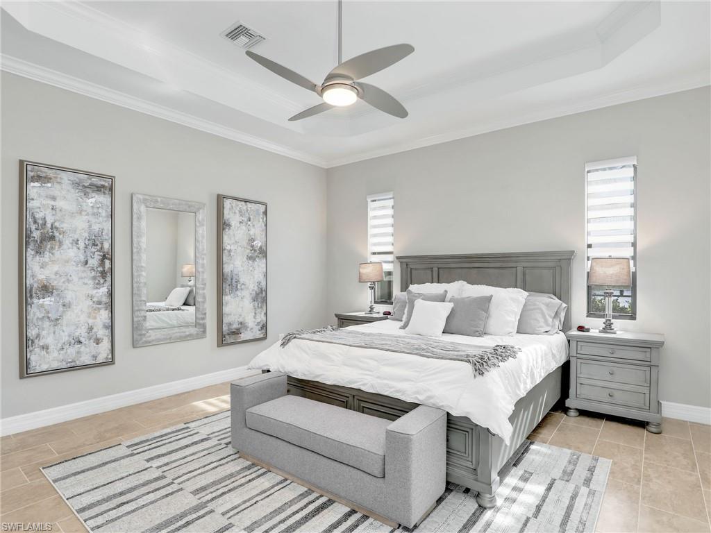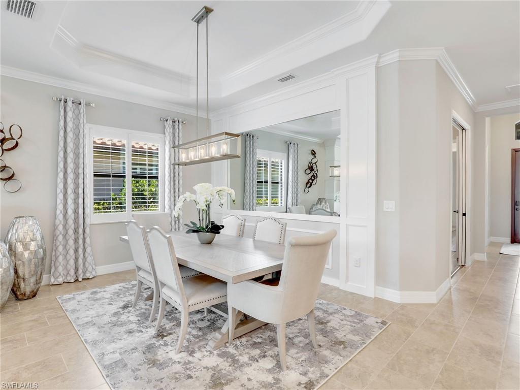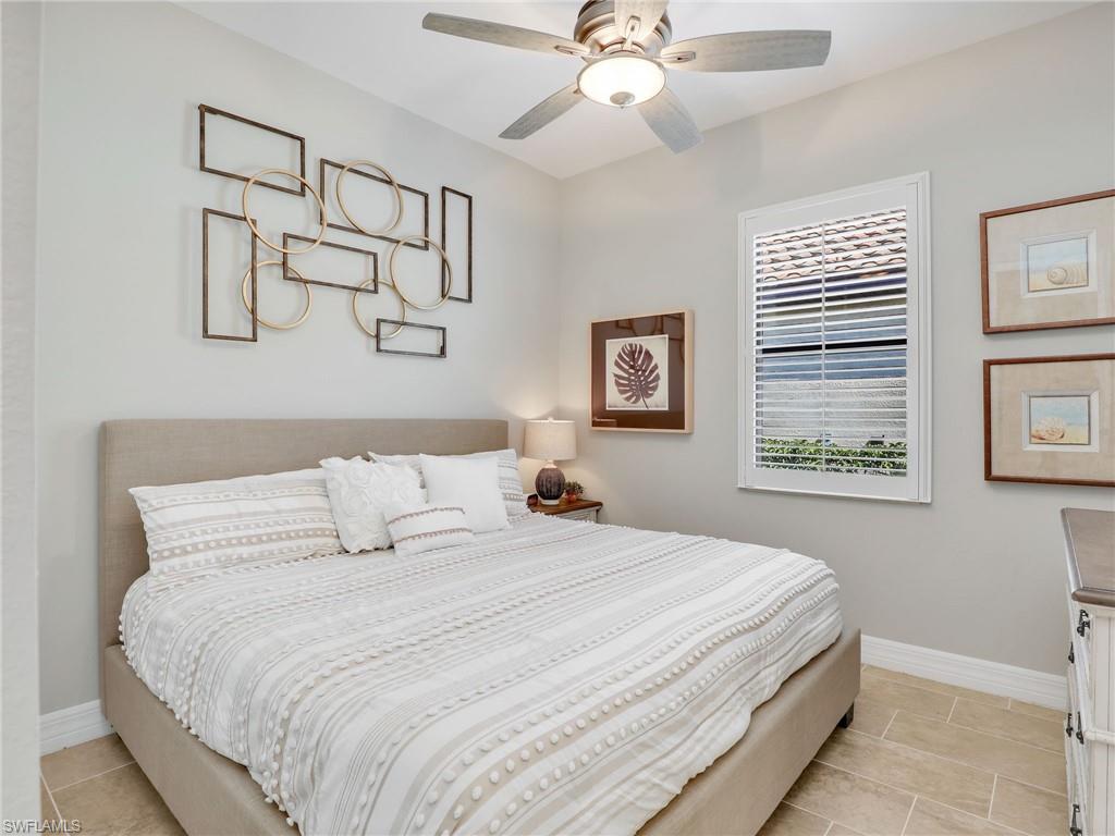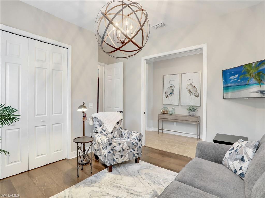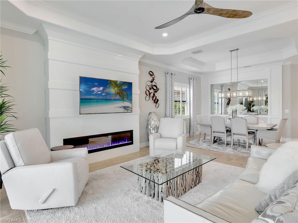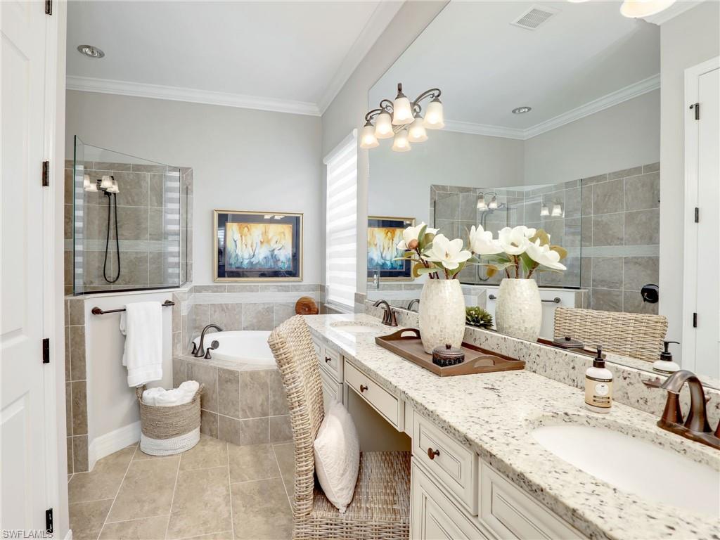 Step into SWFL luxury living! This immaculately kept home showcases too many high-end upgrades to list with 4 beds/3 baths and 2247 sqft of living space. Before even entering, you are greeted by a paver drive and walkway, luscious landscaping with professionally installed landscape lighting and custom front door with glass insert, allowing natural light to illuminate the interior. Once inside, 10-foot ceilings with crown moulding greet you with direct views to the living space and outdoor oasis through the 12-foot triple sliding glass doors. The split floorplan provides lots of options with one secondary bedroom featuring an ensuite bathroom with granite countertops, a walk-in tiled shower with frameless glass enclosure and rainfall shower head. The other two bedrooms (one currently being used as a den) are across the hall and share a bathroom, also with granite countertops, a bathtub with glass shower enclosure and rainfall shower head. There is no carpet in sight here; flooring throughout is tile or wood. The open concept living space feels bright and spacious with tray ceilings in both the dining and living rooms. Stylish light fixtures and ceiling fans adorn the spaces and plantation shutters allow you to easily let the natural light in or maintain privacy when desired. The living room is accented with an electric fireplace encased in stunning decorative framework. Nearby, the kitchen dazzles with 42” upper cabinets with crown moulding, stainless-steel appliances, a built-in oven and microwave, and granite countertops with a single basin stainless-steel sink. The walk-in pantry has been lined with custom wood shelving for extra storage and all bottom kitchen cabinets have pull out rolling shelving installed for easy access to all your cookware. At the rear of the home, the expansive primary suite offers views of the backyard, pool and pond with private access to the lanai. Two closets are available to accommodate your needs, a walk-in and reach-in, both with custom built-in shelving to make organizing and storage a breeze. Enjoy a spa day in your ensuite bathroom, with granite countertops, dual sinks, private commode space, garden tub, and tiled walk-in shower with glass enclosure and rainfall shower head. The primary suite has programmable automatic smart shades in both the bathroom and bedroom. Nothing beats Florida living more than having a backyard oasis. Step outside onto your covered and screened lanai offering plenty of space for outdoor dining or socializing. Your outdoor kitchen highlights Bull brand propane gas grill and fridge with granite countertops and stonework accents. Cool off in your saltwater pool and spa overlooking the landscaped backyard and pond or turn on the pool heater for year-round use. Stay protected from storms with impact rated windows and installed lanai storm shade. Enjoy access to the community amenities with this SOCIAL club membership home. Bocce ball and pickleball coming in fall 2025!