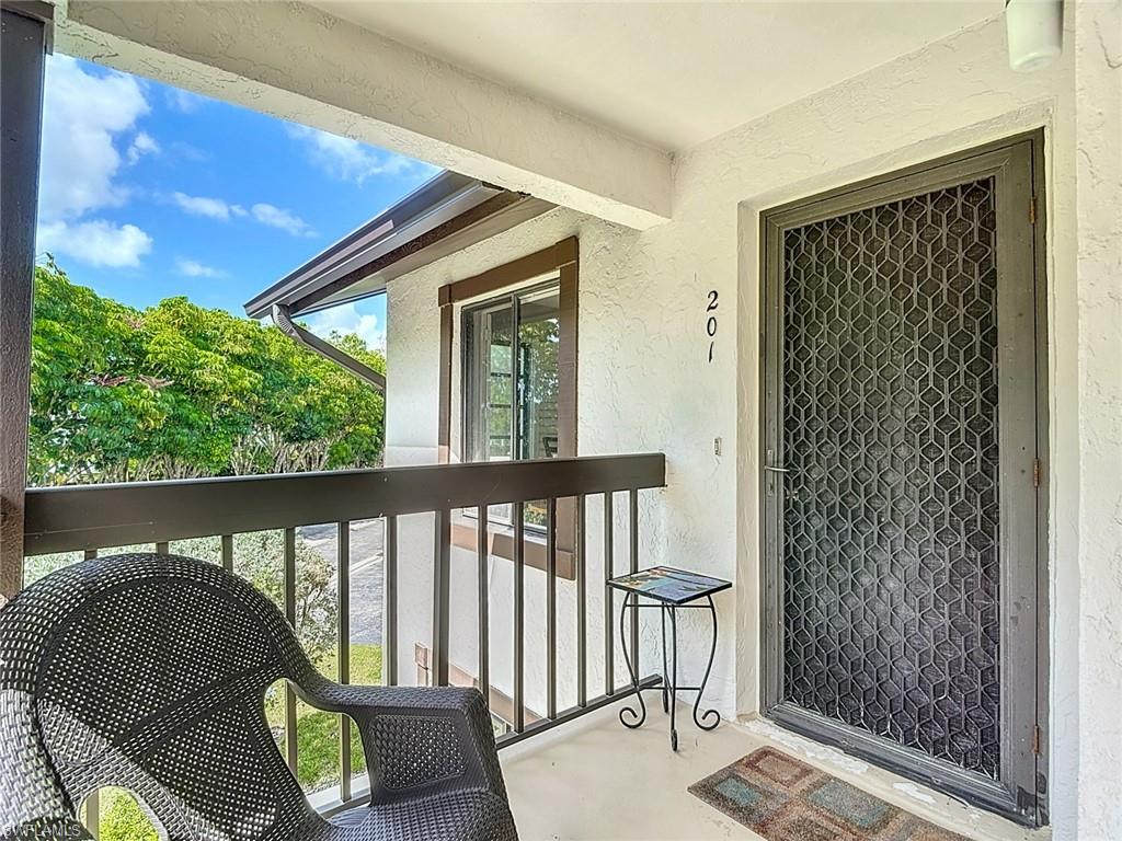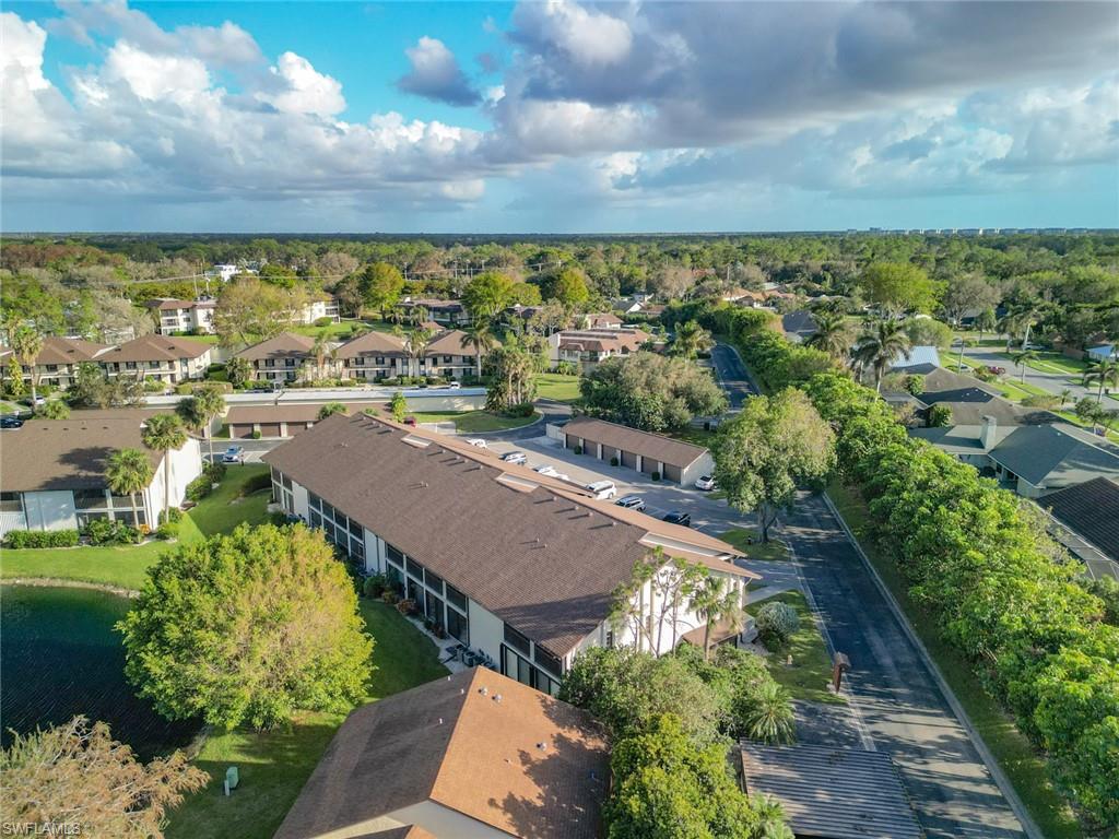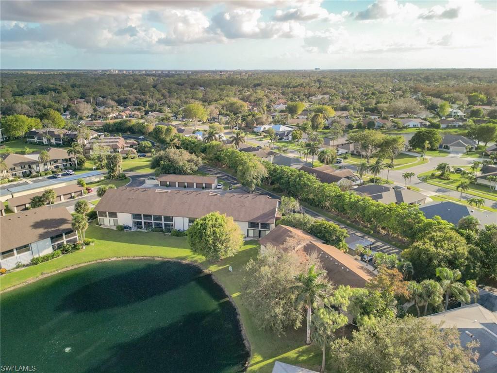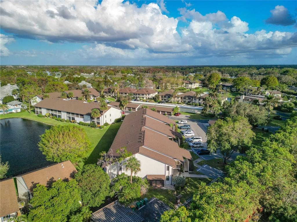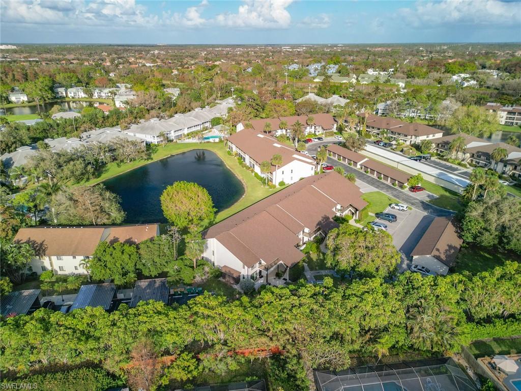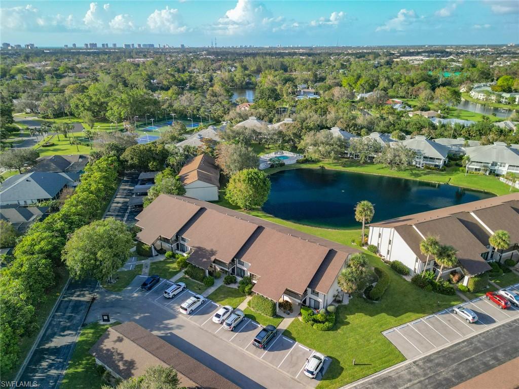 Location, location! 2BD/2BA 2nd floor end unit condo with lake view located in the heart of Central Naples! End units have three more windows than an interior units for additional light. Large, beautifully updated kitchen with granite counters, stainless appliances, eat-in area and lots of storage. Luxury vinyl flooring in entry area and kitchen. Enclosed tiled lanai has sliding glass doors for year round use. There are plantation shutters on the kitchen and living area windows. Extra storage area off of the lanai. New AC in 2024. Front patio area. Nice community with mature landscaping, two pools and tennis courts. Excellent location close to Naples beaches, downtown Naples, and just minutes to a wide variety of shopping, dining and entertainment options.