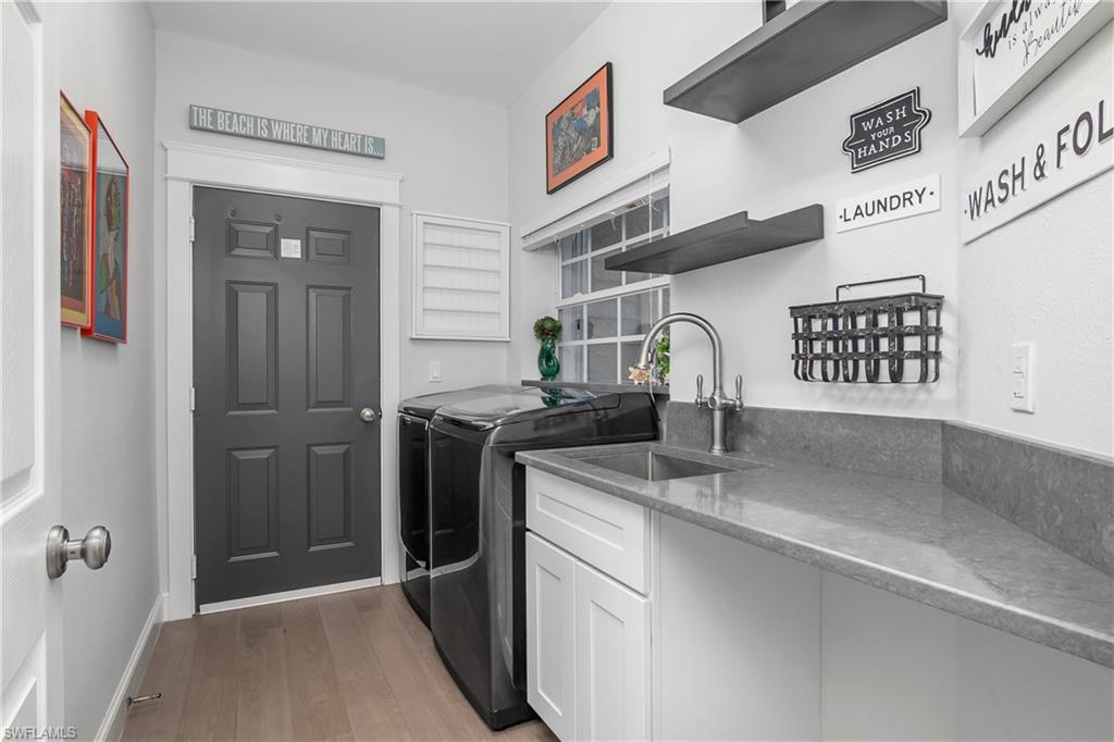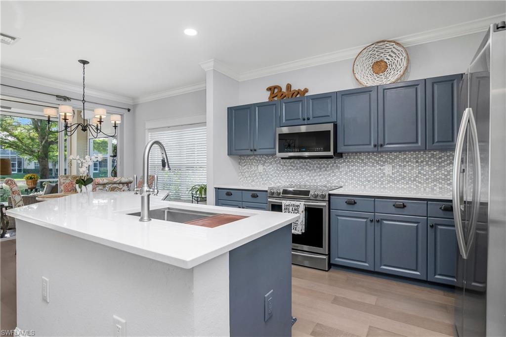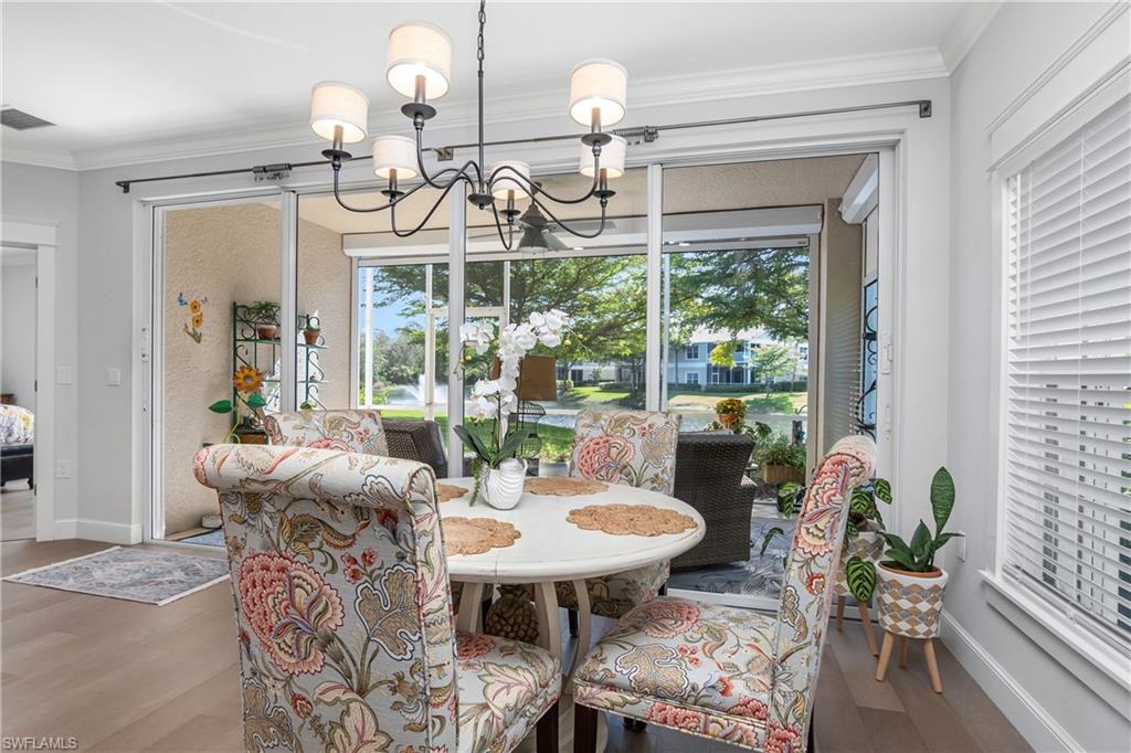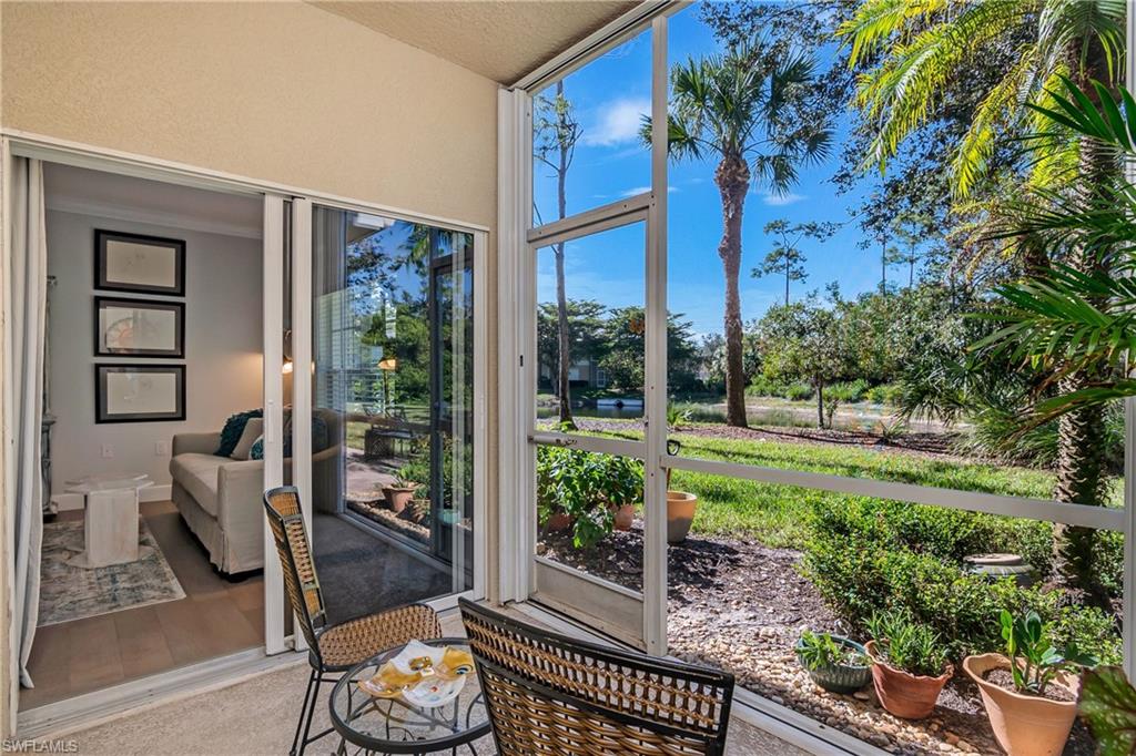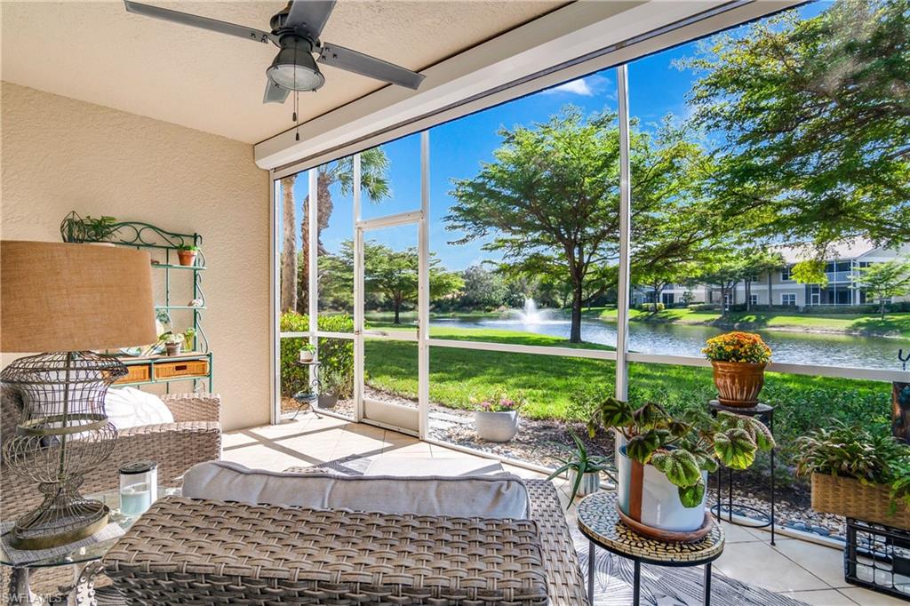 Stunning luxurious corner unit with beautiful lake and fountain views. This bright and open floorplan features Aquaguard walnut luxury vinyl flooring throughout. The expansive lanai is accessible from the main living and dining areas. A beautifully appointed kitchen opens into the living area and features quartz countertops with stainless steel appliances. An additional lanai off of the den offers privacy and lush landscaping, perfect to enjoy quiet moments. The main and guest baths boast a spa like feel. Accordion hurricane shutters were installed on all windows and the smaller lanai in 2022, while electric hurricane shutters were outfitted on the larger lanai. The garage features a new door opener and epoxy floor. In 2023 the guest bathroom was remodeled, and a custom master closet system was installed in 2024. Coming in 2024/25 the HOA will install new coach lighting by the garage and front door. This condo needs no updating and is waiting for you to move in and make memories!