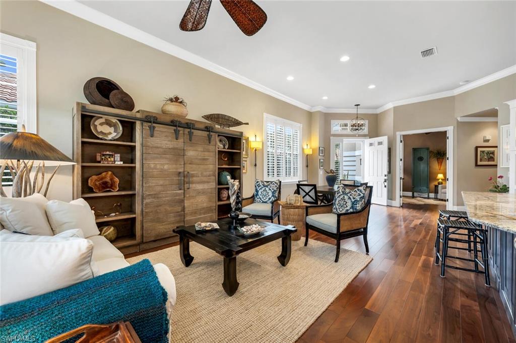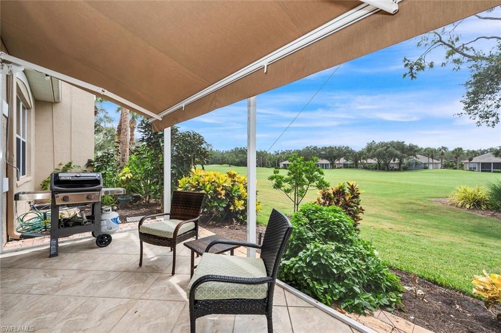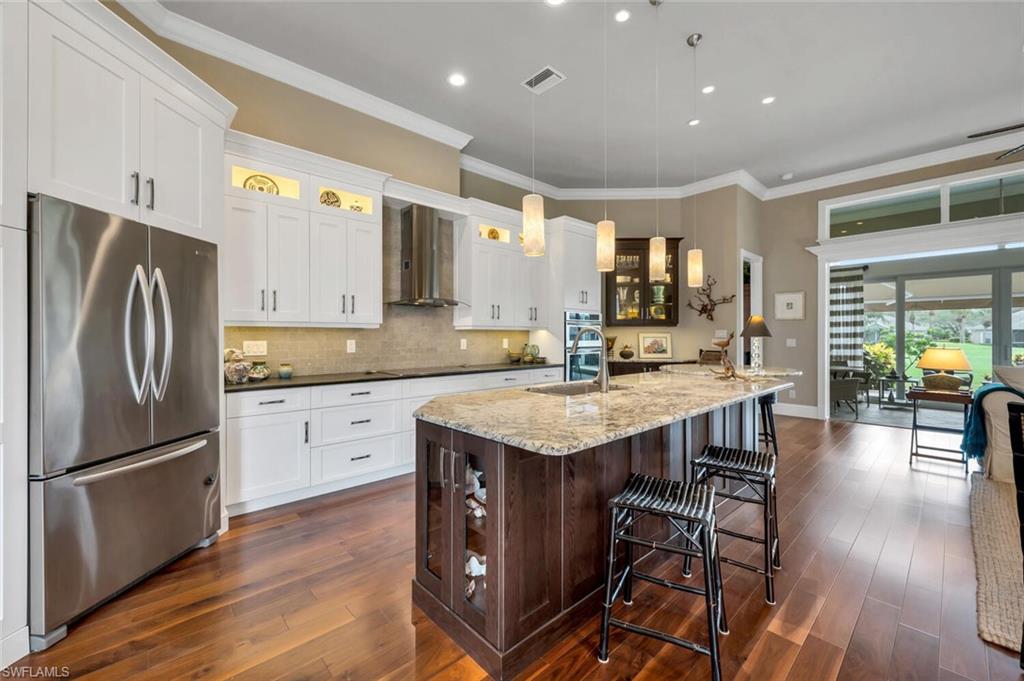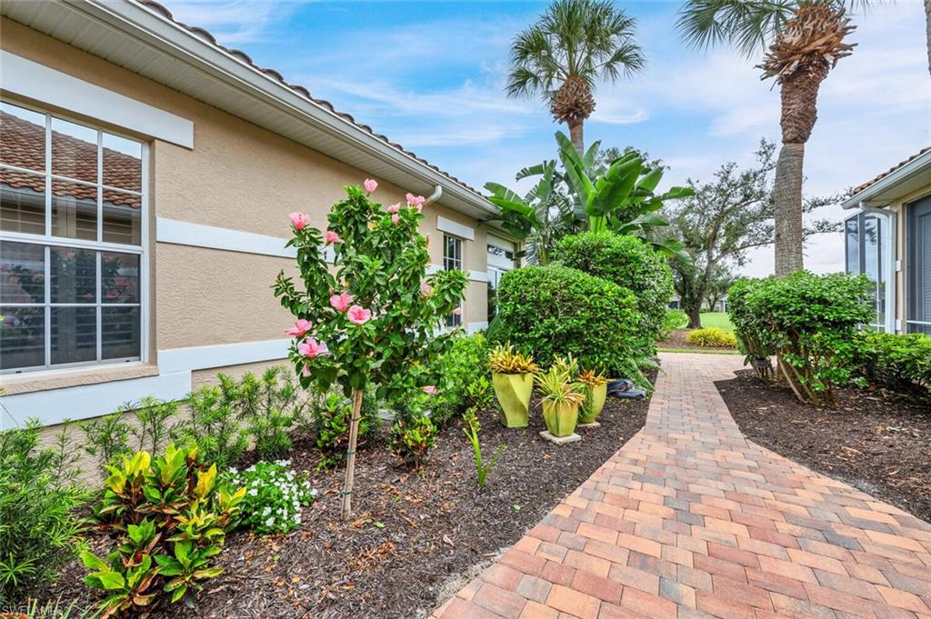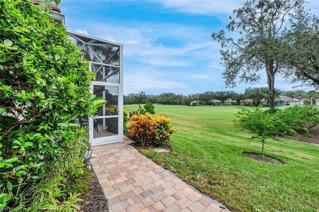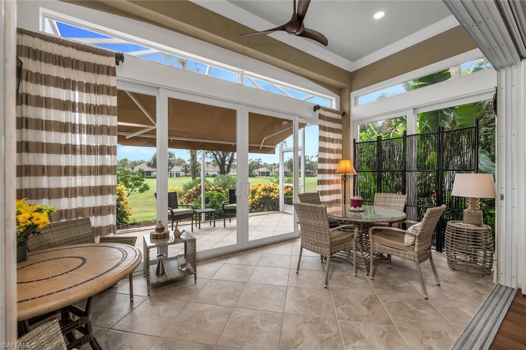 A rare opportunity to own a completely remodeled and reconfigured villa with superior design elements and upgrades. Lanai has been partially enclosed with impact glass, providing extra living area and no road noise! Center wall has been removed and replaced with a large island with seating area and extra cabinetry, providing a true open great room experience, enhanced by 12-foot ceilings. Walnut flooring with moisture barrier in most living areas, travertine tile in bathrooms, ceramic tile in laundry, and back hallway. Upgraded lighting, crown molding and baseboards, appliances, outdoor landscaping and paved walkways. See a complete list of upgrades and inclusions attached. Glassed in lanai area included in living area square footage. Pelican Landing has a robust array of amenities included in the annual dues--Competitive tennis & pickleball, kayaking, sailing, complete fitness facility with bocce courts. Private boat shuttle to Pelican Landing Beach Park on the Gulf of Mexico.