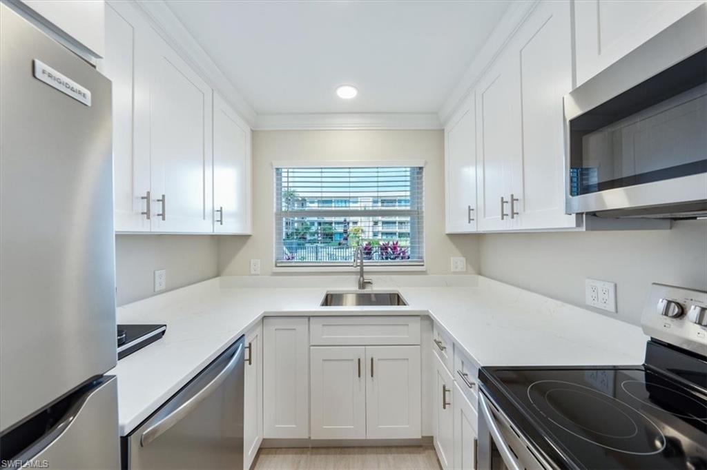 Welcome to this stunning, FULLY REMODELED two-bedroom, two-bath condo in the prestigious Coquina Club of Naples, where luxury and tranquility blend seamlessly with waterfront living. Nestled along the bay, this meticulously updated retreat offers the perfect combination of style and comfort. The BRAND-NEW kitchen showcases white shaker cabinets, quartz countertops, and state-of-the-art appliances, all complemented by upgraded tile flooring throughout. Both bathrooms have been elegantly redesigned with high-end finishes, adding a refined touch of sophistication. The bright and airy living space is designed for relaxation, with natural light streaming in and a seamless connection to the beauty of the bayfront setting. Step outside and immerse yourself in the exclusive amenities of Coquina Club, including boat slips and kayak racks for lease, a saltwater pool overlooking the bay, a scenic grilling area, a clubhouse, and an on-site manager. Additional perks such as shower facilities, extra storage, and a designated covered parking space ensure effortless coastal living. Perfectly situated on the bay, this exquisite condo is just a short stroll from Naples’ white-sand beaches, upscale dining and shopping at Venetian Village, Waterside Shops, and a variety of entertainment options. Whether you seek relaxation or an active coastal lifestyle, this residence offers the perfect blend of luxury, convenience, and the best of Naples’ waterfront living.